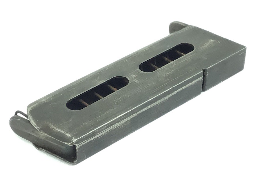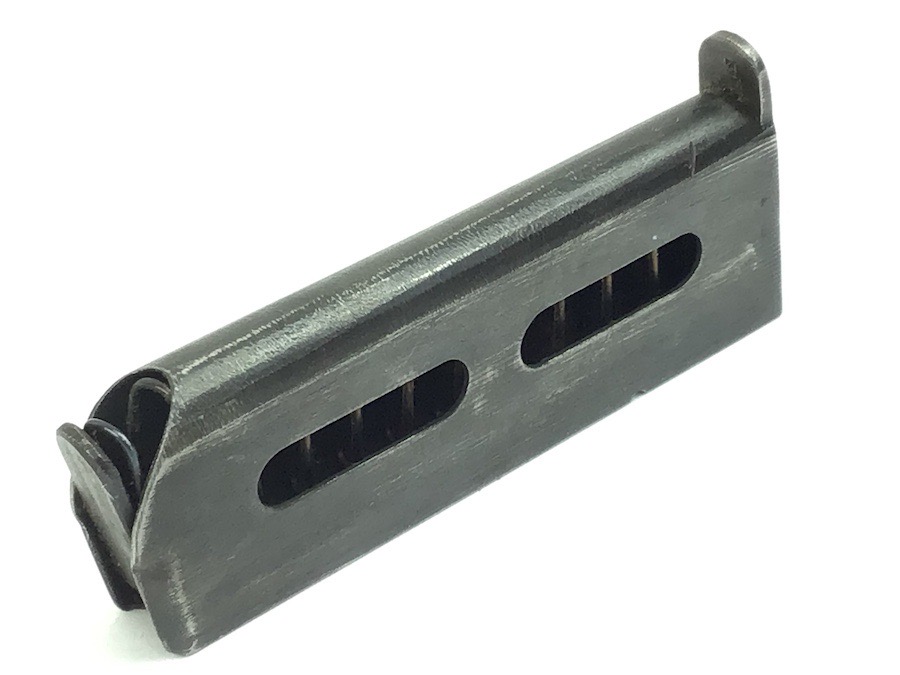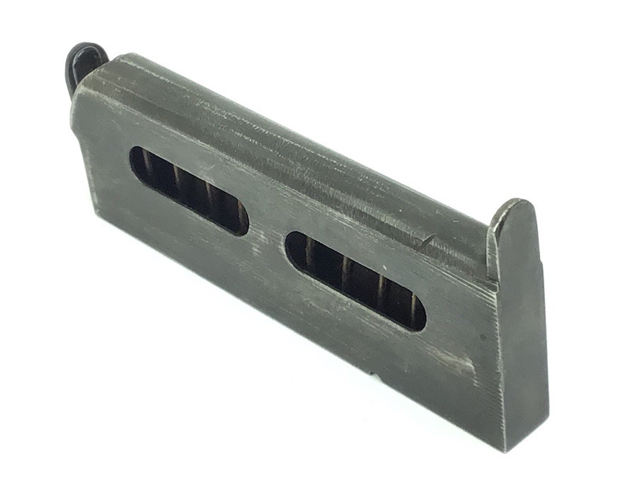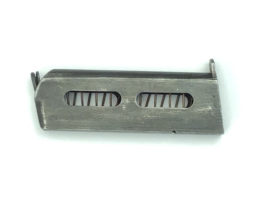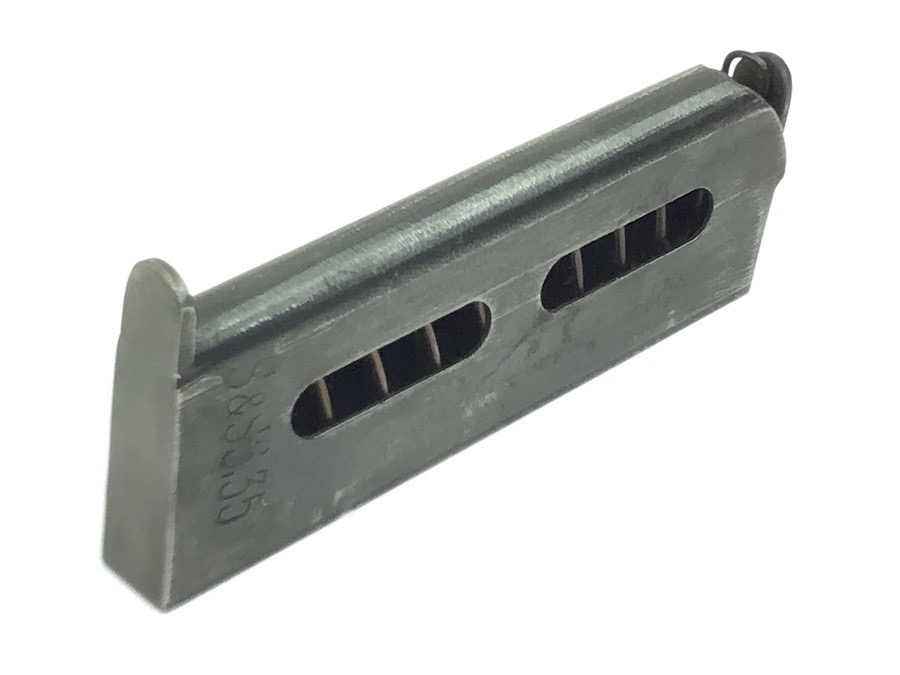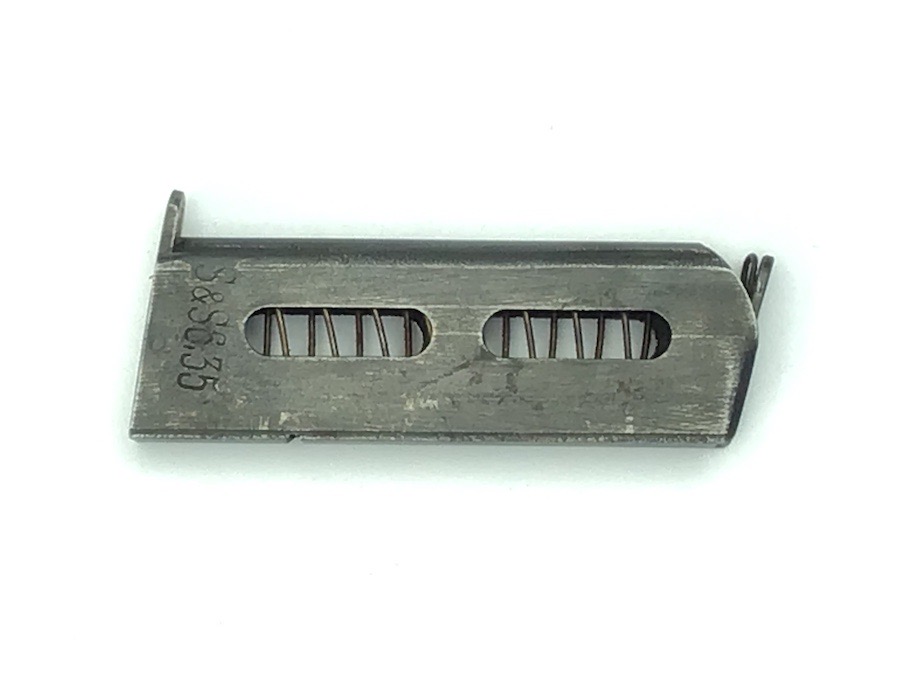 3/10/23 – Original and great condition. Rare variation, 6.35mm Sauer Model 1913 magazine. The left side of the magazine is stamped S&S 6.35. Minor use wear. The spring is excellent and fully functional.