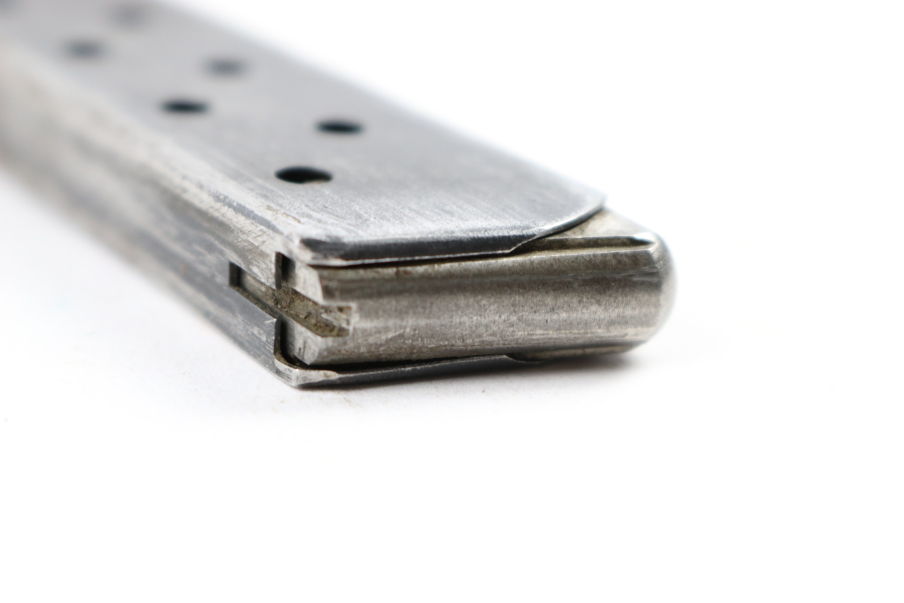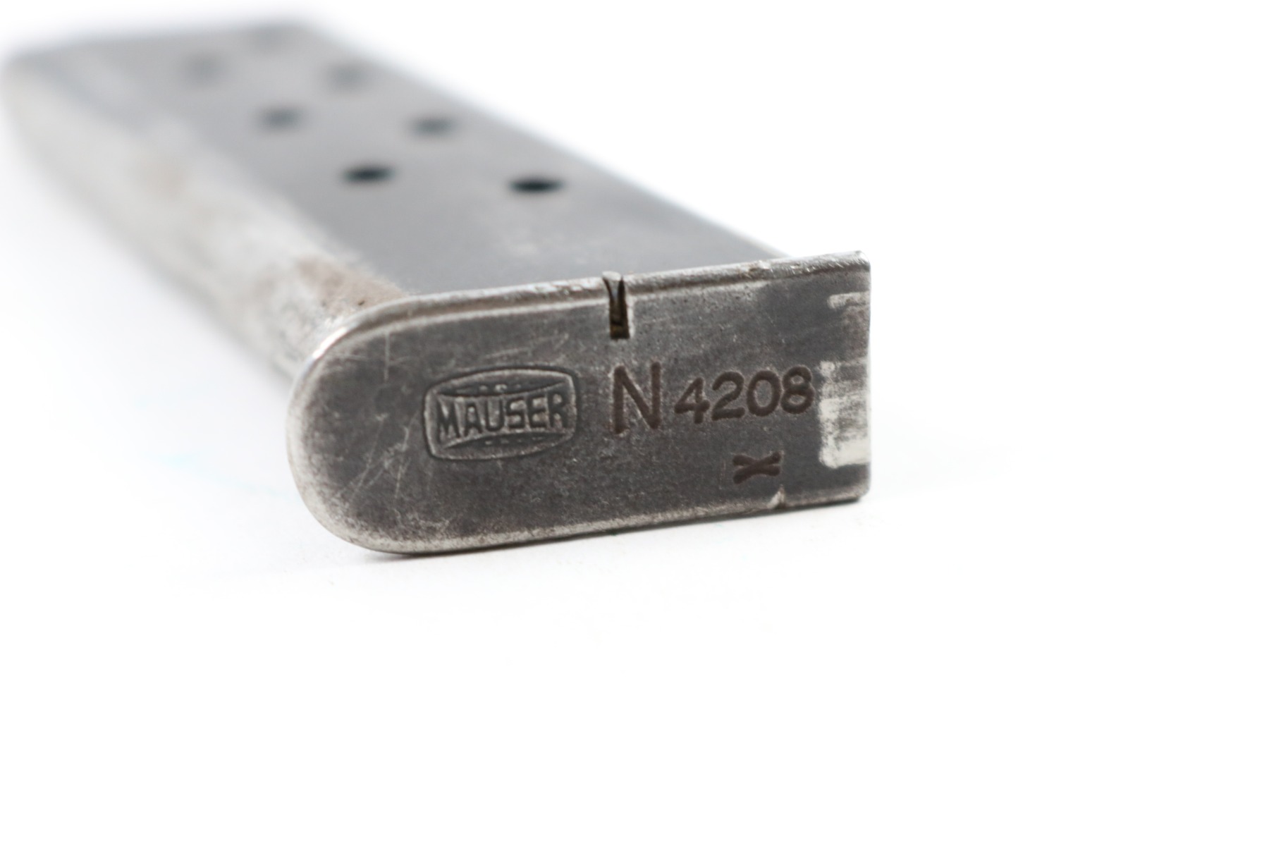 5/23/18 – This is an original Navy stamped Mauser model 1934 magazine from WW2. The base of the magazine has a Kriegsmarine Nordsea designation stamp. The frame has light surface wear and some bluing loss, but overall in great shape and fully functional.