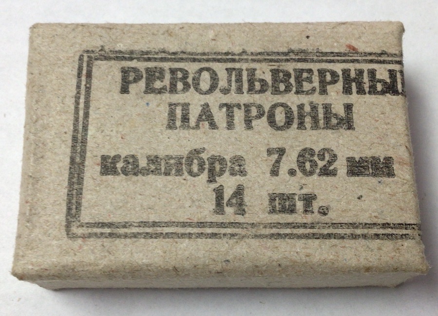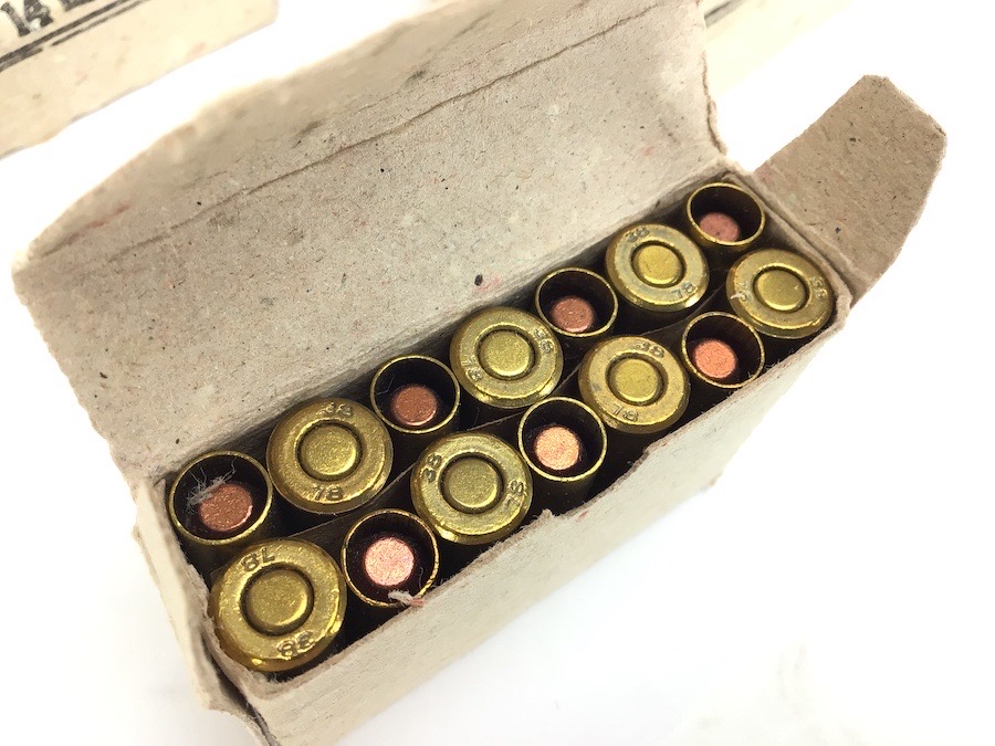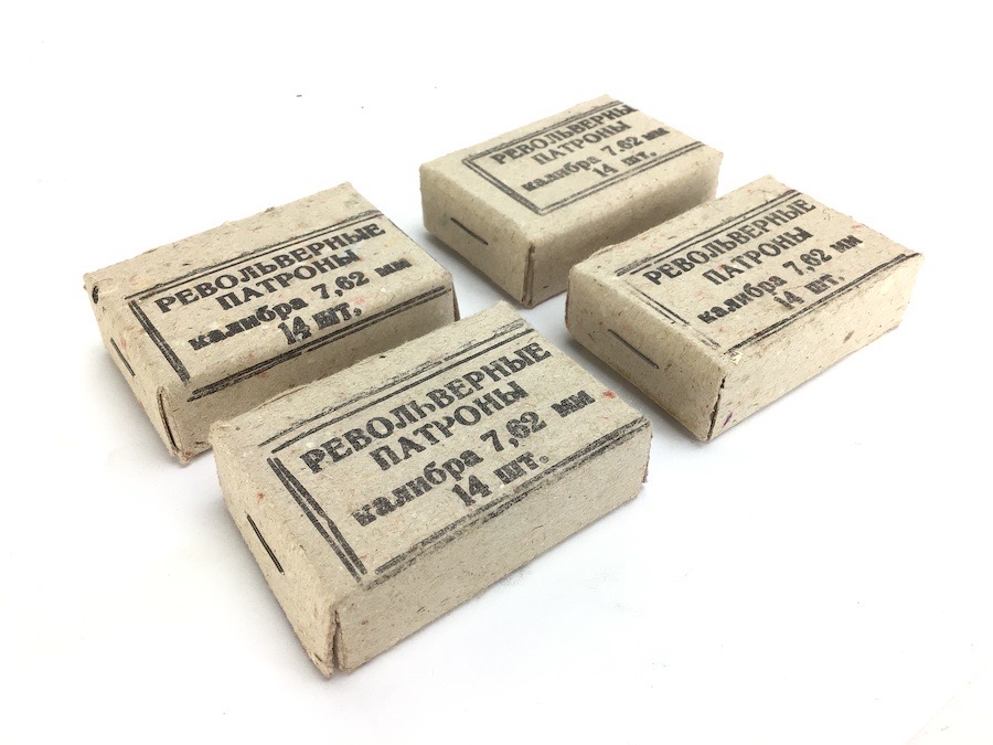 3/6/24 – Multiple boxes available. Price per box. Excellent condition boxes of 7.62x38mmR, Nagant revolver ammo. All boxes show little to no wear with great, legible graphics. Each box contains 14, pristine rounds.