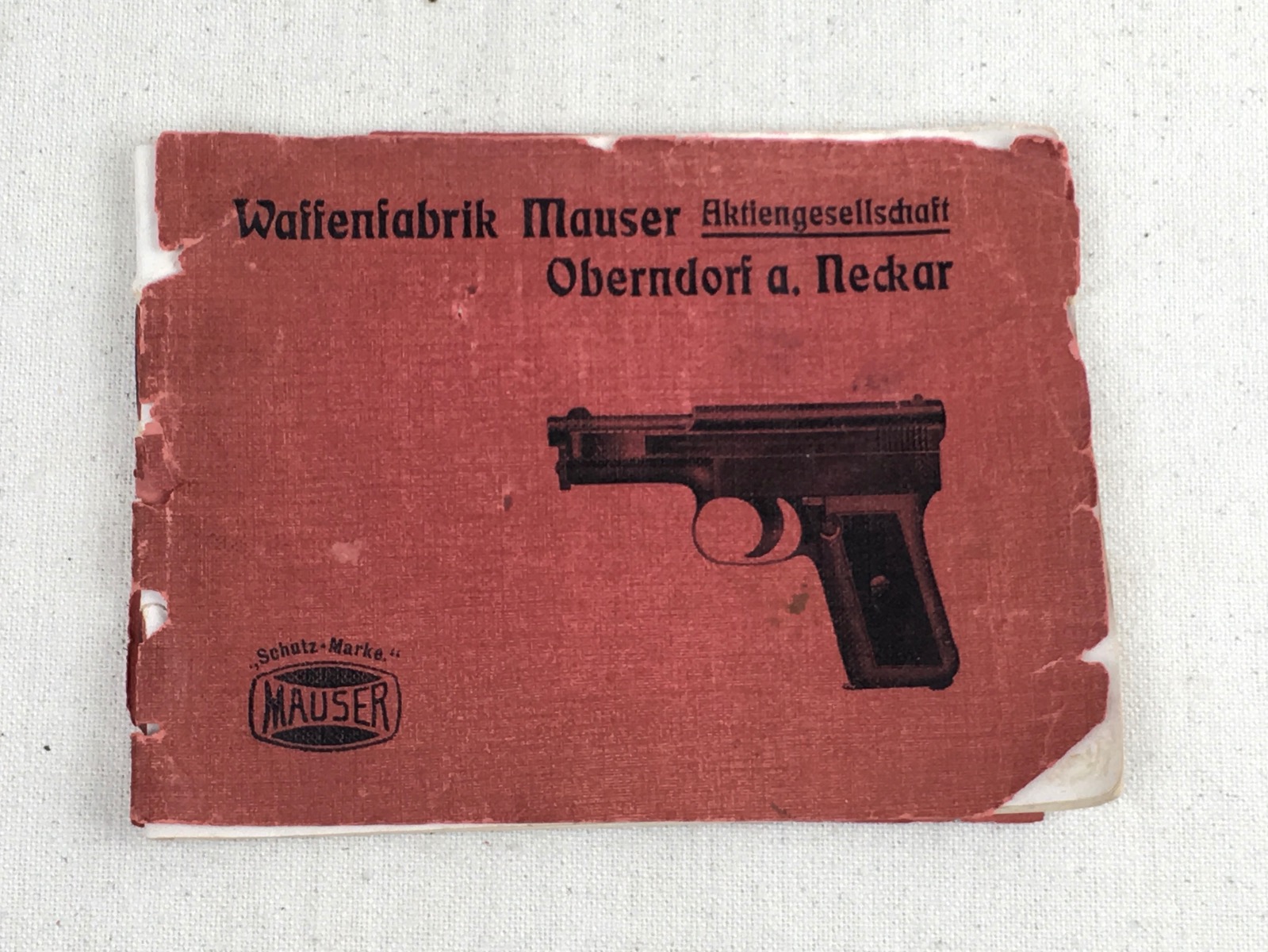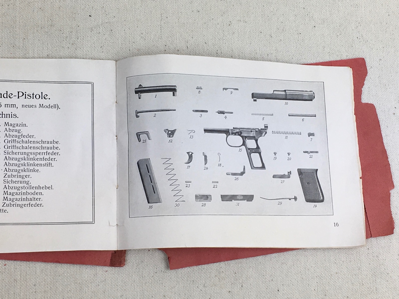 3/20/18 – Original Mauser Model 1914 Pistol Manual. This is an authentic 5-1/2″ x 4″ manual covering the Mauser Model 1914 pistol. 20 pages of text and illustrations, in original German. Stapled binding is intact and all pages are in place. However, the cover is in poor condition and is not attached to the pages. The cover is fragile. However, the manual pages are in good condition. No pages are missing and the illustrations are crisp. No torn or folded pages. This item will complement your collector pistol or a nice addition to your manual collection.