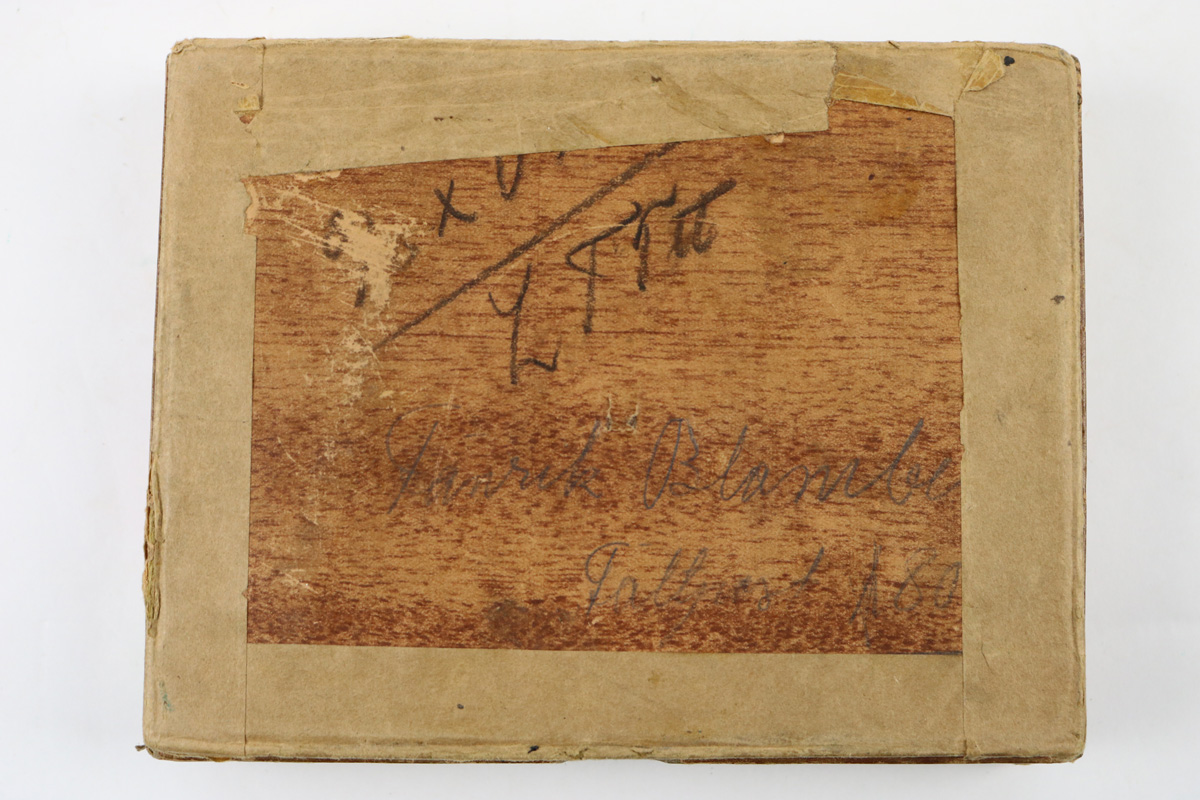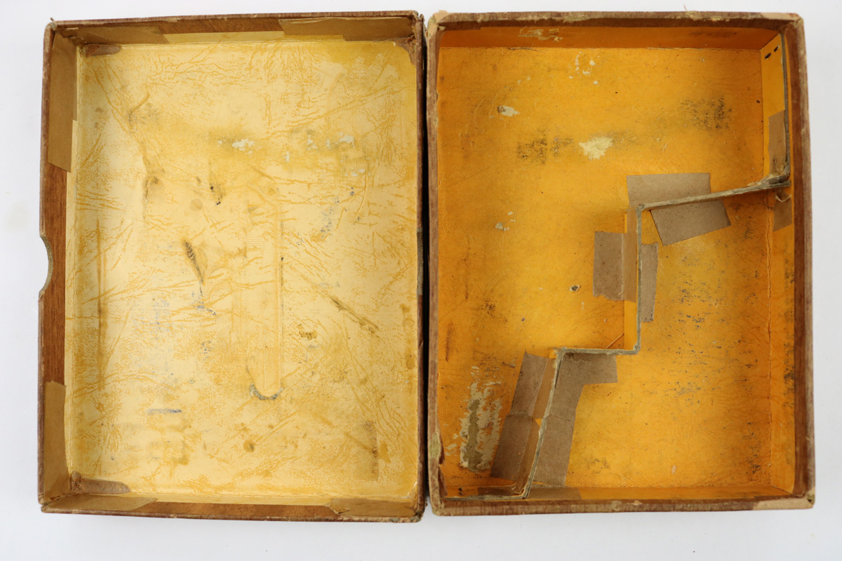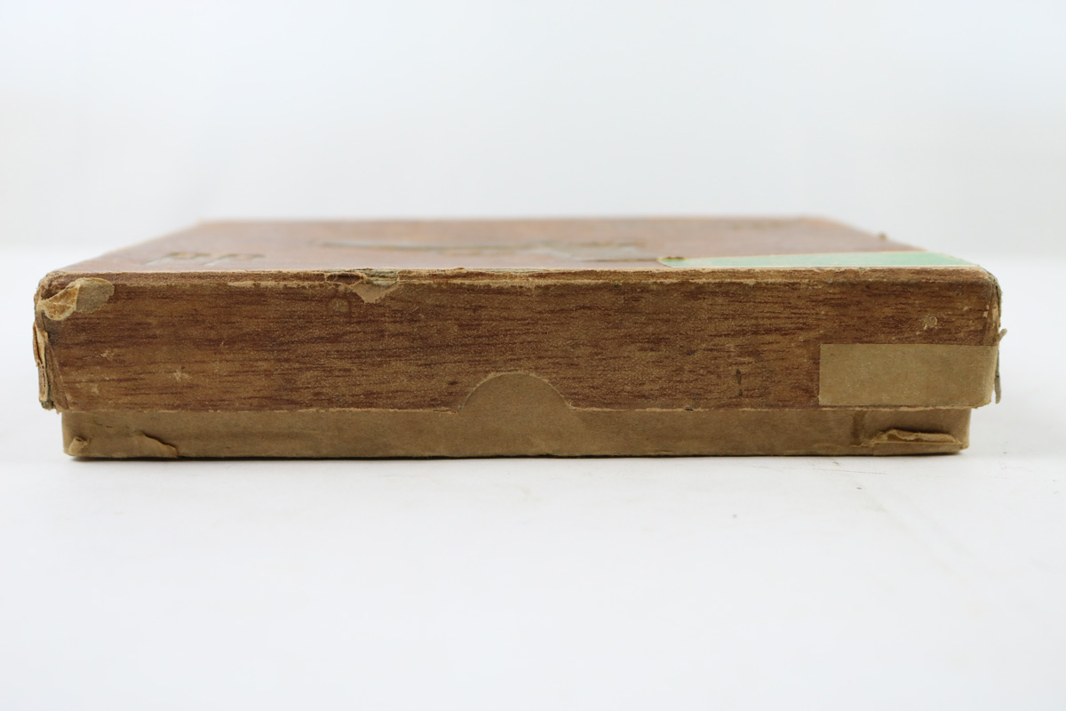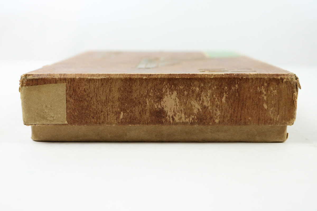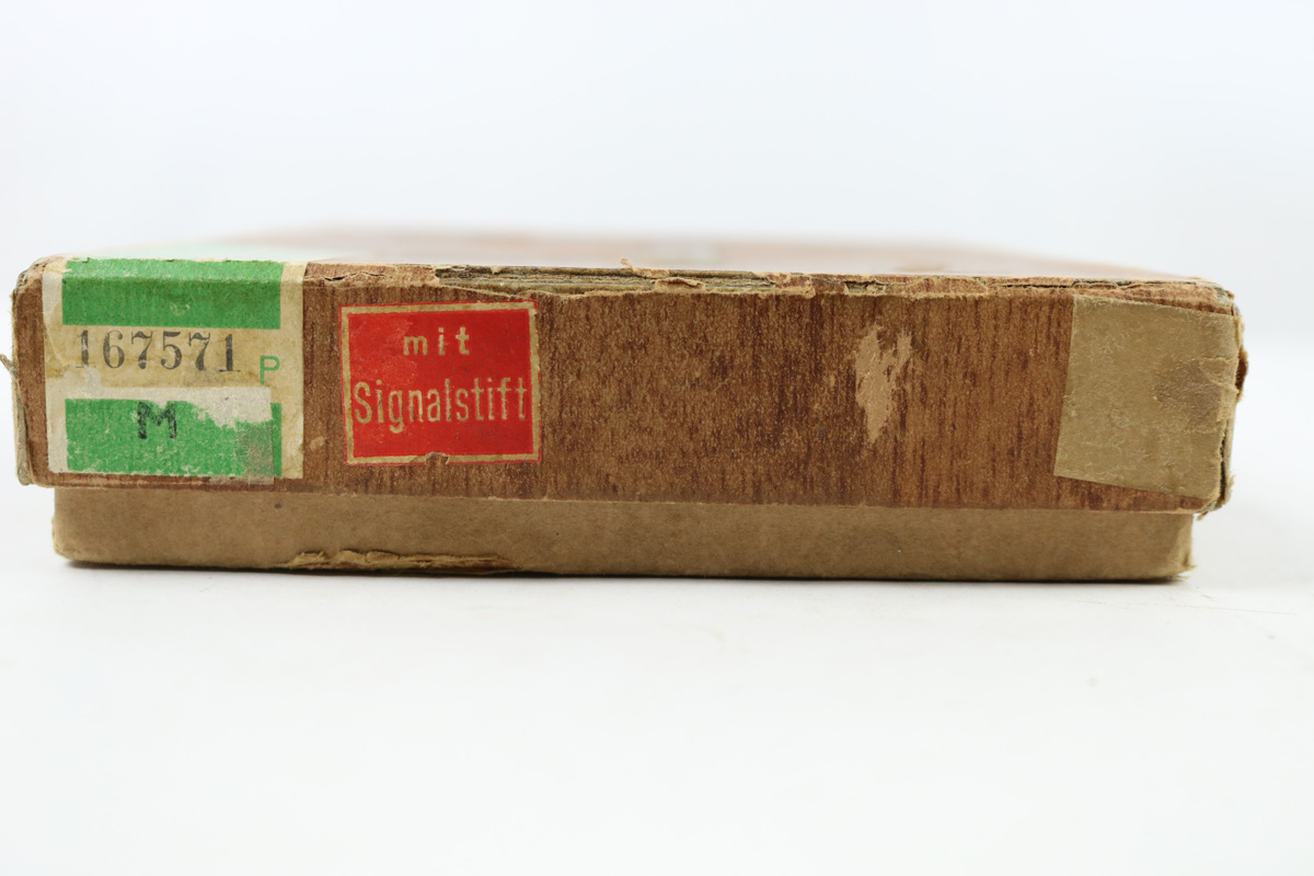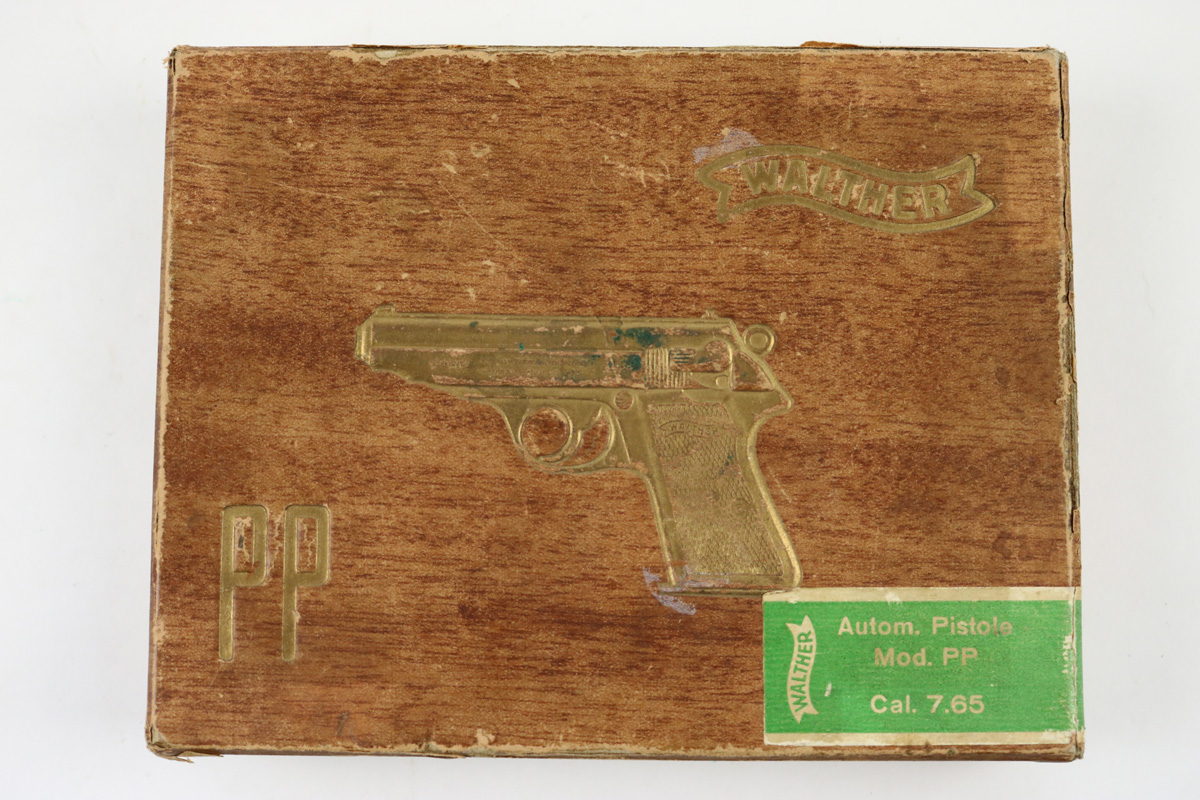 10/1/18 – This is a WW2 original (1930s-40s) Walther PP box. The box has the original labels from the factory, and shows serial number 167571p as the original gun that was issued with this box. The box is completely in tact, but has been taped as shown in photos. The tape appears old and used to reinforce edges of the base. The box overall has normal light edge / surface wear but no major issues and structurally excellent. Guaranteed original.