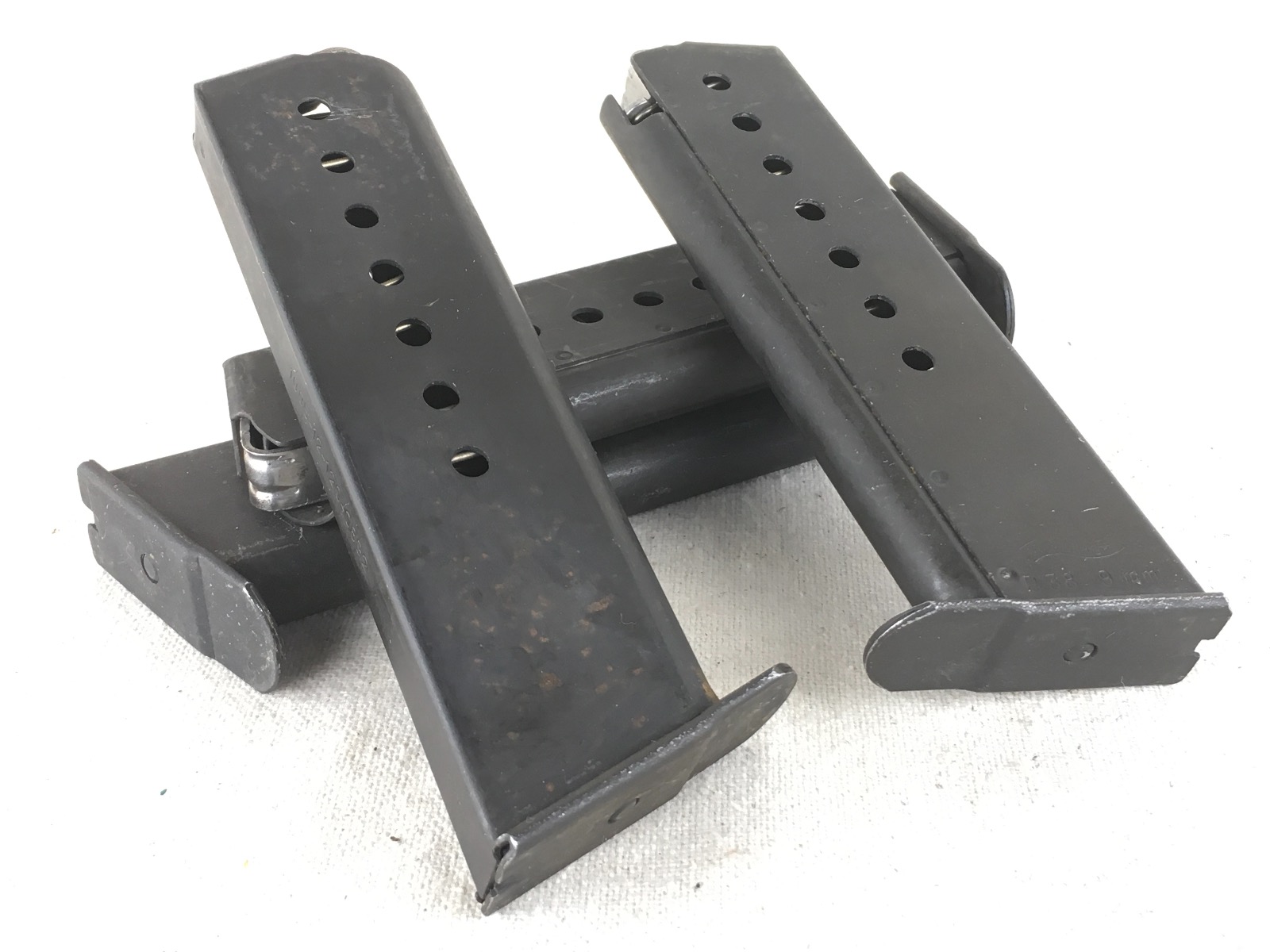 3/22/18 – Price is for one magazine. Walther made, German army surplus P.38, 8rd magazine.  Conditions range from very good to excellent. These may have some slight use wear.  The magazines are stamped “P38 9mm” under the Walther banner. Some spines are stamped with the Walther part number along with the date of manufacture others are blank on the spine. Dates range from 1958 to 1963. Top of the spine may be stamped with an “844” post war proof mark. Double ridged follower. Strong functional springs.