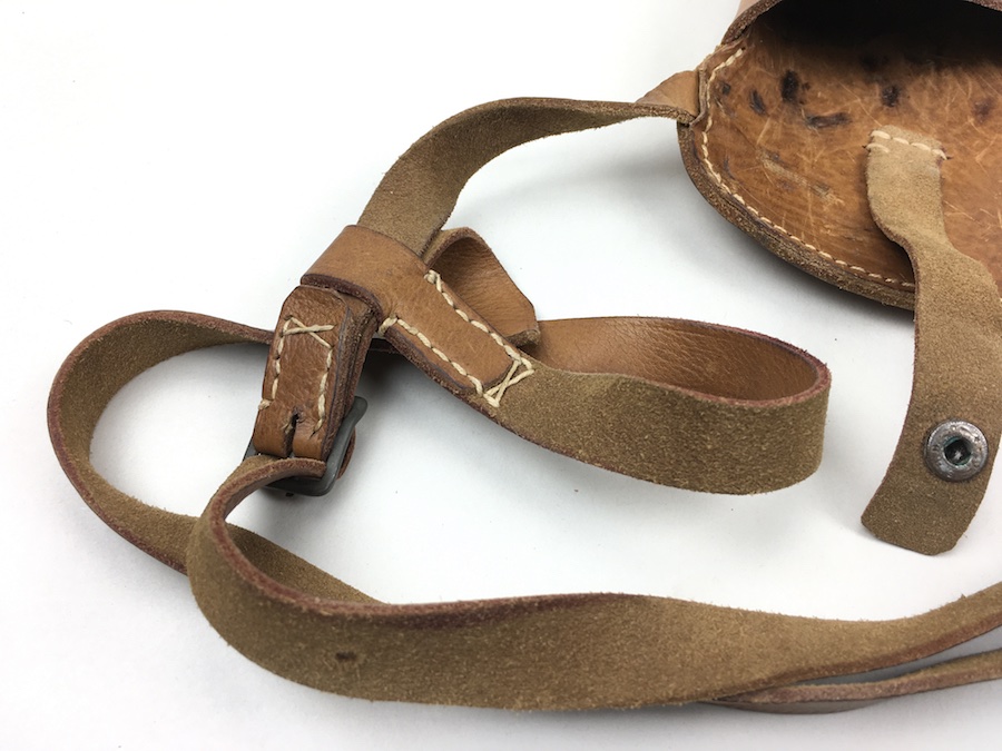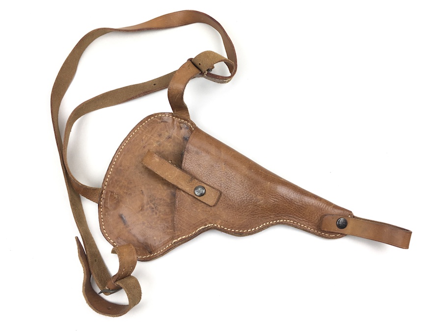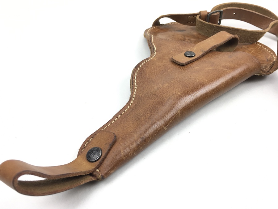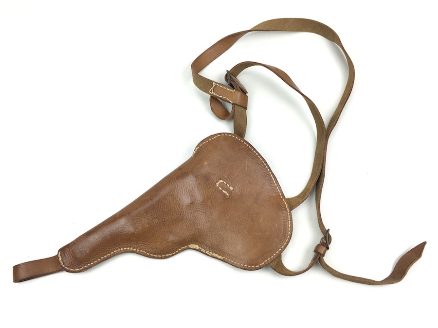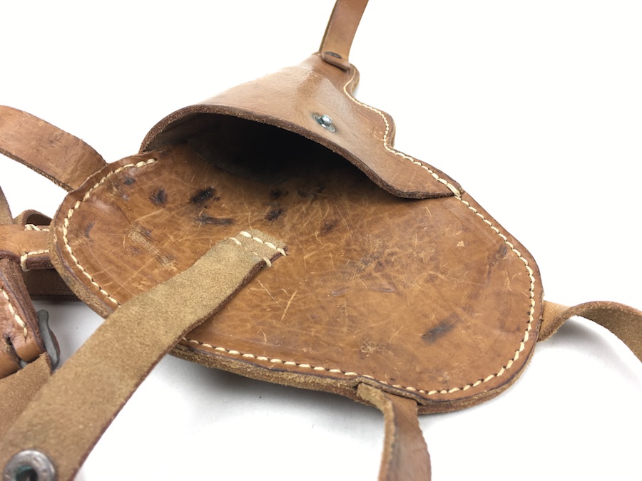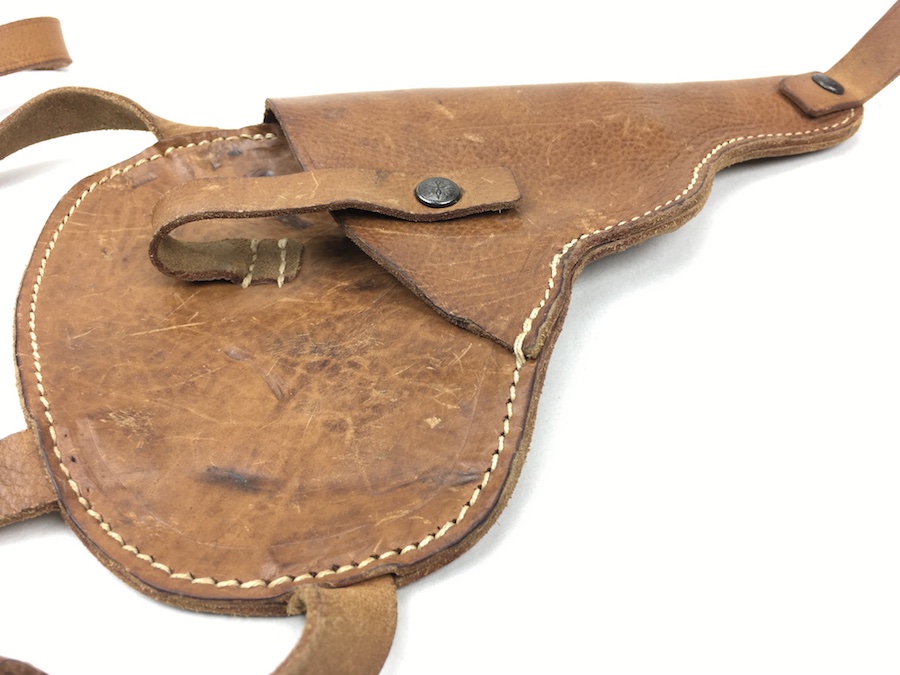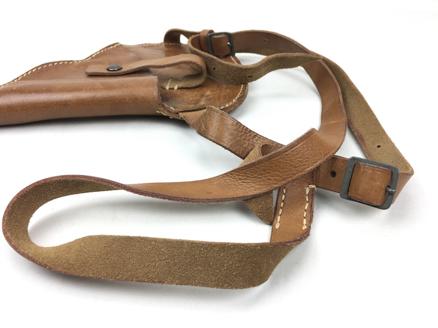 8/14/19 – This is an unmarked and undated leather shoulder holster. A P.38 fits very nicely. It can be used for other similar sized pistols. Possible late WWII or immediately post war. Stitching is intact. Buckle and straps are secure. Minimal wear.