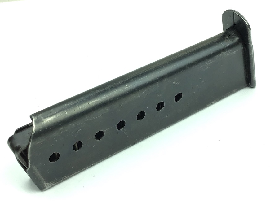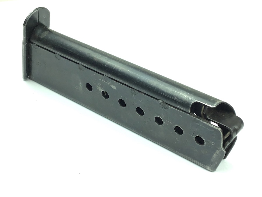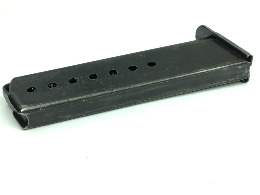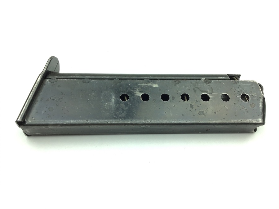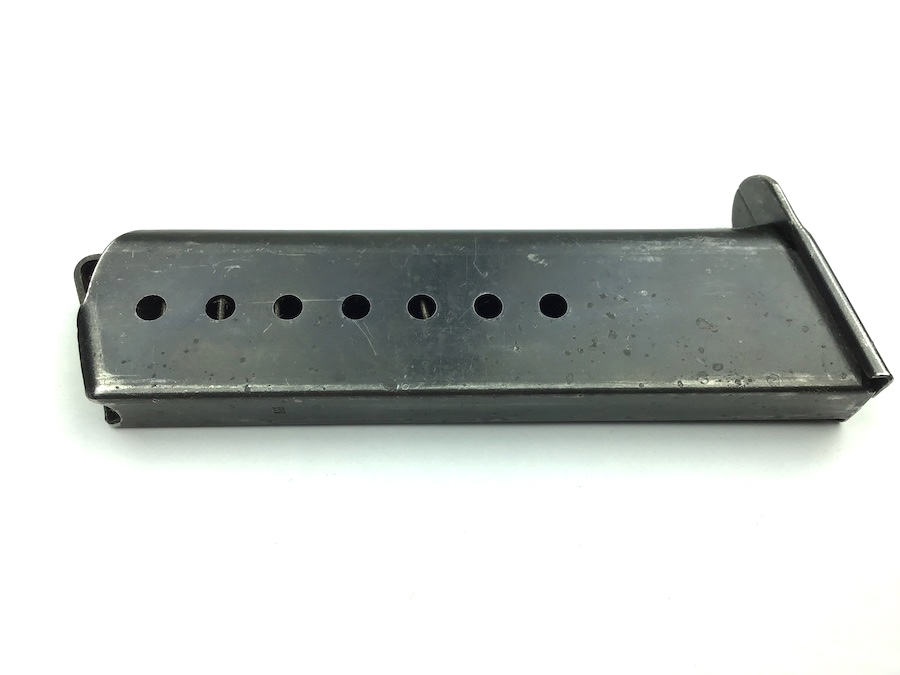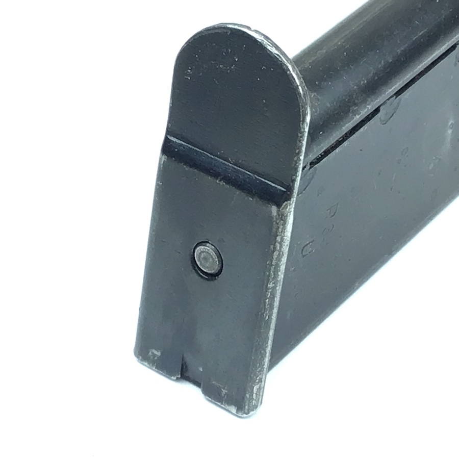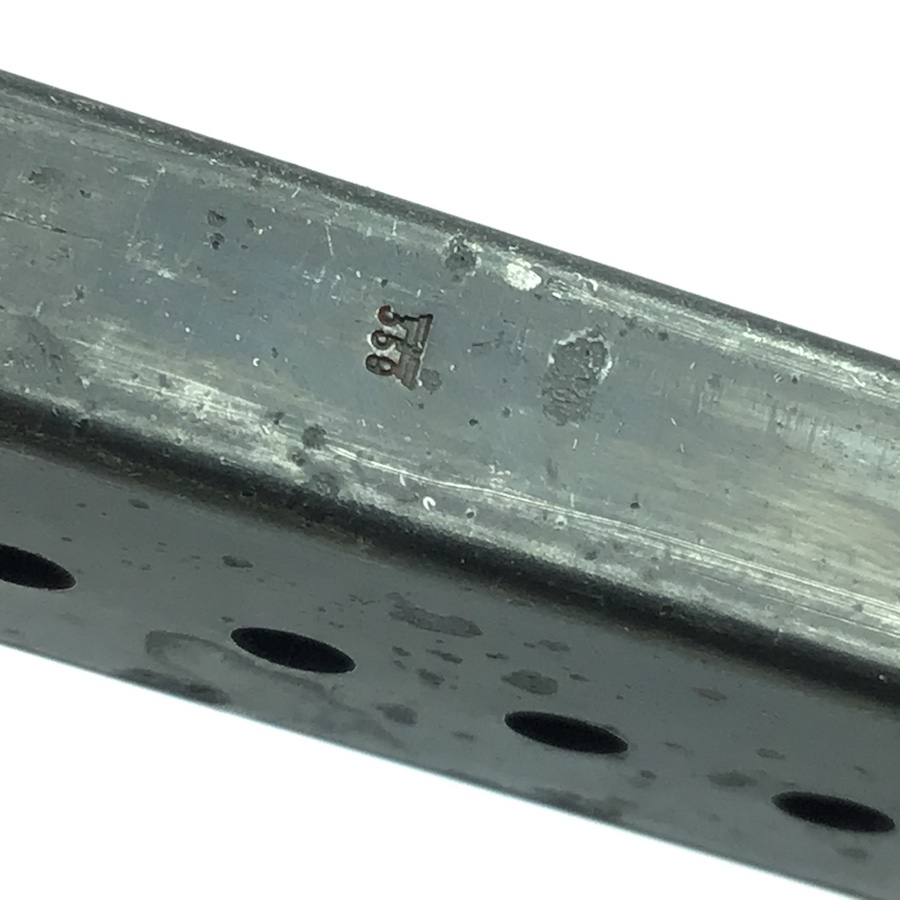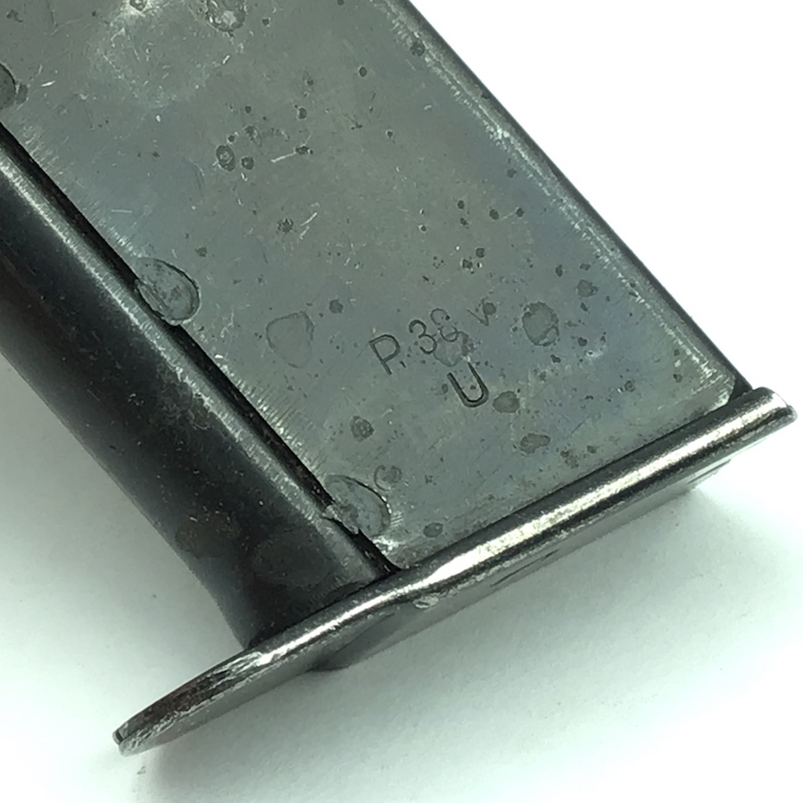 7/9/20 – This is a late war P.38 magazine used mainly with AC 44 / 45 pistols. Stamped on the left side with P.38 and a “U” underneath. Meaning unhardened during late war production. Stamped on the spine with an eagle 359 proof stamp. Strong smooth spring. Minimal overall wear.