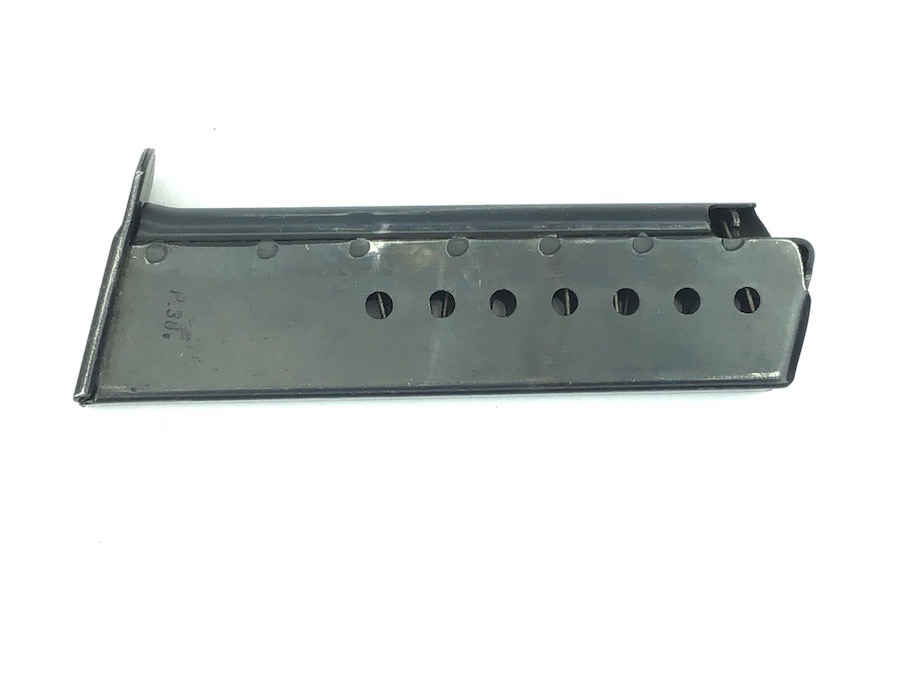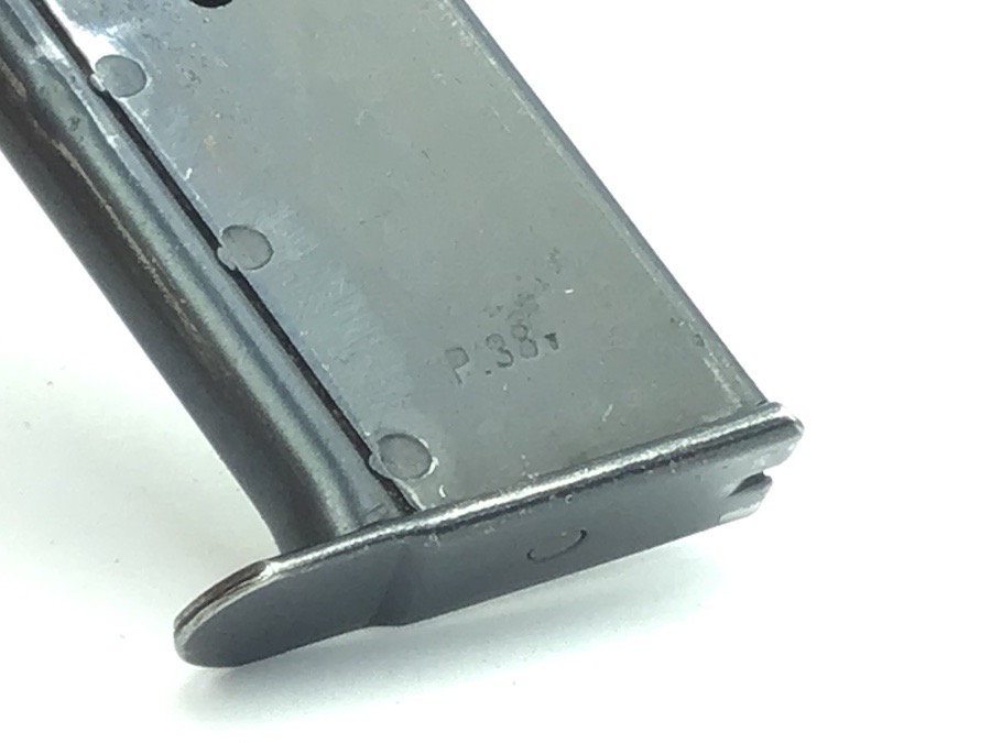 5/25/23 – This original magazine was produced by Walther and is stamped with P.38v on the left side of the housing. No other markings. No Walther acceptance stamp E/359 is found on the spine, because this magazine was issued with commercial P.38 / Mod. HP pistols that were produced between February 1943 and November 1944.