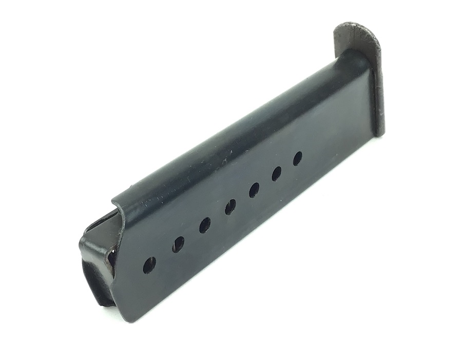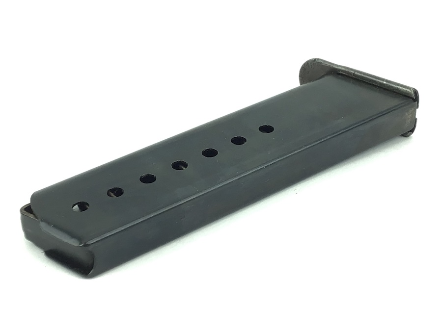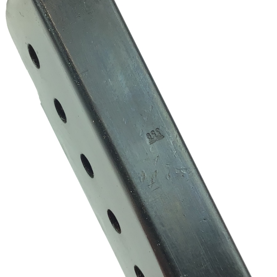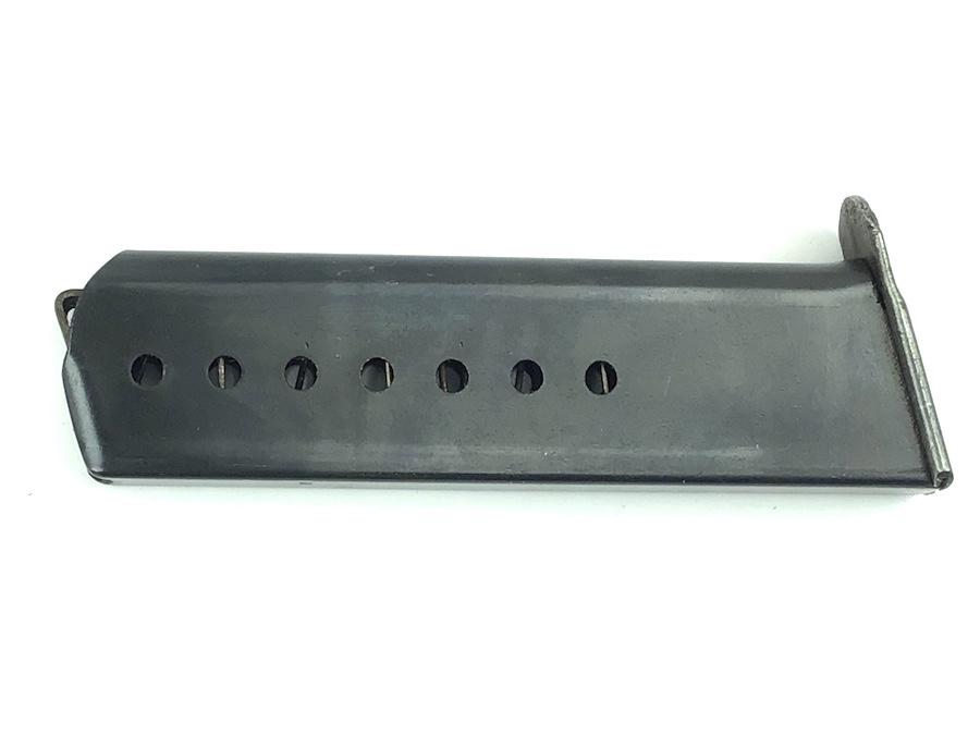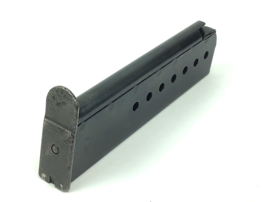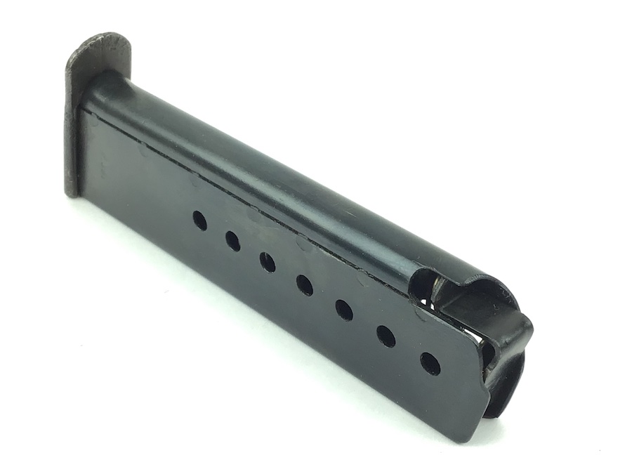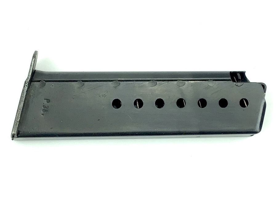 5/11/21 – This is an original WW2 variation P.38 magazine. The left side of the frame is stamped “P.38v”. The spine is stamped with “E/359” upside down near the top. The spring is excellent and fully functional. The original blued finish has minimal wear. Minor pitting on the bottom of the base.