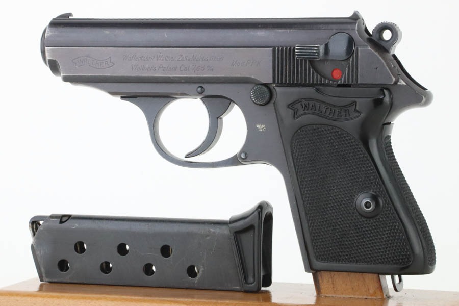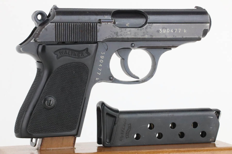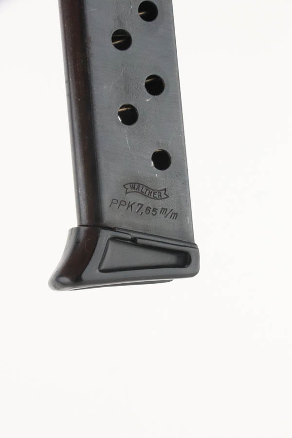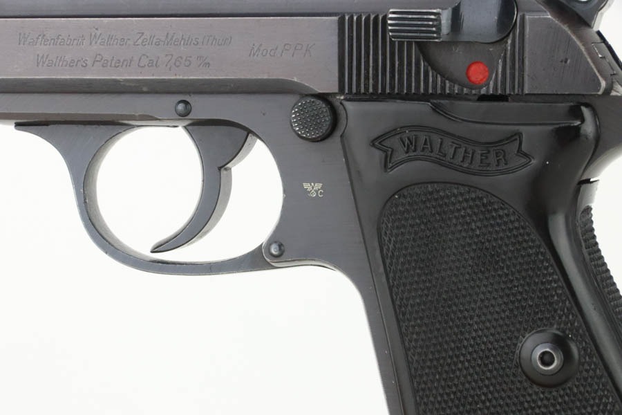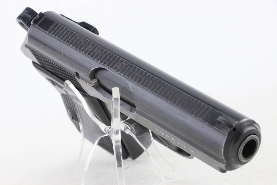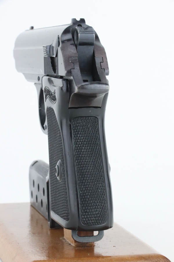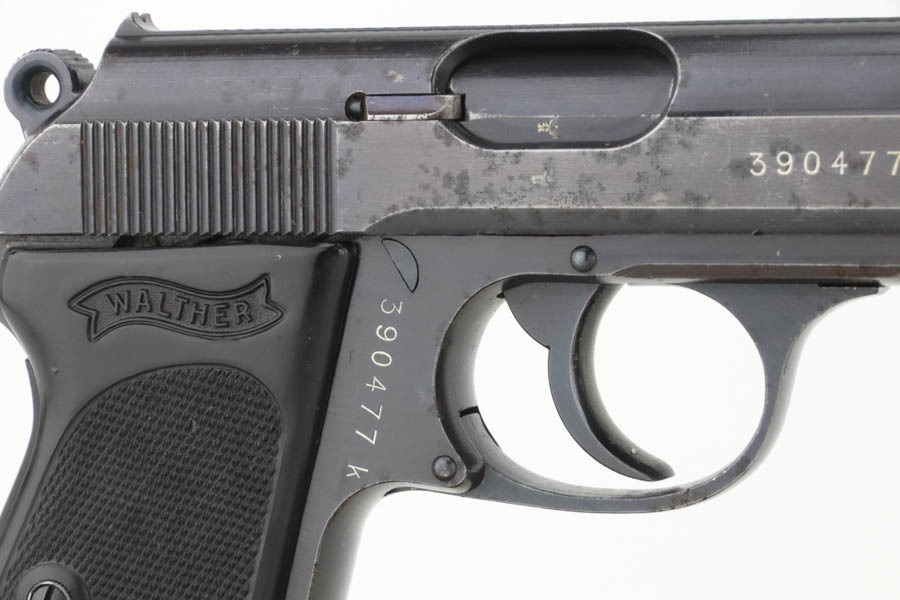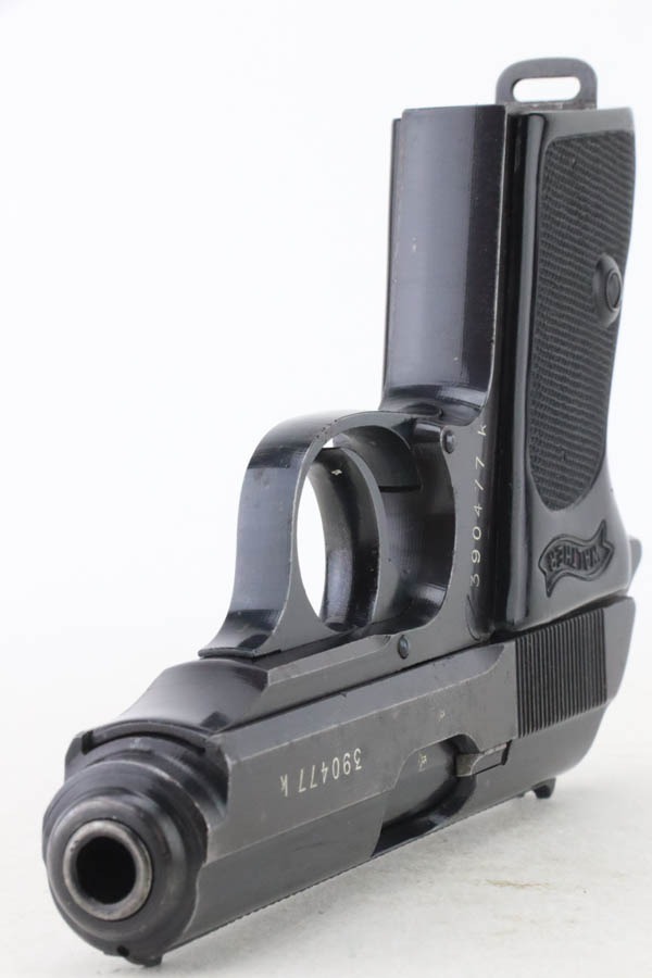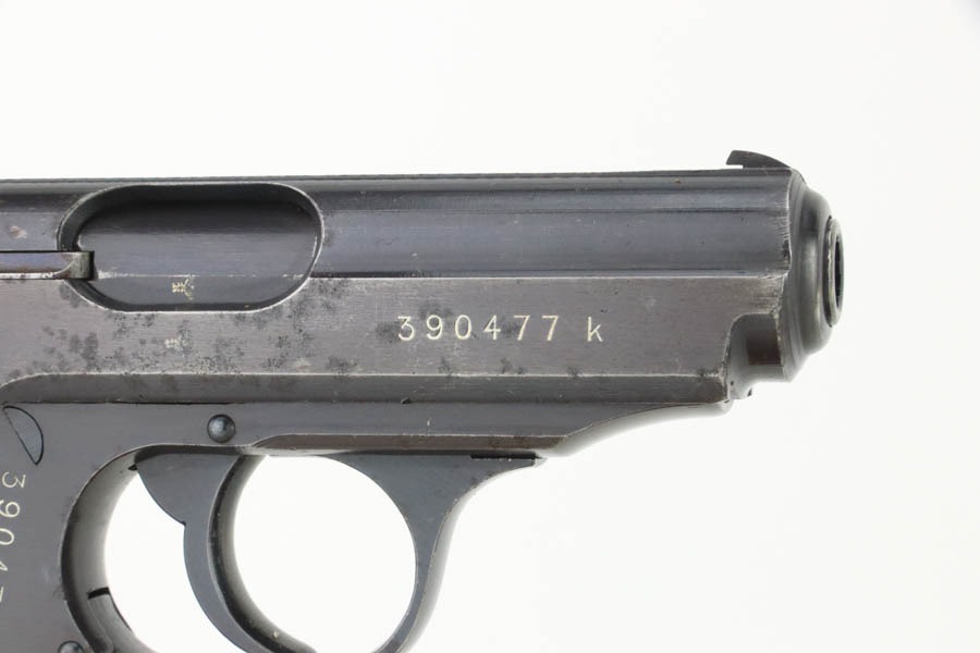 11/5/24 – This is a very nice example of a Walther PPK issued to the Nazi police force in 1943. All matching with a police “Eagle C” marking on the left side of the frame. This one is also fitted with a nice black grip. The gun has retained about 997% of its original finish. While there is very little actual finish loss, there is freckling with tiny pitting on the right side of the slide. Comes with a proper wartime finger extension magazine. Mint bore.