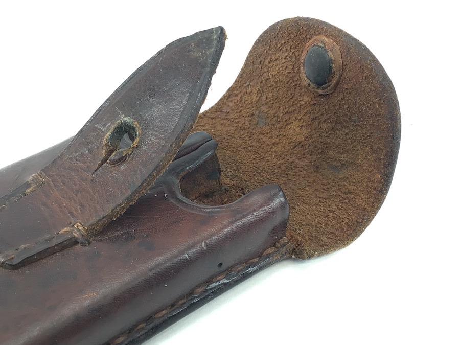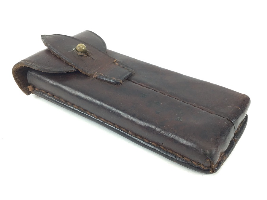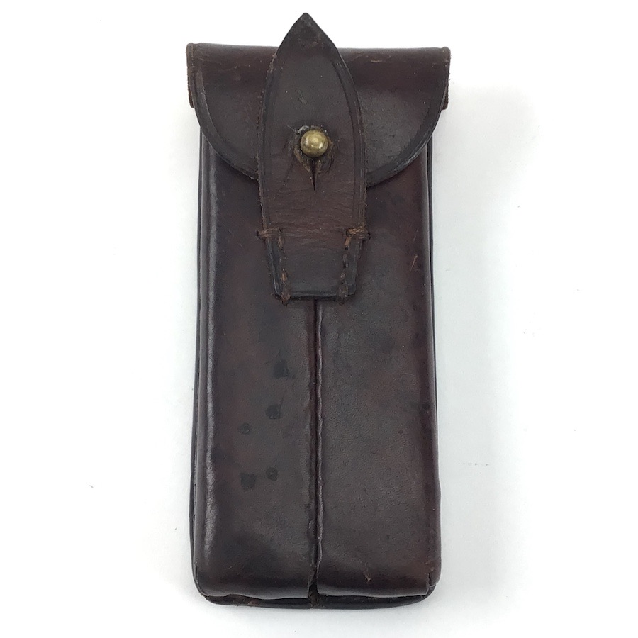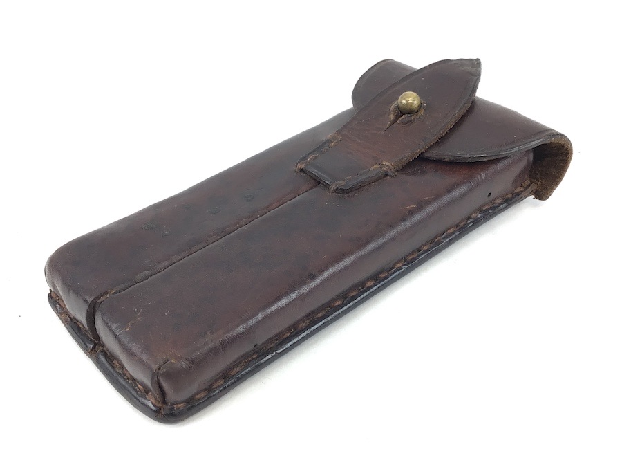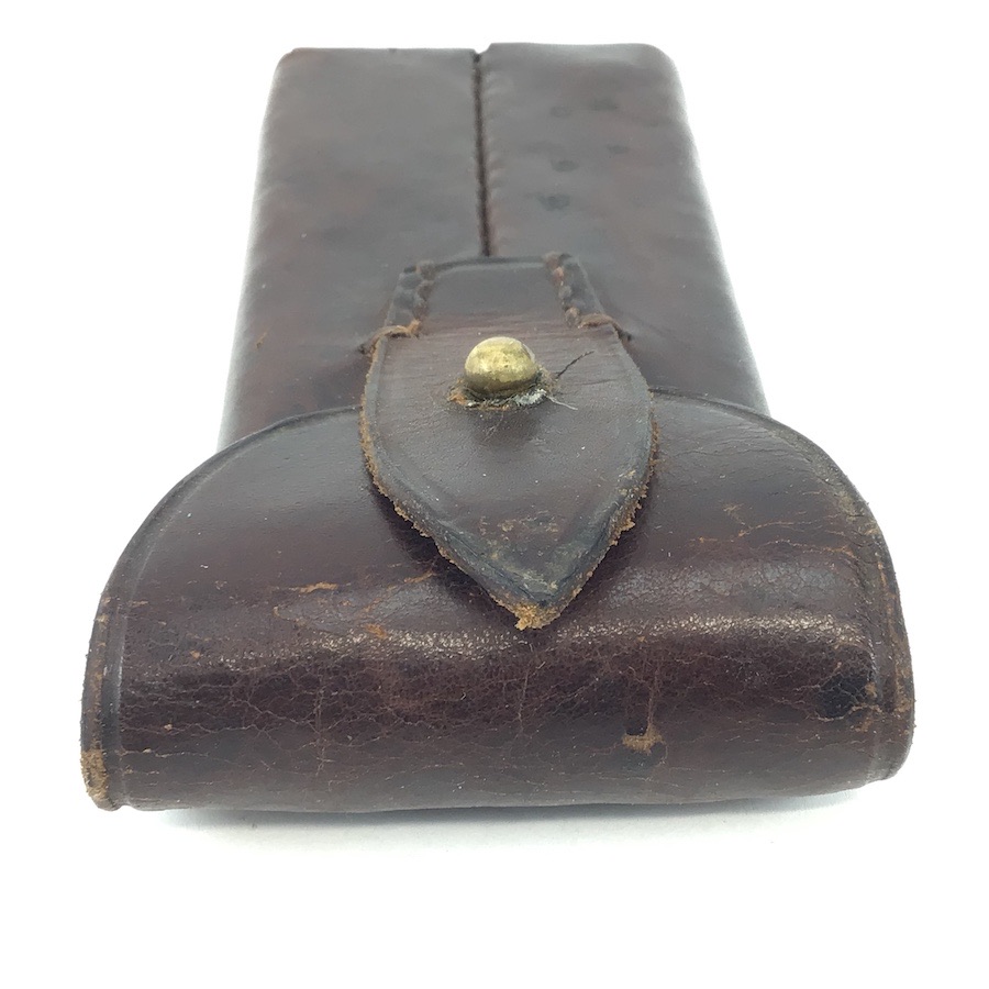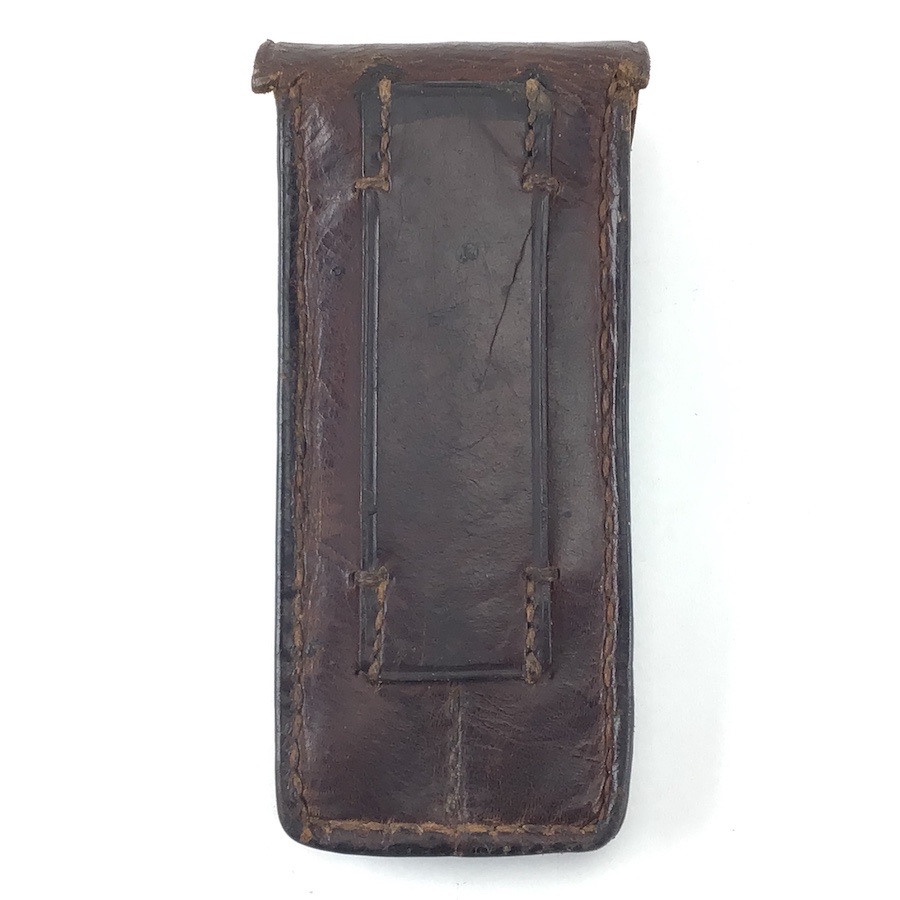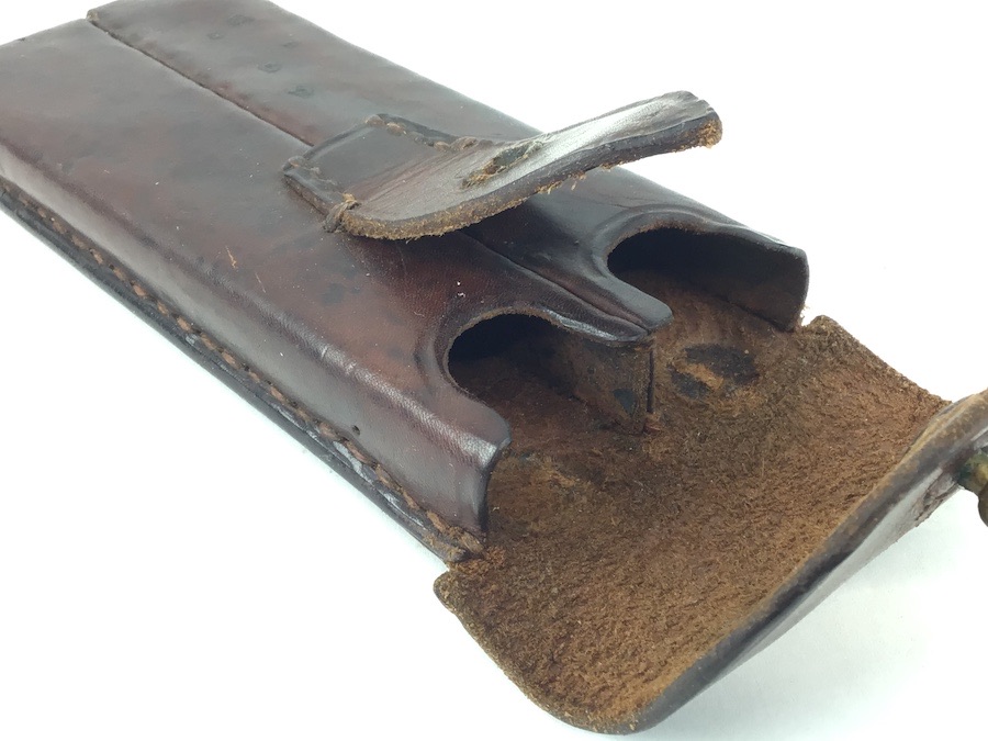 4/8/22 – This is an original WW1 era Luger magazine pouch. The pouch is unmarked, but shows an early brass closure knob and normal aging in the leather. No major issues or flaws worth noting. All original stitching intact. Clean interior.