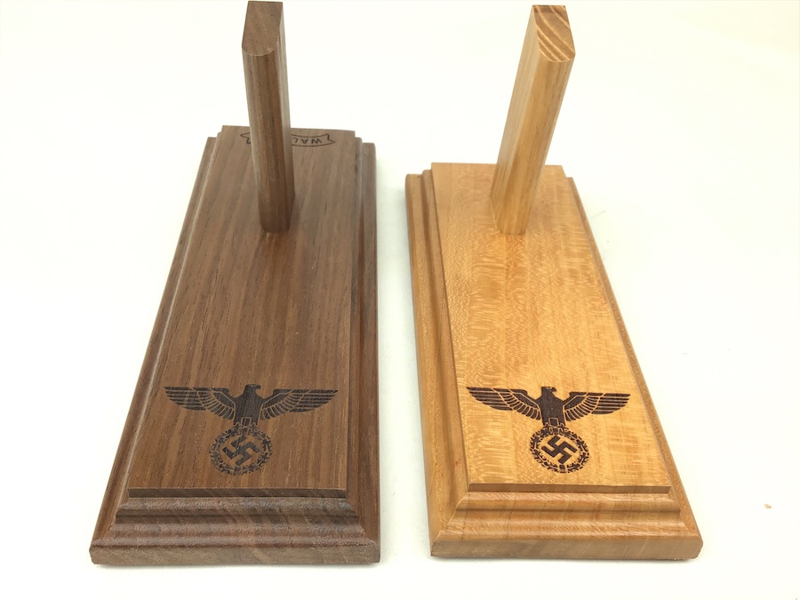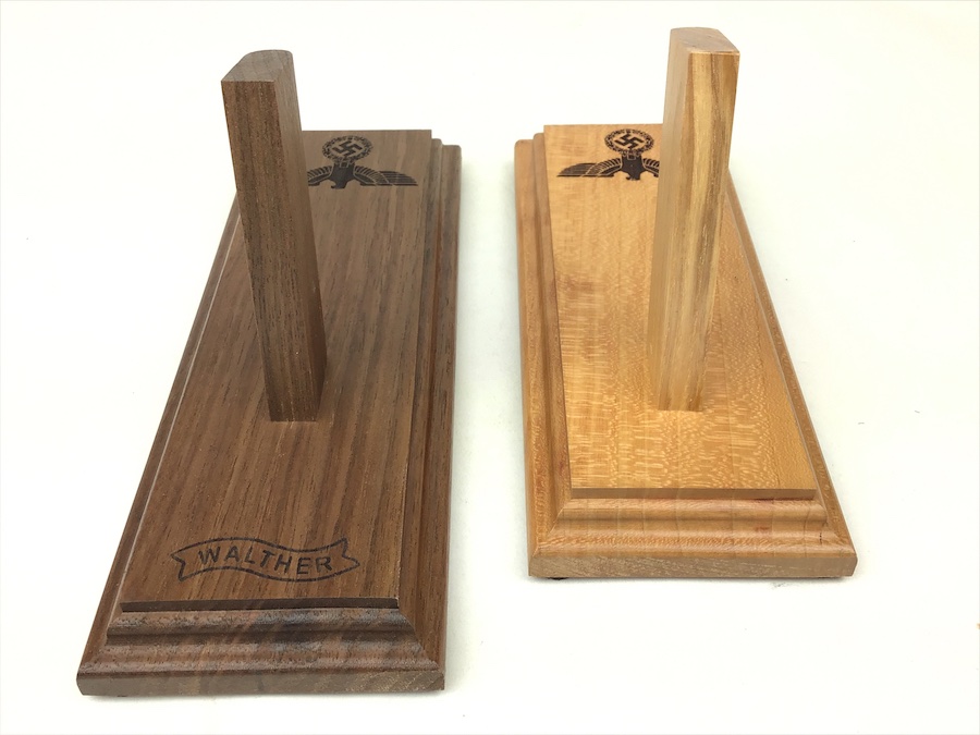 Available in solid walnut or cherry hardwoods. Base measures 8″ x 3″. Featuring a laser engraved “Part Leader Eagle” . Available with Optional “WALTHER” logo as well. These stands are made specifically for a Party Leader PPK. Just indicate your preference above and add it to your cart. Logos are available on either type wood.