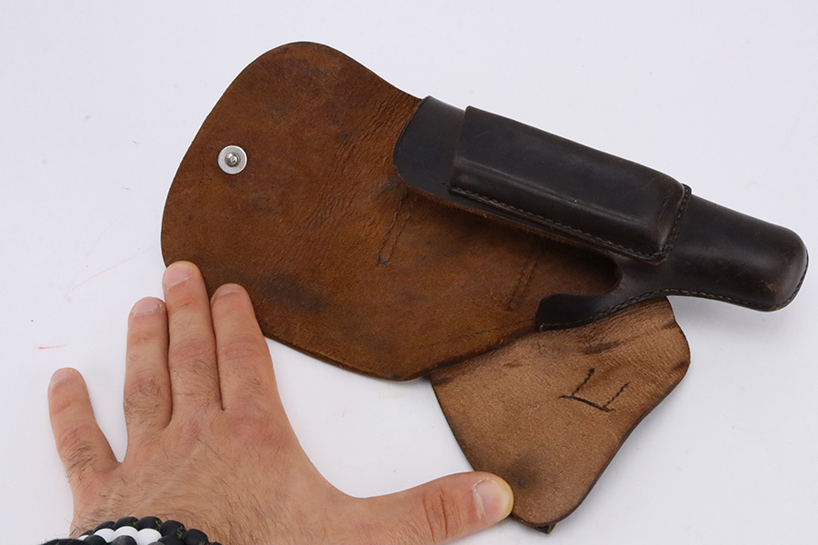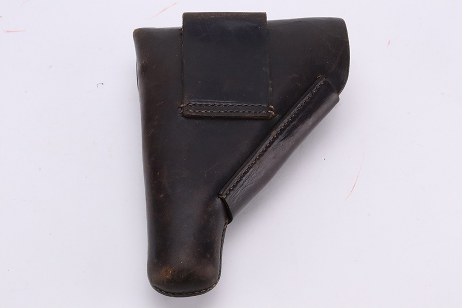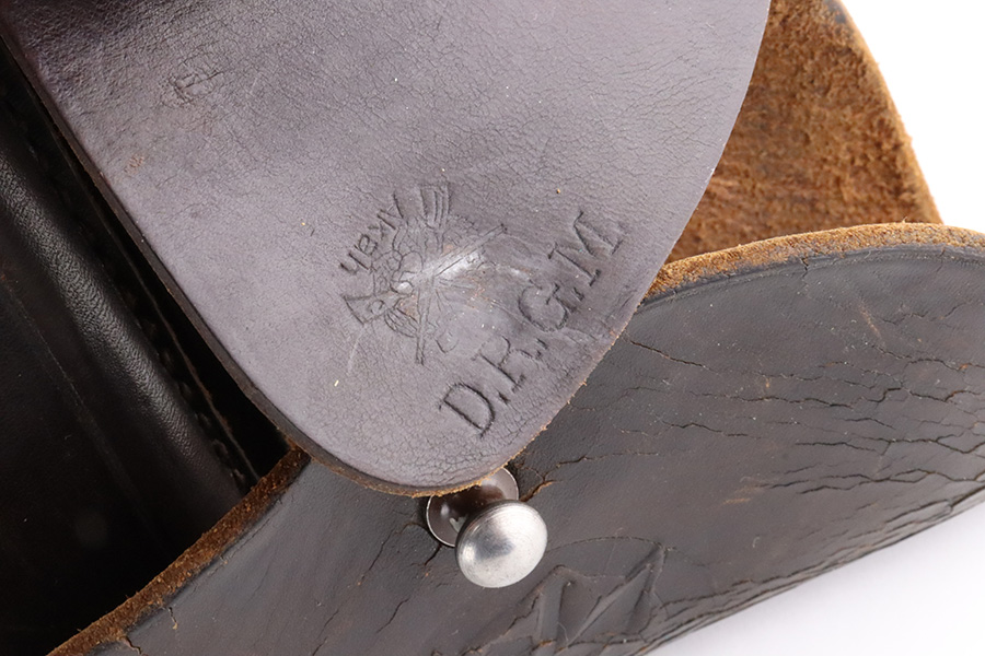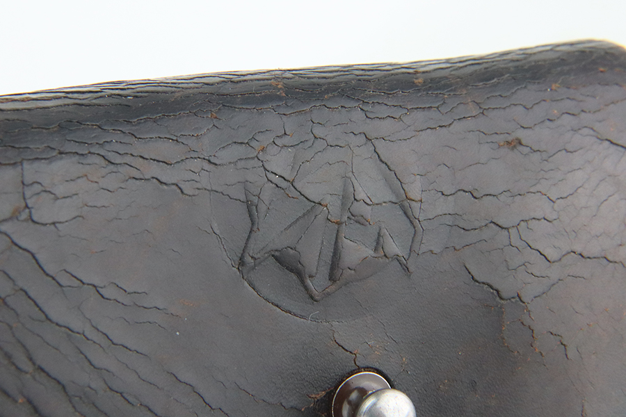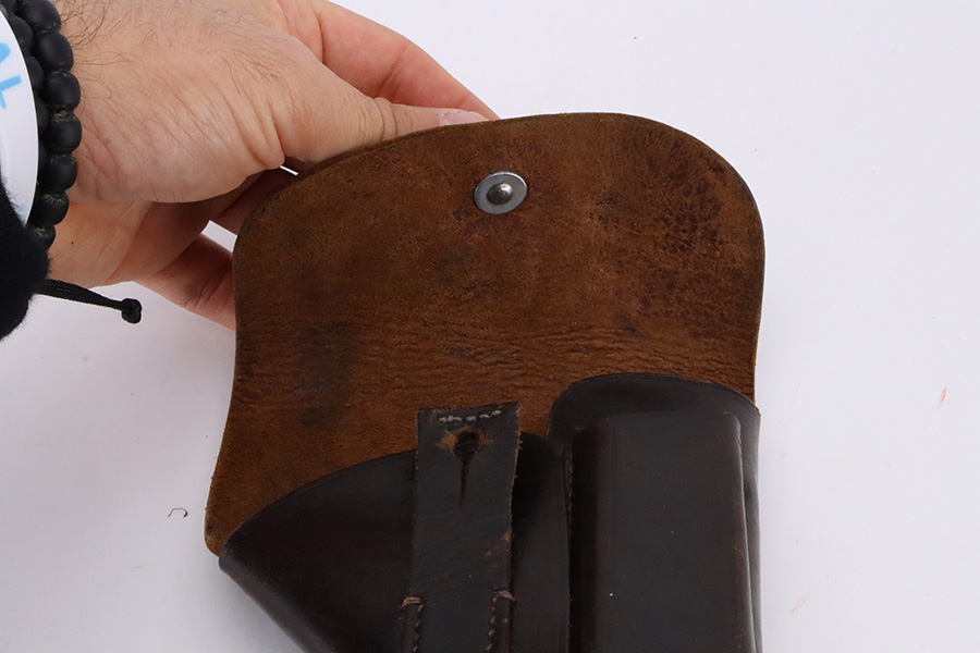 5/8/24 – This is a nice example of a rare SA holster for a Walther PP manufactured by Akah during the WW2 era. The leather of this holster is all intact and the stitching is in good condition. The SA stamp on the flap is pronounced, despite some wrinkling of the flap’s leather. The maker mark under the closer strap has some rub wear but still features pronounced “AKAH” lettering and “D.R.G.M.”. The closure strap is in fair condition showing some wrinkling throughout. Overall the holster is in fair condition and its structural integrity is intact.