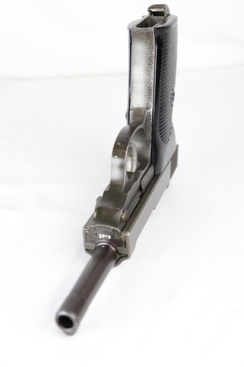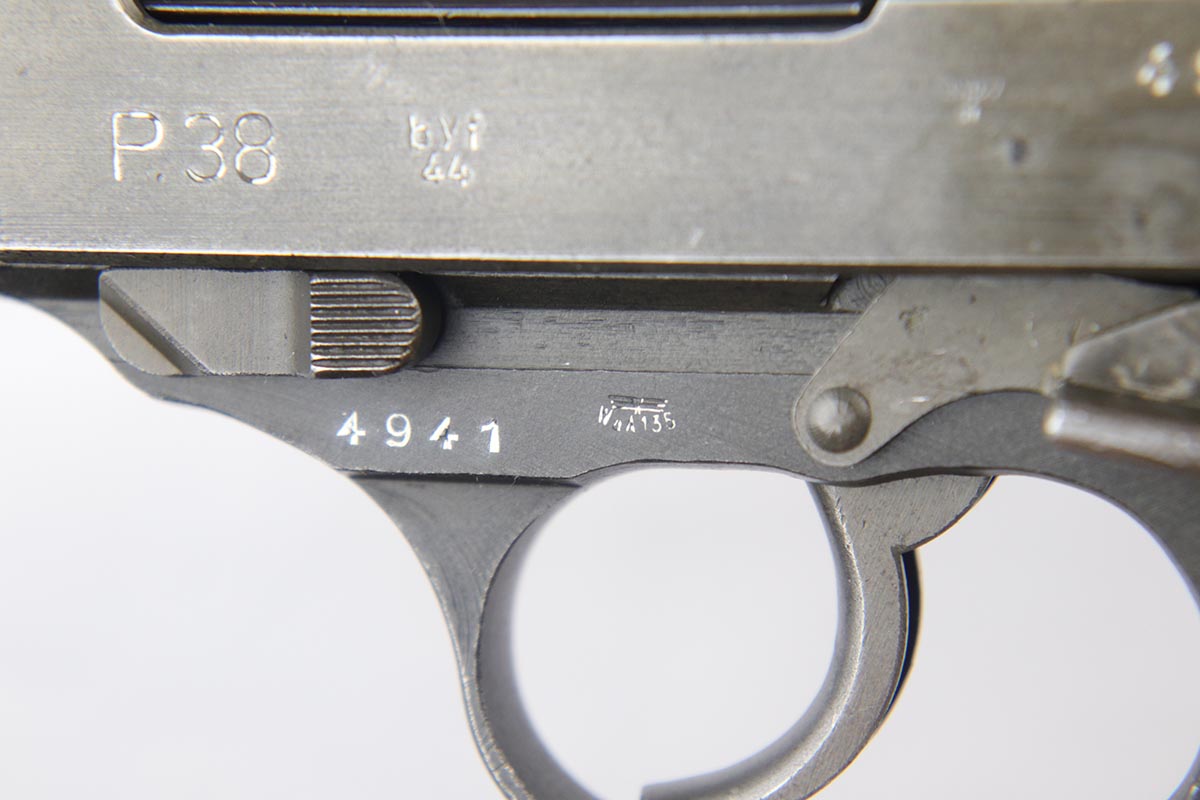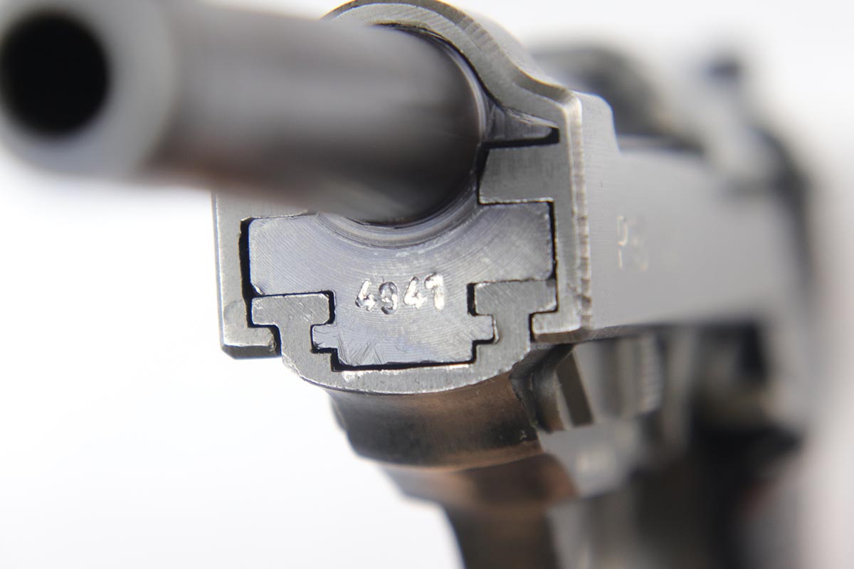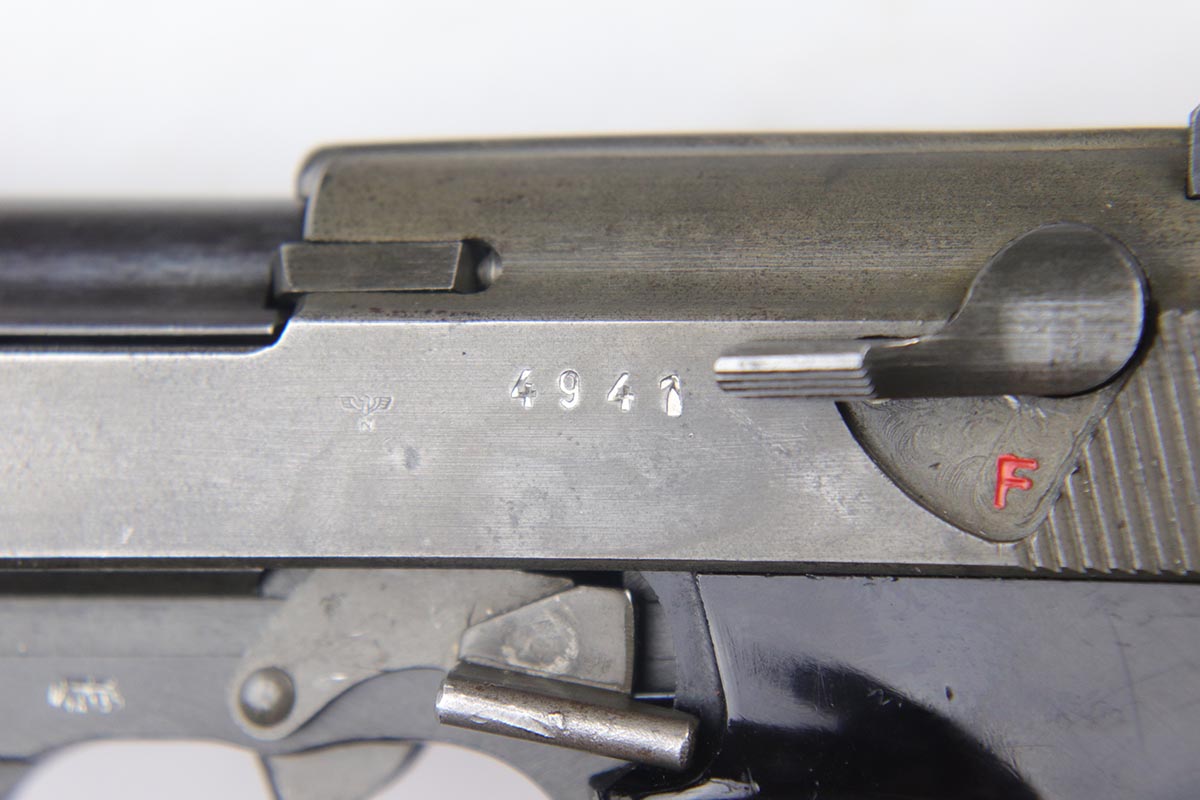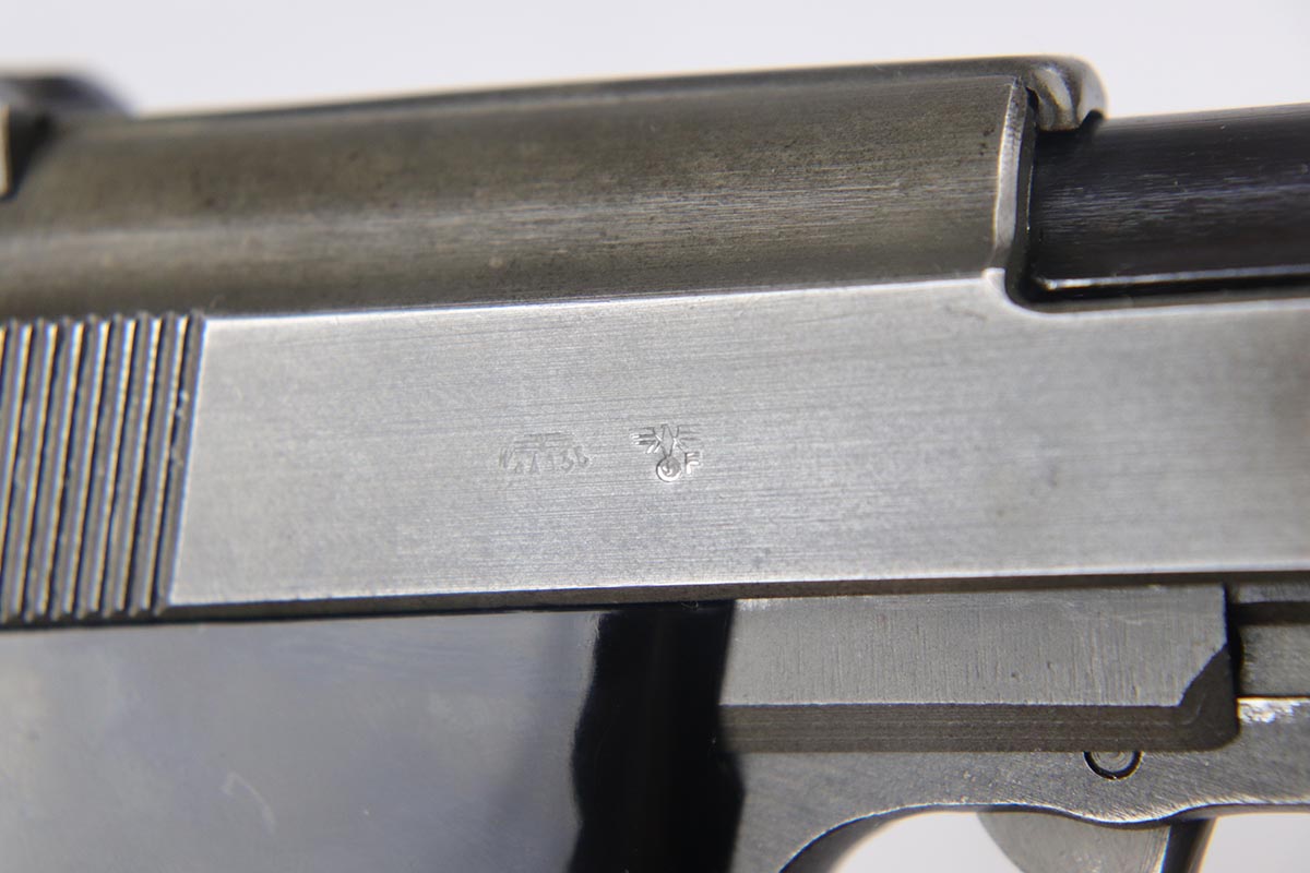 6/27/18 – This is a rare Mauser-made P.38, with police eagle/f marking on the right side of the slide.  Only 1,500 of these pistols were produced!  According to Jan Still, they fall between 4346-5501, and this one is 4941, right in the middle of the range.  It has a nice dual-tone finish, with phosphate frame and slide, as well as phosphate small parts, but a blued barrel.  There is some dulling of finish on the slide, but most of the finish loss is on the front strap.  Excellent black grips and Mauser magazine.  Minty bore.  Comes with an excellent and original police softshell holster.