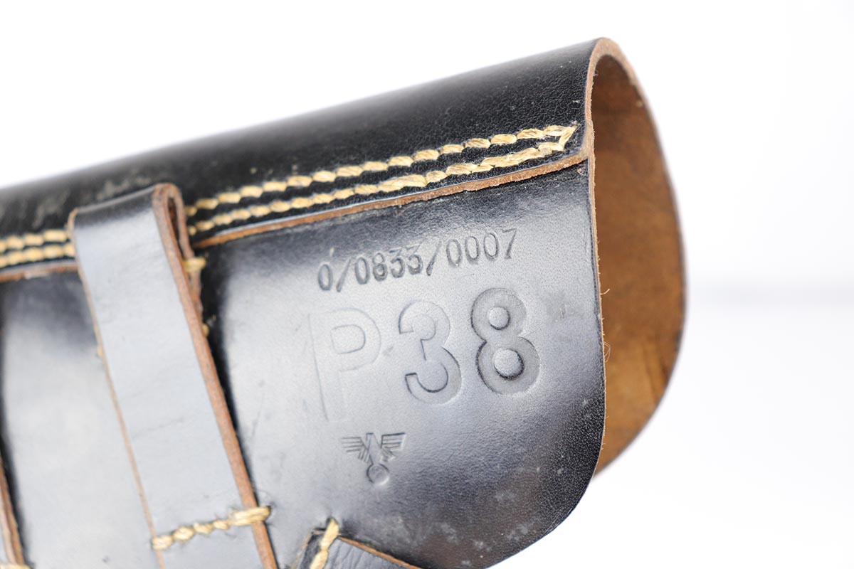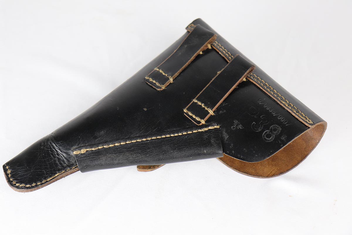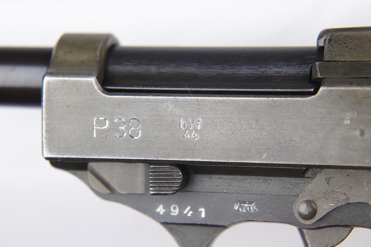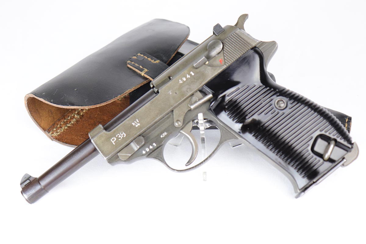6/27/18 – This is a rare Mauser-made P.38, with police eagle/f marking on the right side of the slide.  Only 1,500 of these pistols were produced!  According to Jan Still, they fall between 4346-5501, and this one is 4941, right in the middle of the range.  It has a nice dual-tone finish, with phosphate frame and slide, as well as phosphate small parts, but a blued barrel.  There is some dulling of finish on the slide, but most of the finish loss is on the front strap.  Excellent black grips and Mauser magazine.  Minty bore.  Comes with an excellent and original police softshell holster.