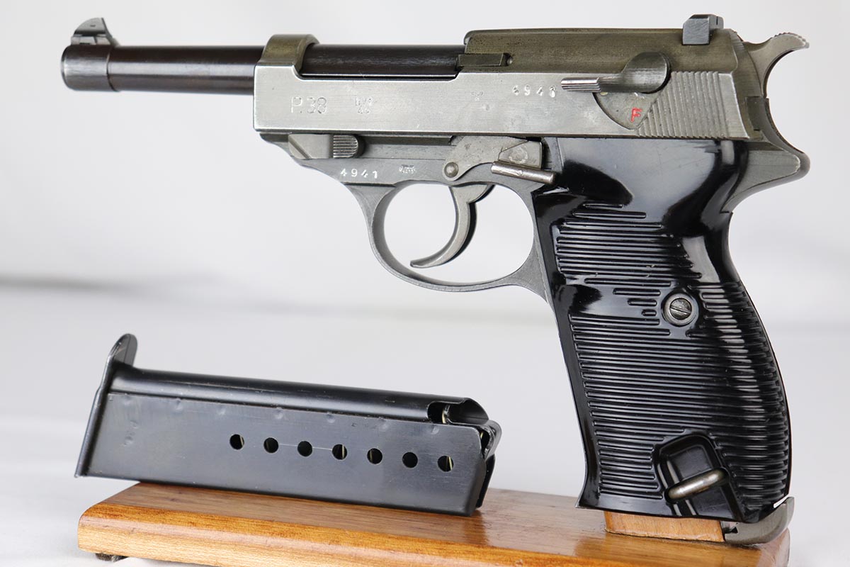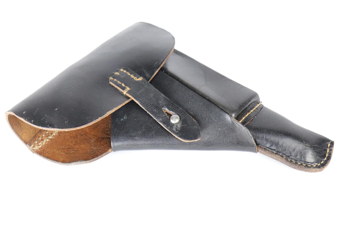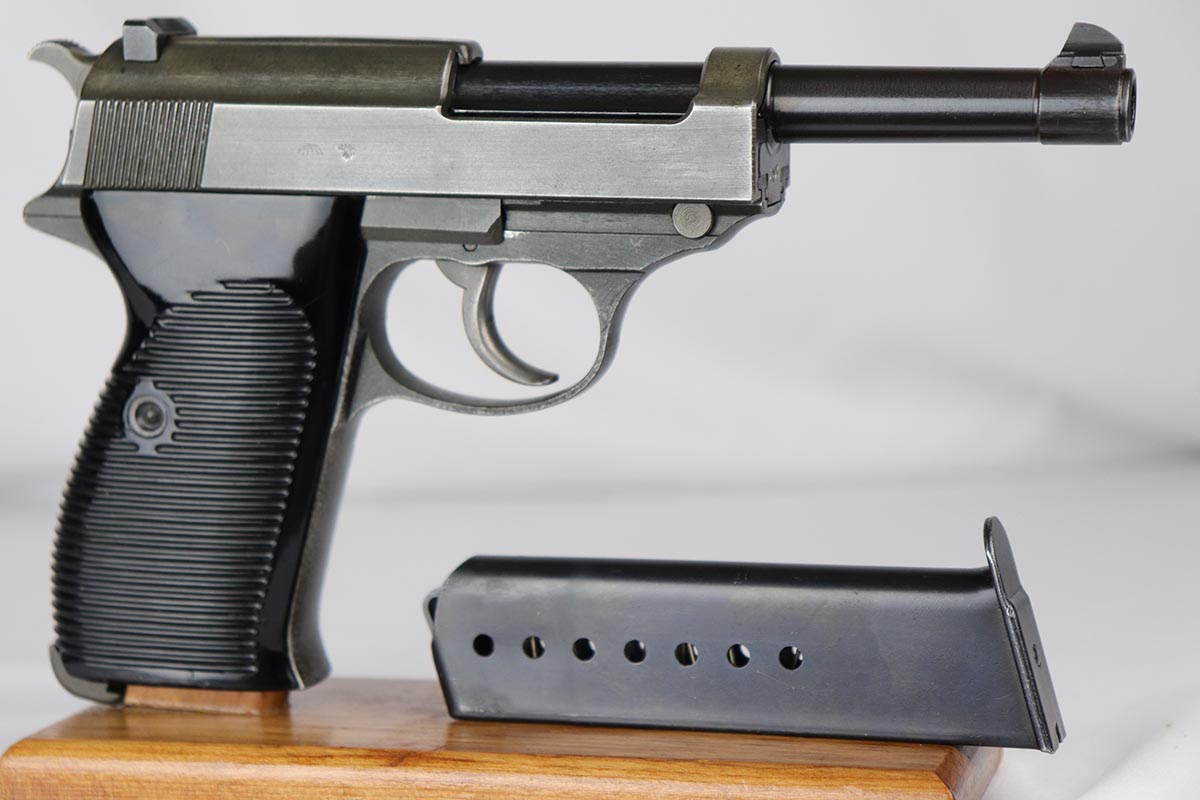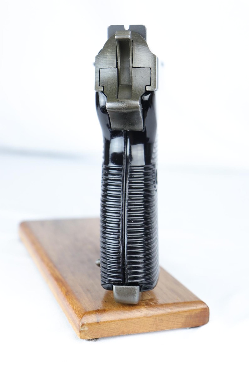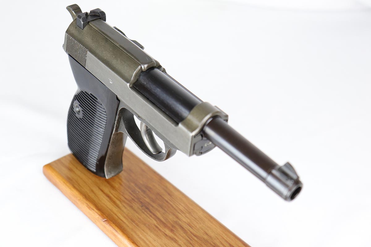 6/27/18 – This is a rare Mauser-made P.38, with police eagle/f marking on the right side of the slide.  Only 1,500 of these pistols were produced!  According to Jan Still, they fall between 4346-5501, and this one is 4941, right in the middle of the range.  It has a nice dual-tone finish, with phosphate frame and slide, as well as phosphate small parts, but a blued barrel.  There is some dulling of finish on the slide, but most of the finish loss is on the front strap.  Excellent black grips and Mauser magazine.  Minty bore.  Comes with an excellent and original police softshell holster.