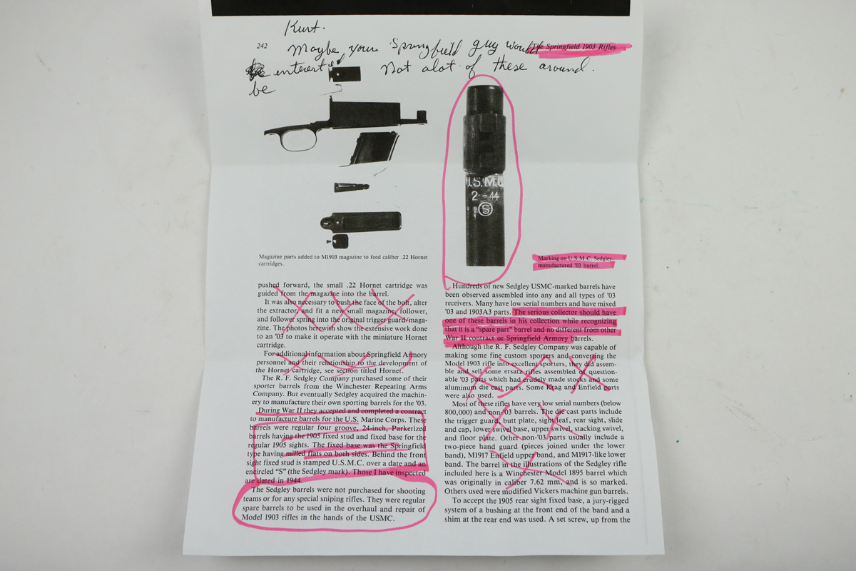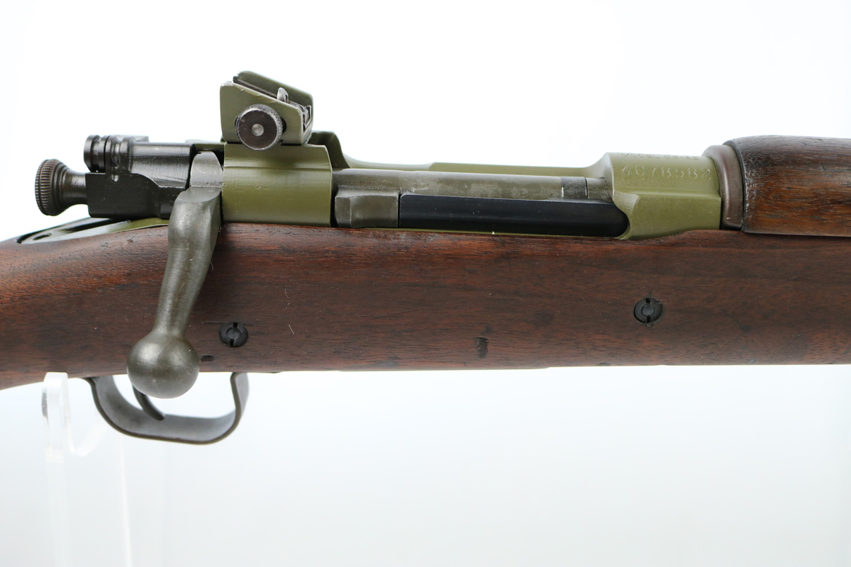8/15/18 – This is an original Remington 03-A3 that was built for military use during WW2. The rifle was then later sent back to the Springfield arsenal where it was refinished and rebuilt with a Sedgely barrel. The barrel is USMC stamped, and dated 1943. The rifle receiver has an unusual olive green finish. The finish is minty on the receiver. The barrel has some minor wear, but is in great shape overall as shown in photos. The stock is arsenal stamped from Springfield and shows light signs of sanding, but overall is in excellent condition. The bore is minty with excellent rifling. Guaranteed original and fully functional. Comes with some documentation on these USMC rebuilt rifles – please see photos.