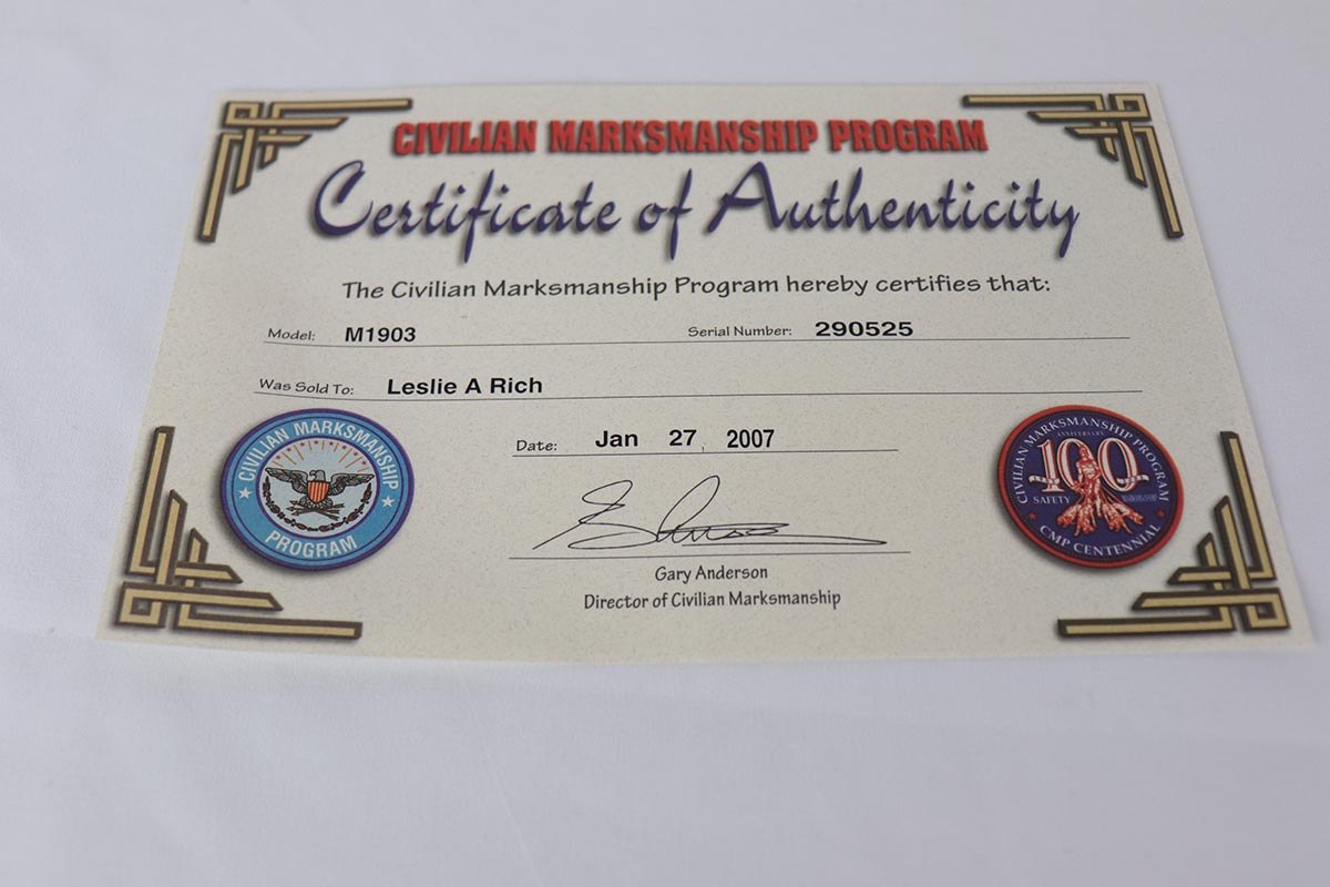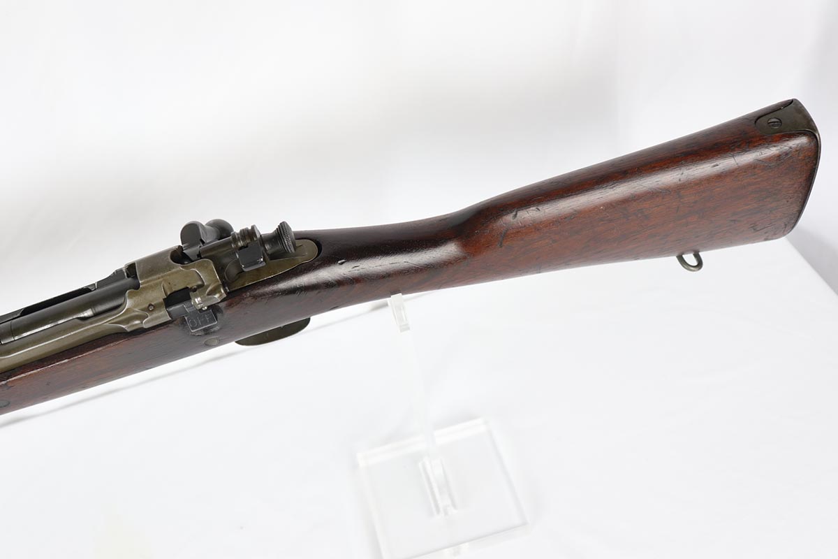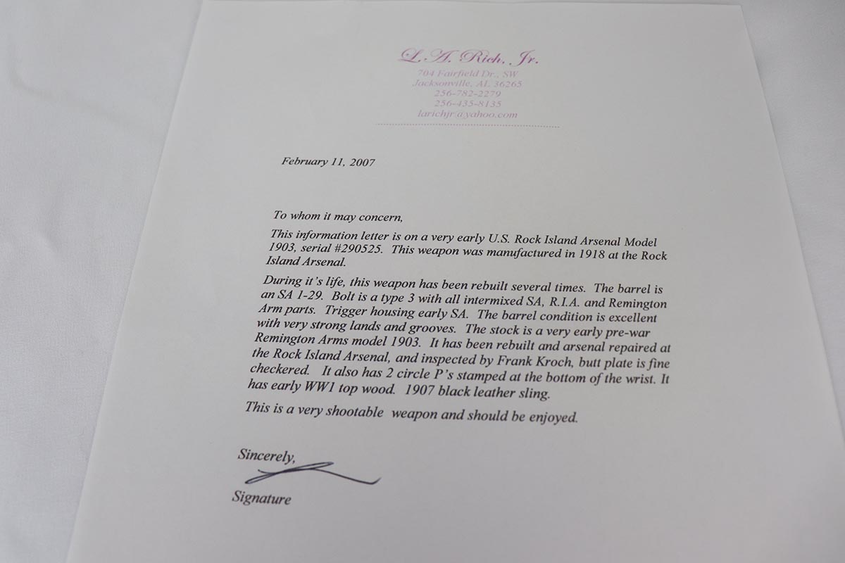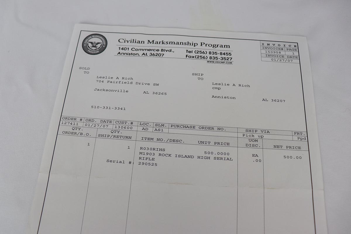 10/11/18 – This is a Rock Island Arsenal manufactured M1903-A3 from the tail end of the Great War. This is an interesting piece as the receiver was made in 1918, but the barrel is Springfield Armory made and dated to January of 1929, and the stock has a Rock Island cartouche. Records show this rifle went to the 10th cavalry during WWI and was later re-worked. The rifle also includes CMP paperwork from a previous owner. Rifle is in excellent condition with a mint bore.