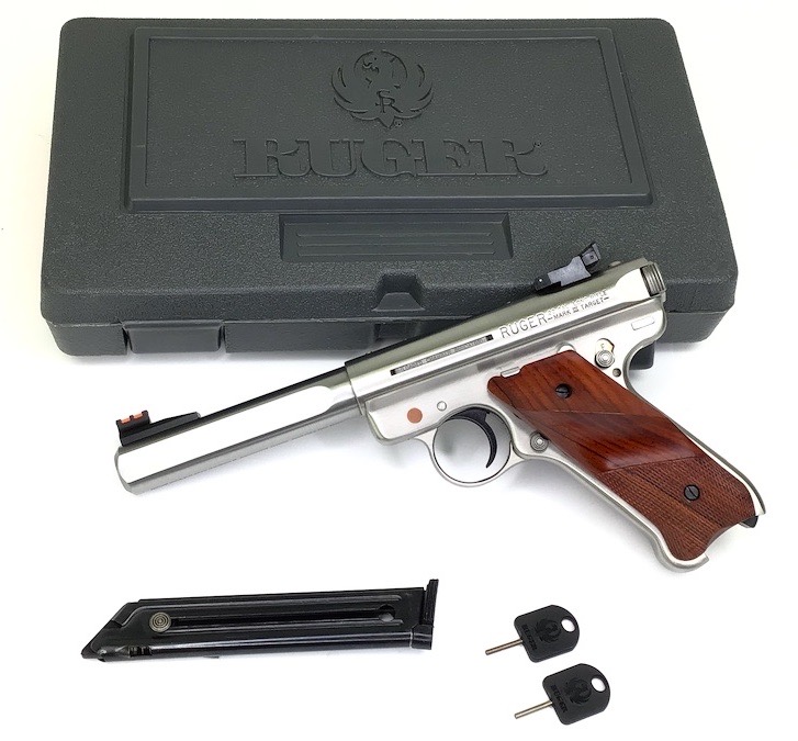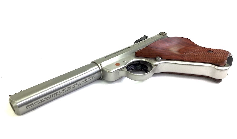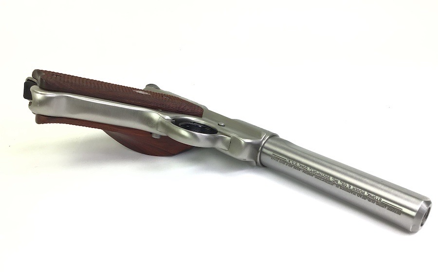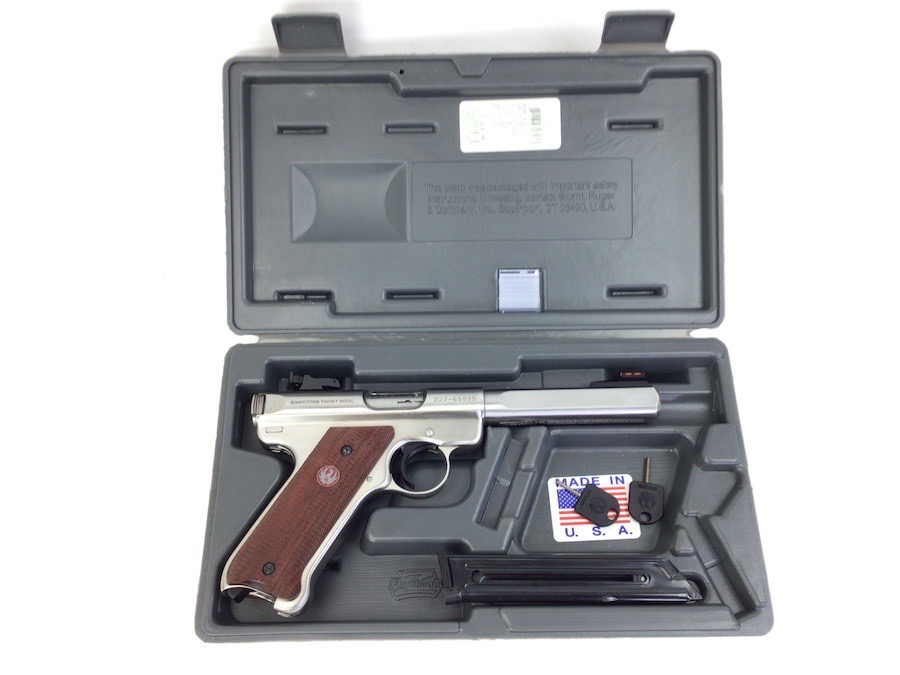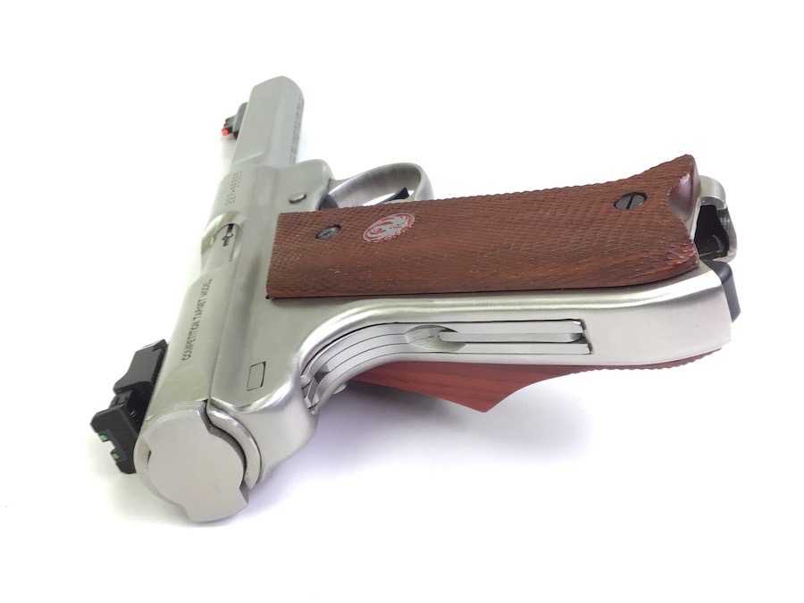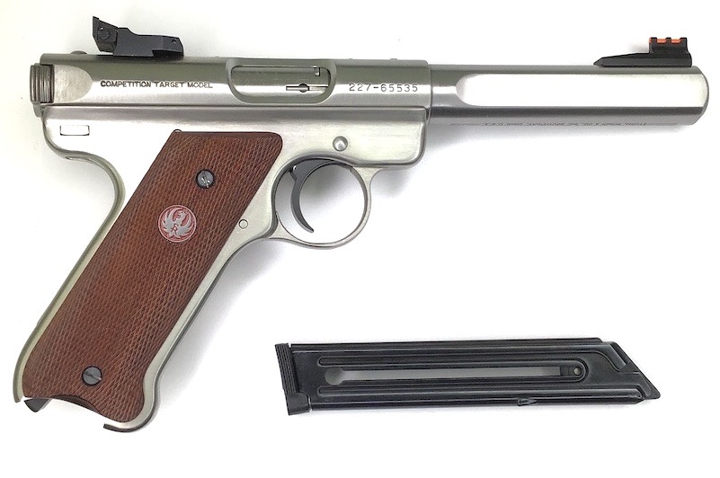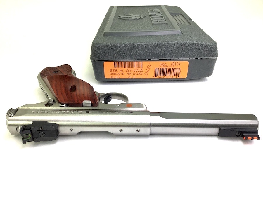 9/20/23 – Excellent condition. Includes original box, tool and one magazine. 5-1/2″ slab-sided barrel. Beautiful stainless steel frame. Factory checkered hardwood, thumb rest grips. In original black plastic case with matching end label. Smooth action and fully functional.