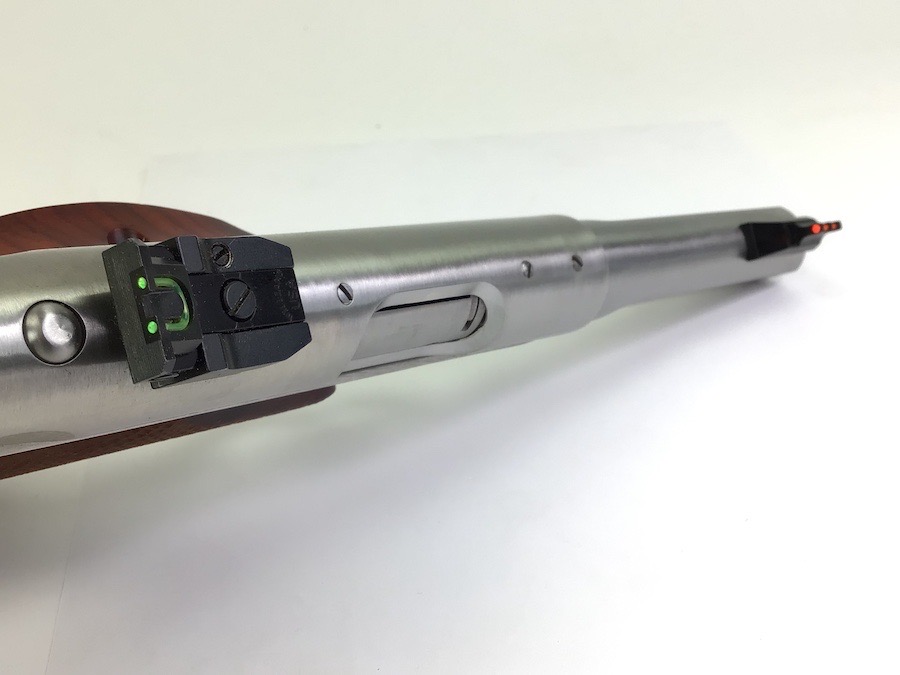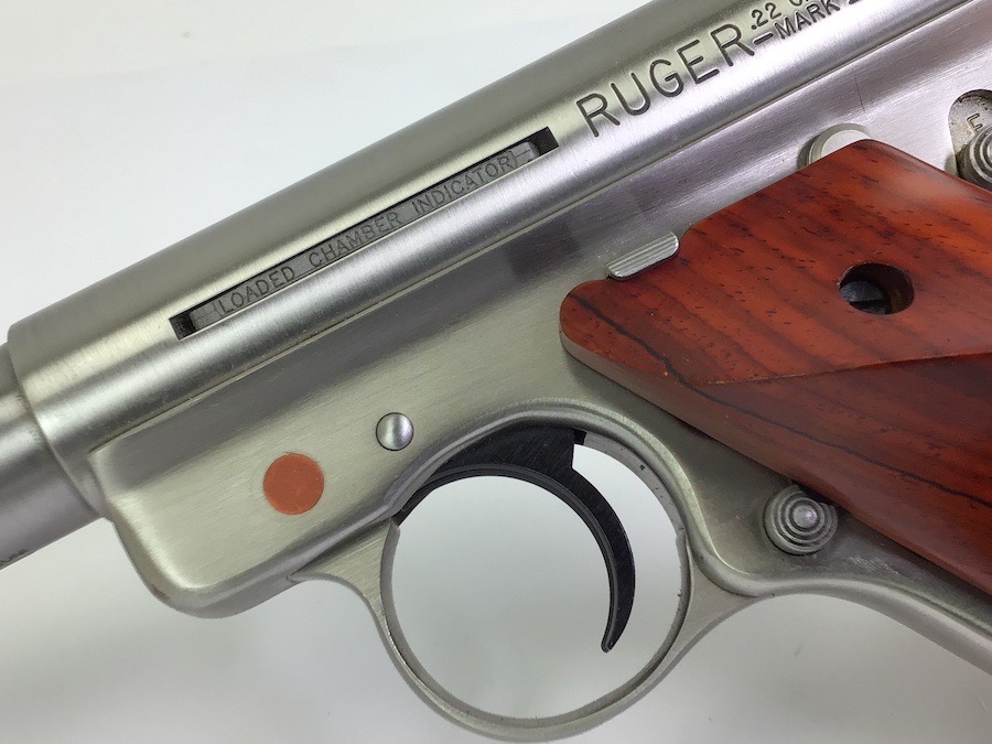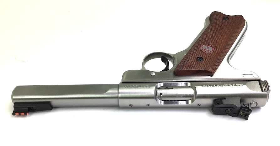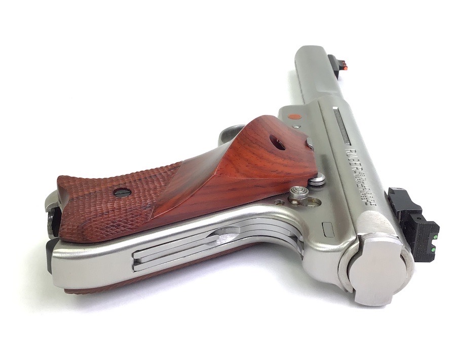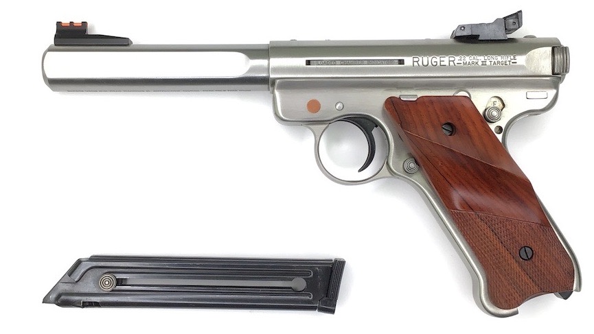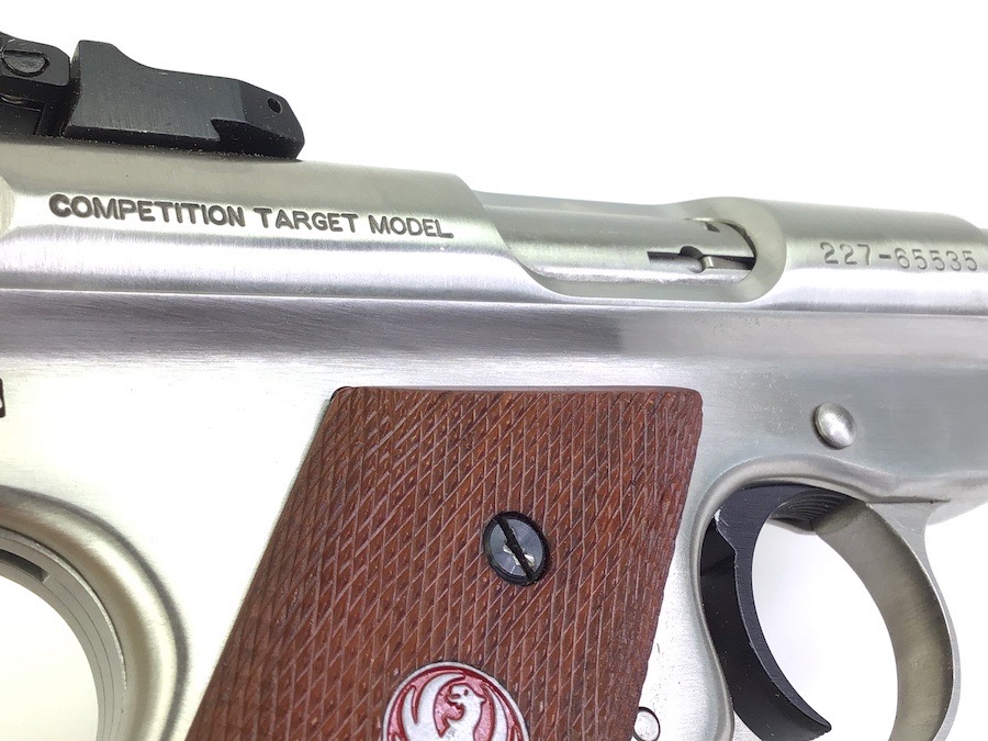 9/20/23 – Excellent condition. Includes original box, tool and one magazine. 5-1/2″ slab-sided barrel. Beautiful stainless steel frame. Factory checkered hardwood, thumb rest grips. In original black plastic case with matching end label. Smooth action and fully functional.