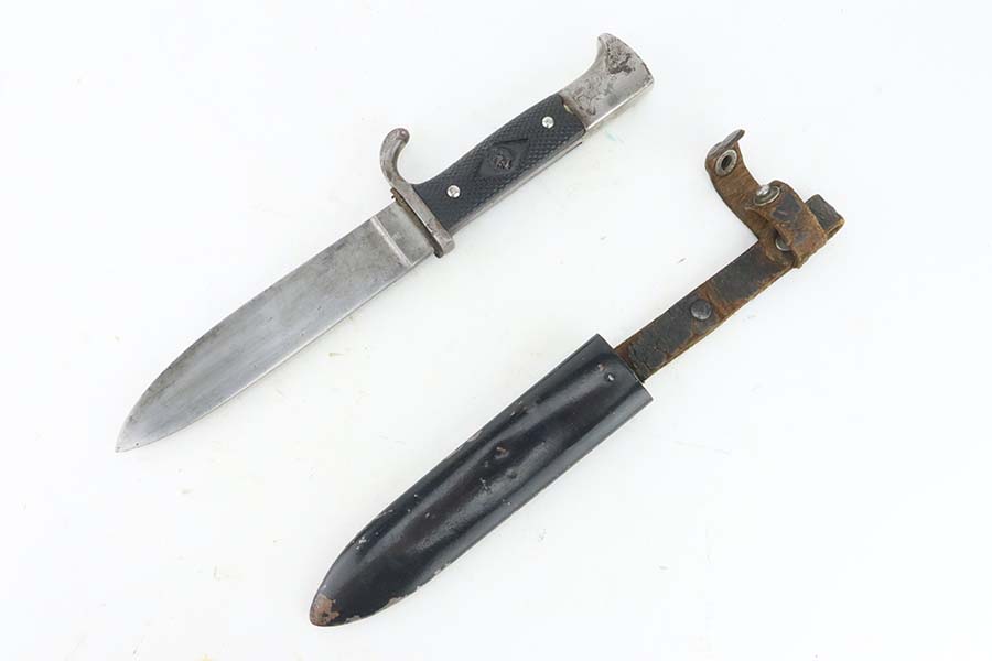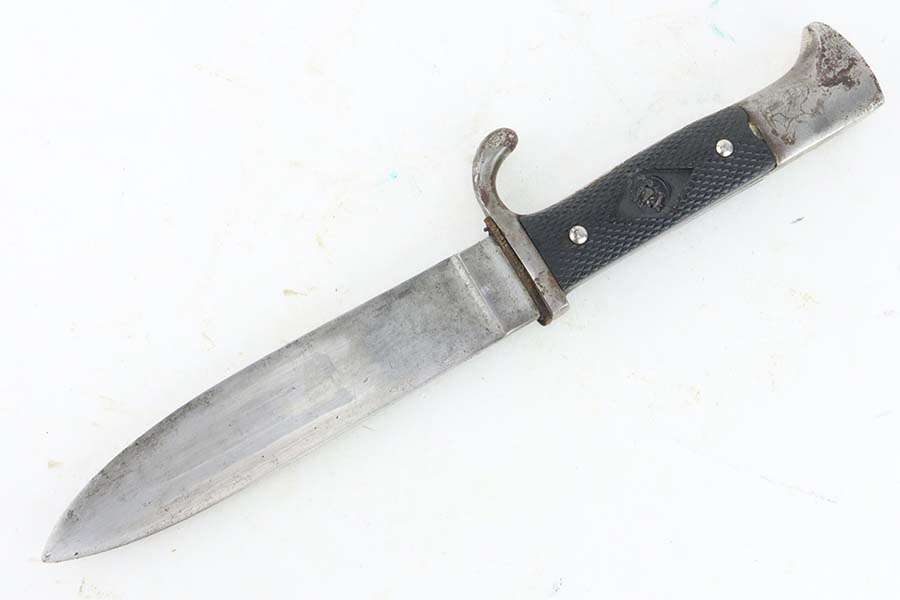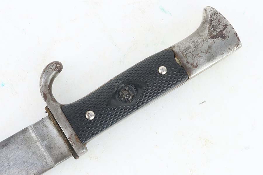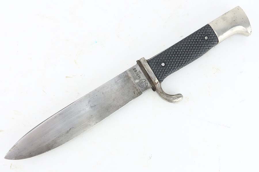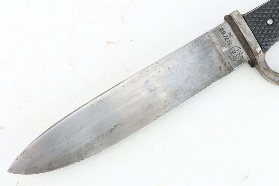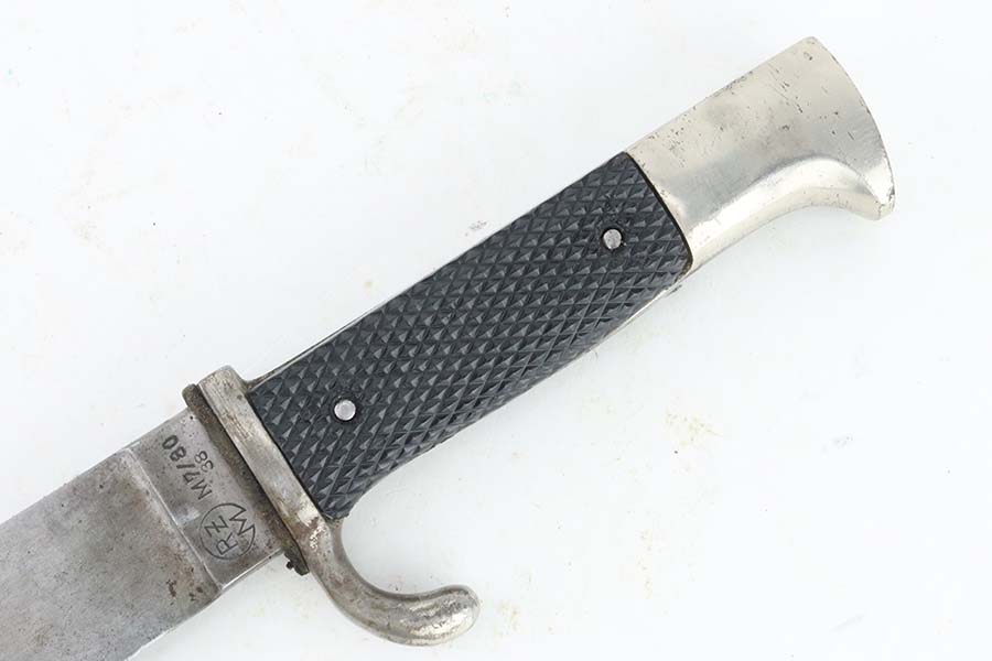 3/19/24 – This is a Hitler Youth Dagger from 1938. The blade is “RZM M7/80” marked and dated 1938. The Nazi medallion of the handle is missing, and the original etching on the blade is gone. Comes with its original scabbard. Tiny chip in the right bakelite grip. Fair condition overall.