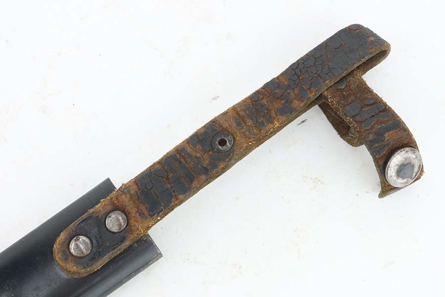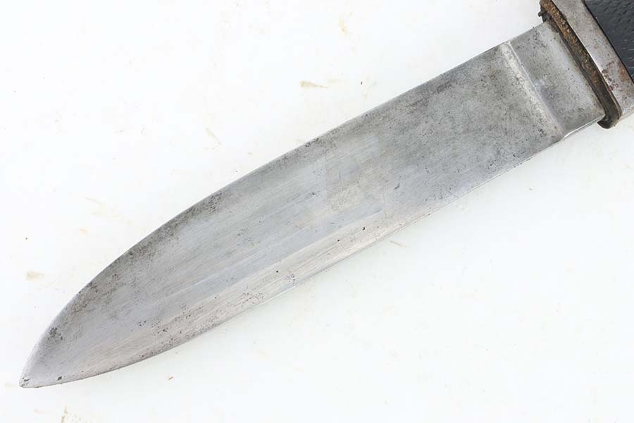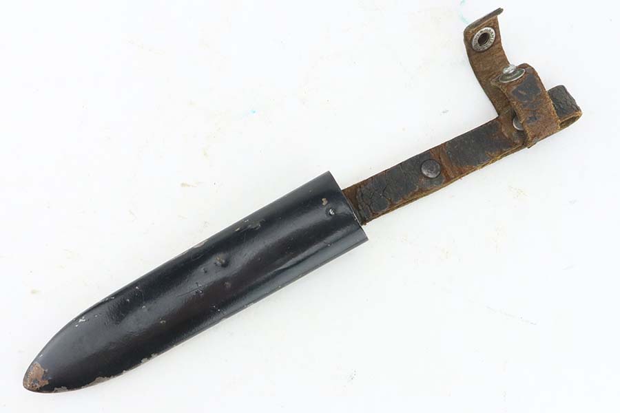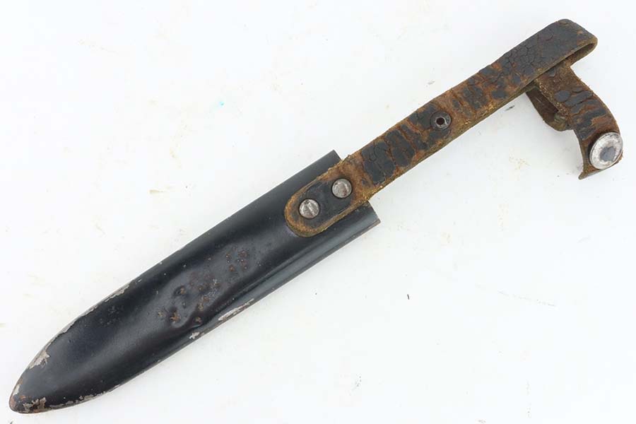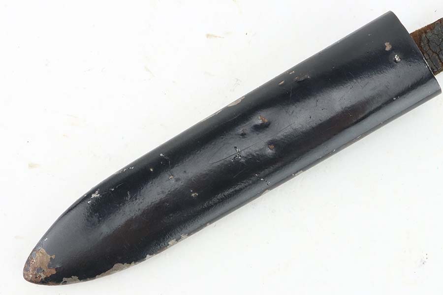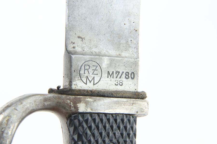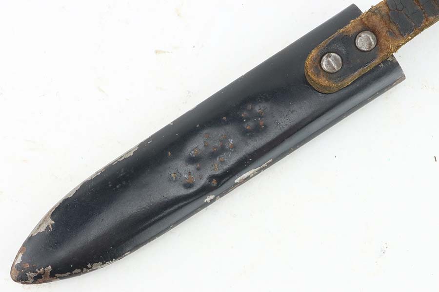 3/19/24 – This is a Hitler Youth Dagger from 1938. The blade is “RZM M7/80” marked and dated 1938. The Nazi medallion of the handle is missing, and the original etching on the blade is gone. Comes with its original scabbard. Tiny chip in the right bakelite grip. Fair condition overall.