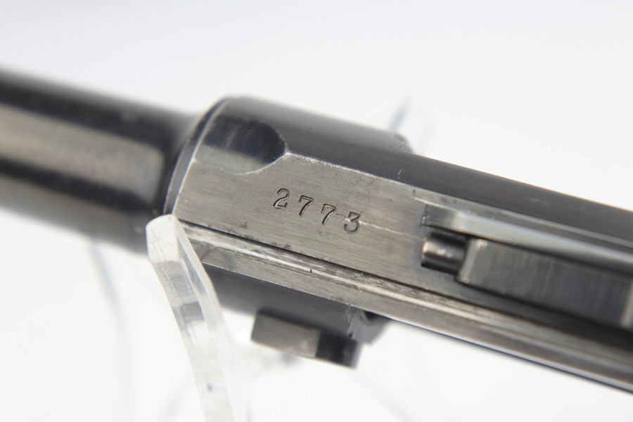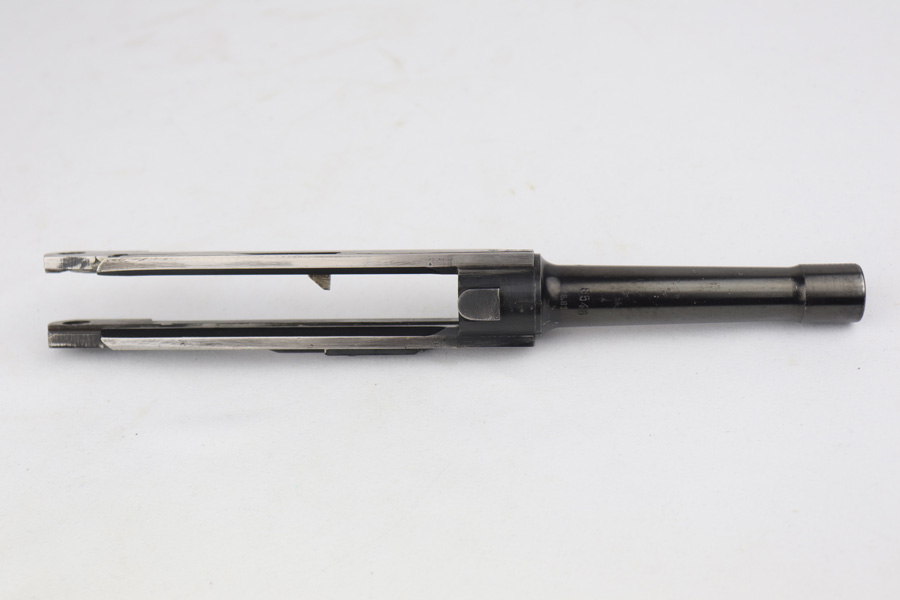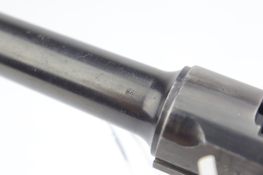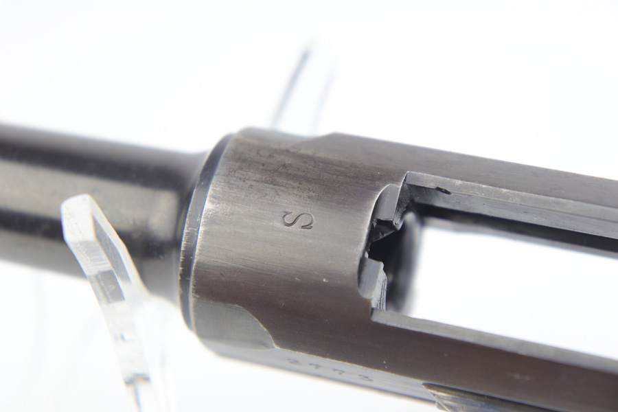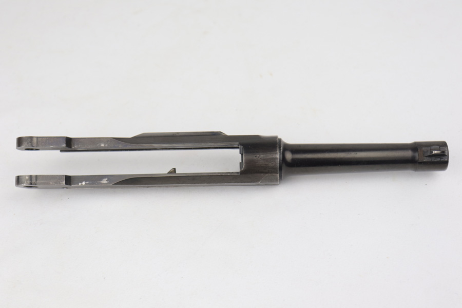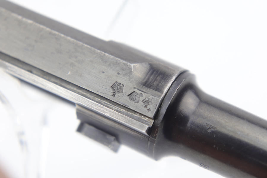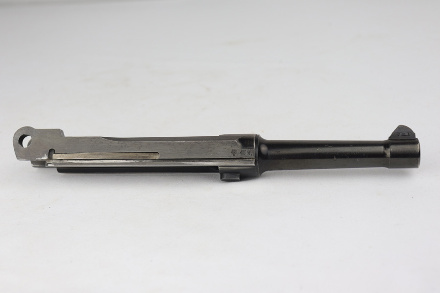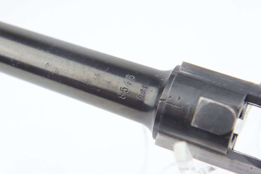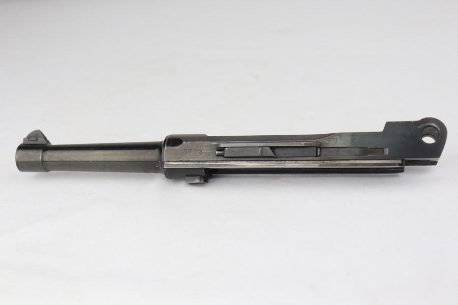 12/19/18 – This is an original Krieghoff Luger receiver. The overall finish is in about 97% with only minimal bluing loss on the edges of the receiver and muzzle. Some light thinning around the “S” code proof as well. S code marked from 1936 and all original finish. The receiver is mismatched from the barrel. Receiver serial number is 8546 and the barrel is 2773. The barrel is eagle/655 proofed which means it’s a Mauser barrel on a Krieghoff receiver. The bore is about 8.5 out of 10 with minor patina and excellent rifling. Guaranteed original and authentic.