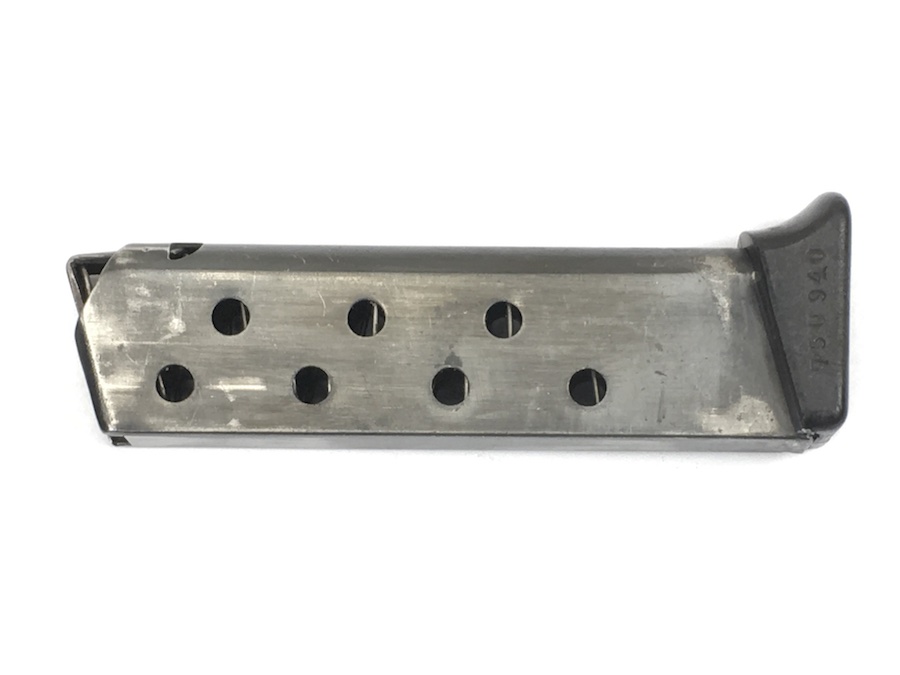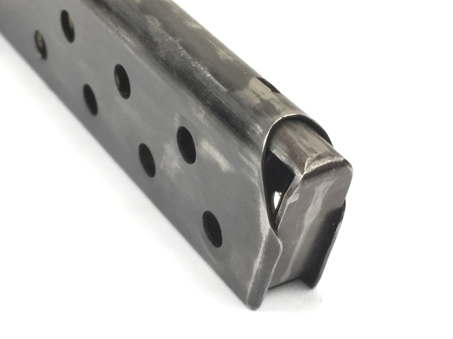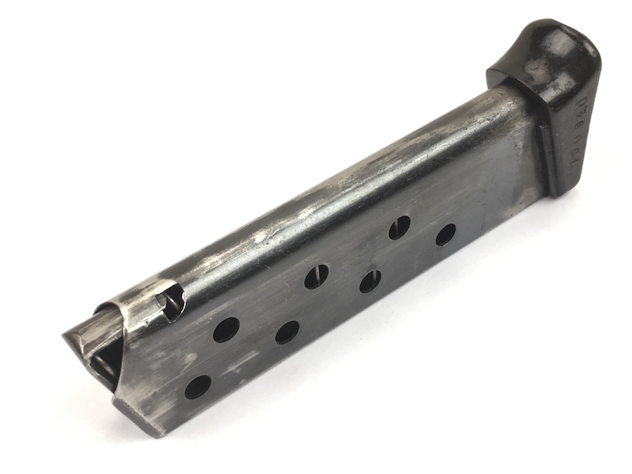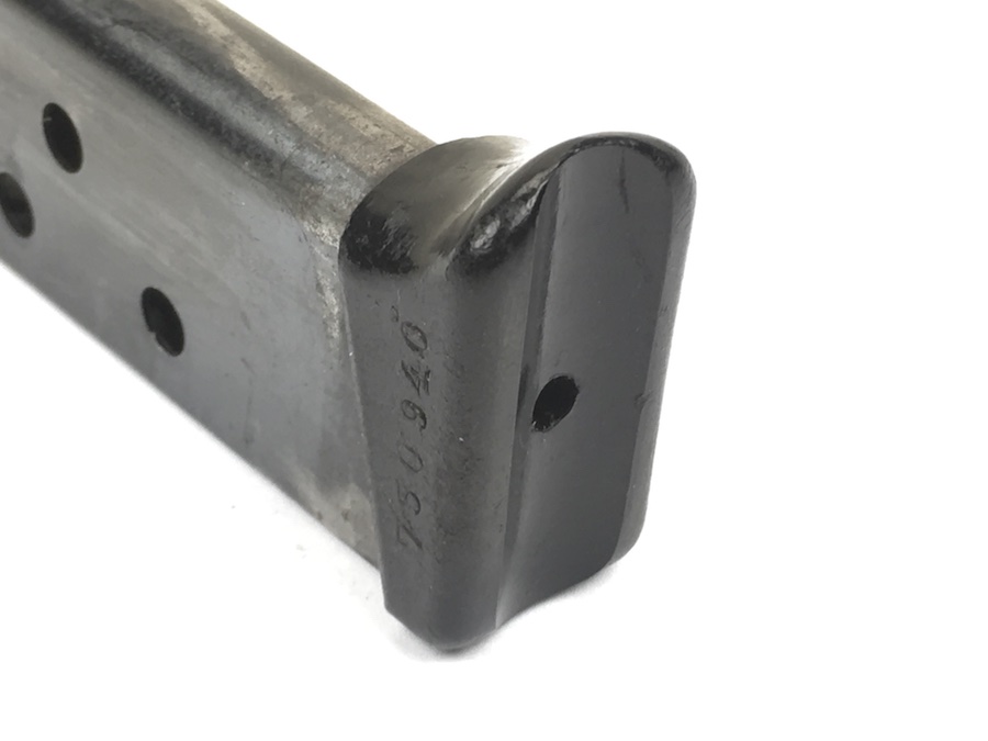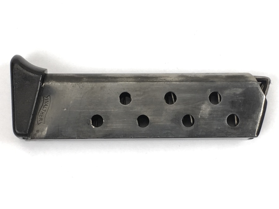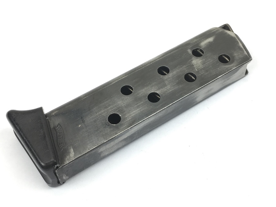 8/1/19 – Original, rare and great condition Walther PP Magazine. Slab sided, black finger extension that is bank numbered. (Bank pistols were issued to bank tellers during that time period. This magazine would have been issued with the pistol) Shows bluing wear from use, but solid with a strong spring. Finger extension is the no lip variation with smooth side. No cracks.