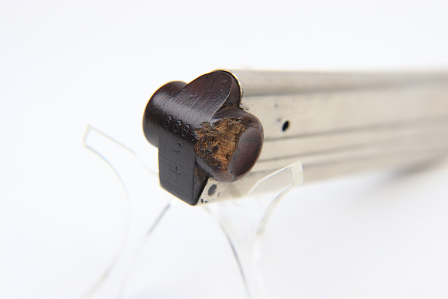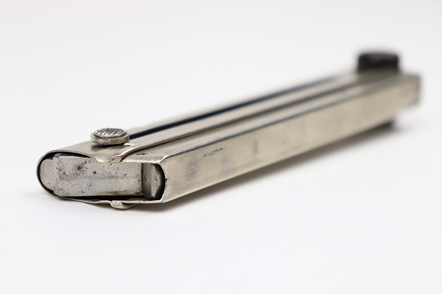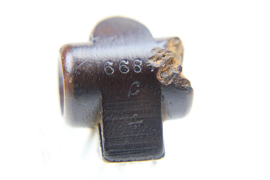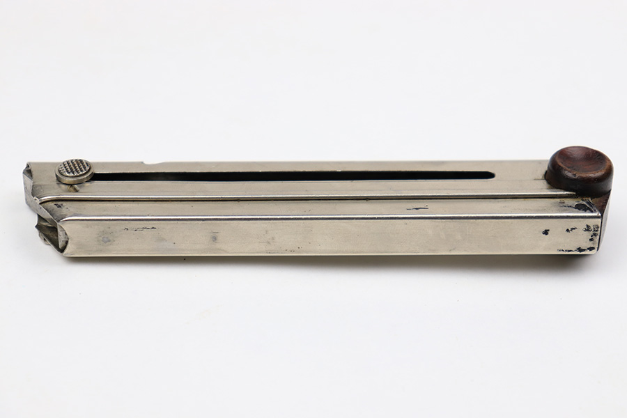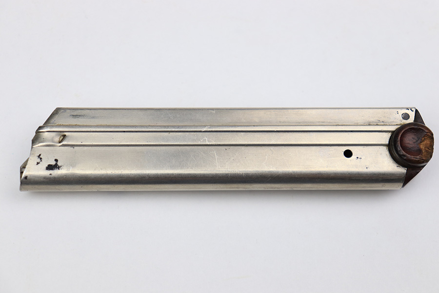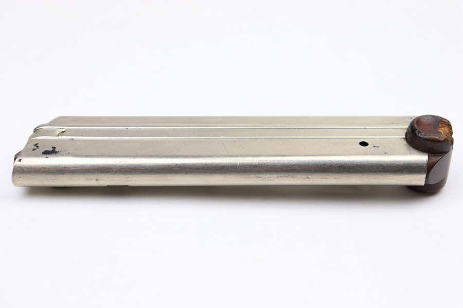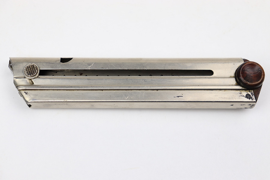 6/29/22 – This is an original WW1 era Luger magazine. The magazine has an excellent nickel finished tube and a wood base. The base is serial numbered “668(7) c” with a plus sign underneath. The left ear is chipped, otherwise the magazine would be excellent. The chip doesn’t affect functionality, and the spring is still strong.