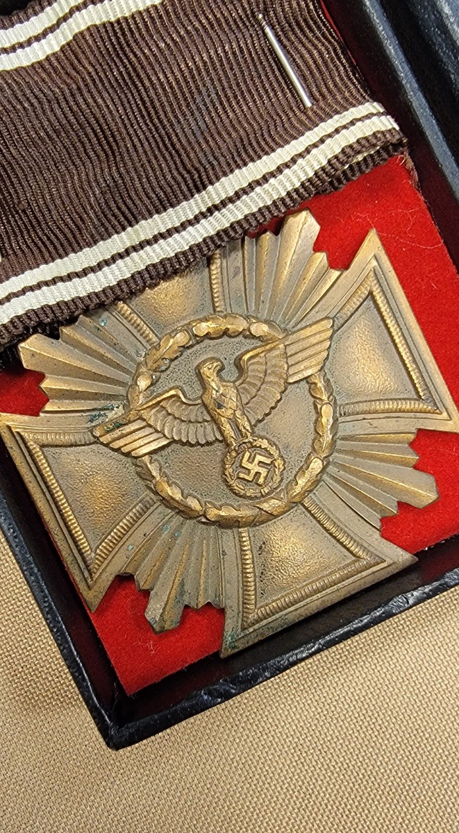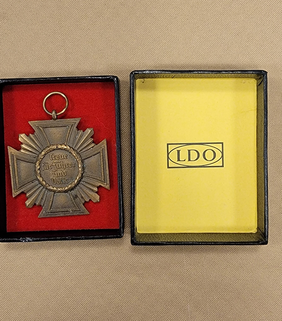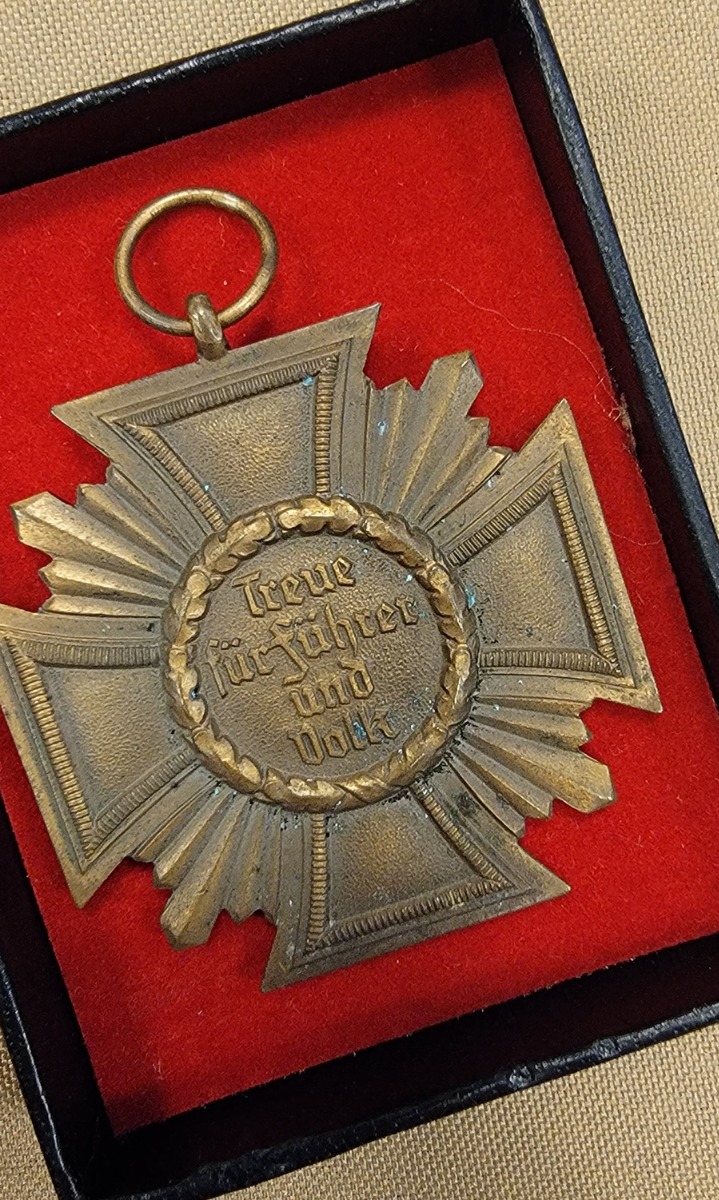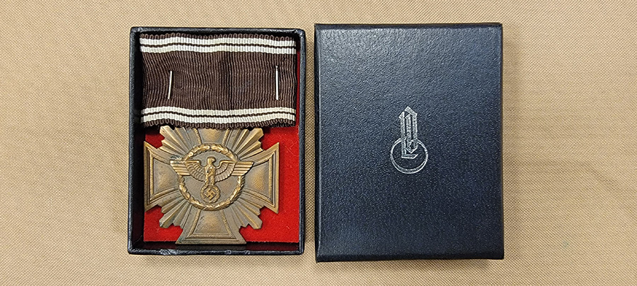 12/6/23 – This is an original 10 Year Long Service Award from WW2. The medal comes with an original ribbon, which is detached but in excellent condition. The closure clasp on the ribbon has been removed. The medal shows light patina but is in great overall condition with no major issues. Comes with a reproduction box, which makes a nice display.