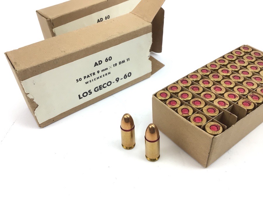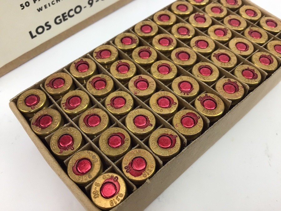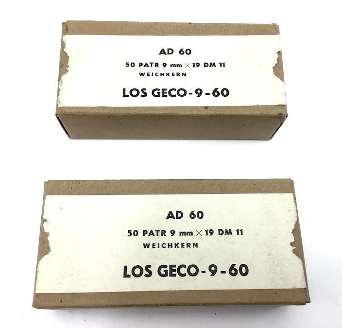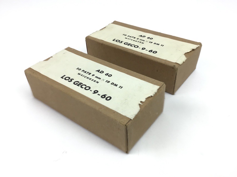 8/2/23 – Great condition. 100 Rounds of GECO Manufactured 9mm Luger, vintage Ammunition. Two boxes of 50 rounds each. Boxes are intact and opened. The labels are torn on the end but they are readable and intact. Cartridges are in pristine condition. Red primer seal. Head-stamped “9×19 Geco 9-60”
