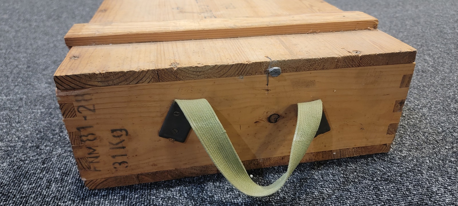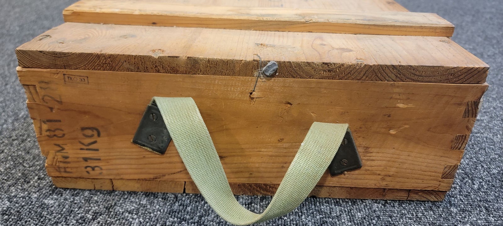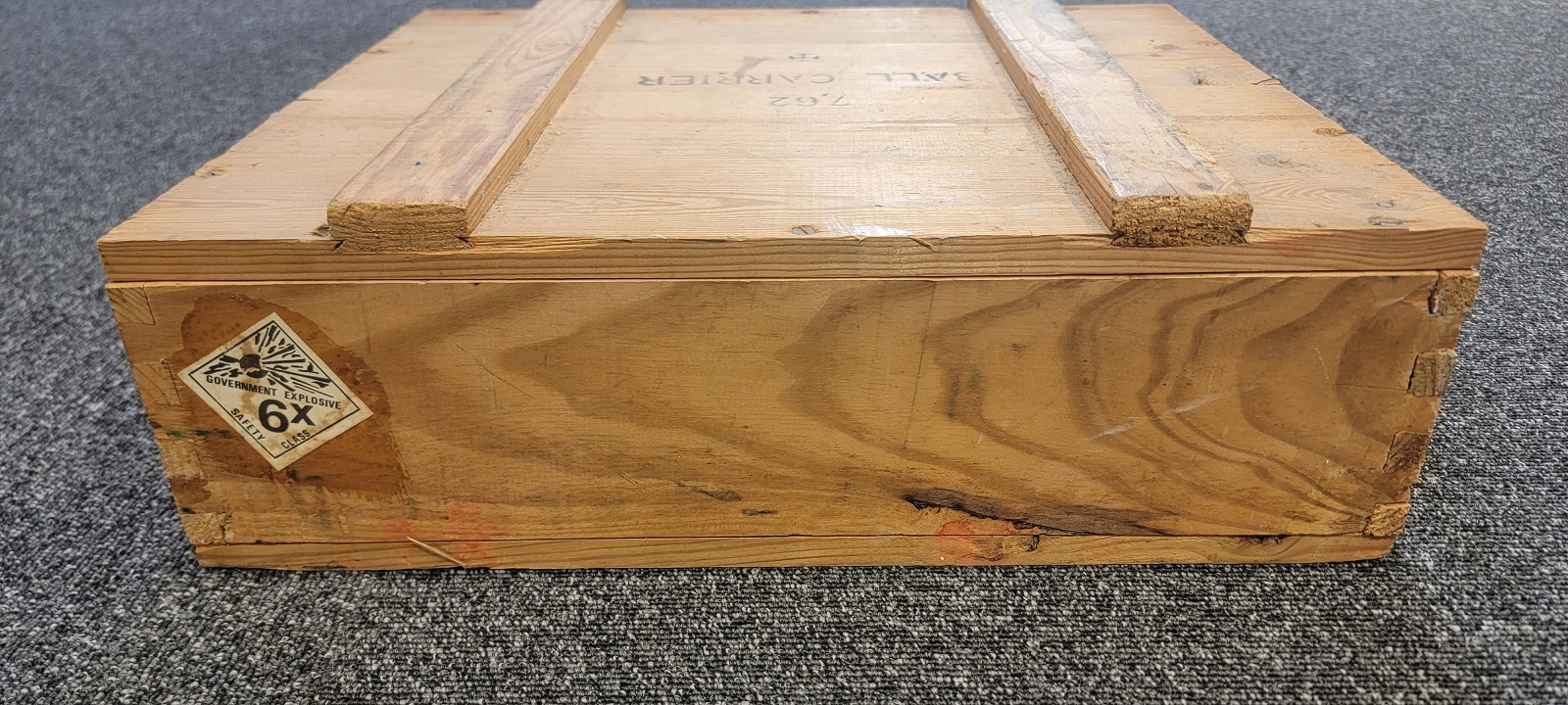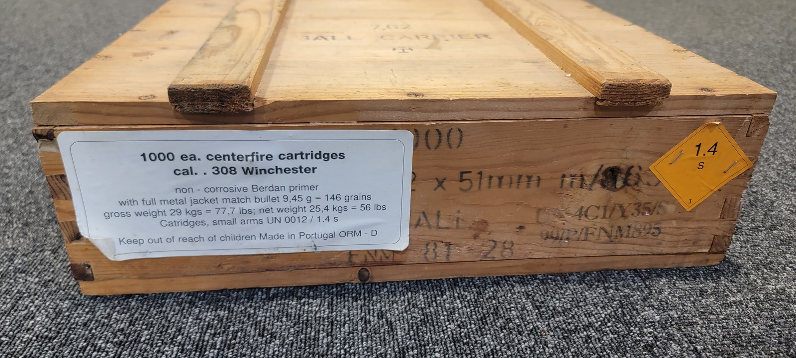 11/20/23 – This is a wood crate holding 1000 rounds of 7.62x51mm rifle ammunition (.308 Winchester). The ammo is Portuguese manufacture, and the wood case is still sealed. The case is in great overall condition with no major flaws and visible exterior labels and markings. Non corrosive primer and 146 grain FMJ bullets.