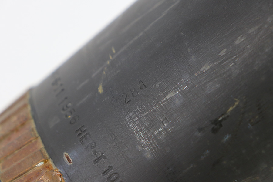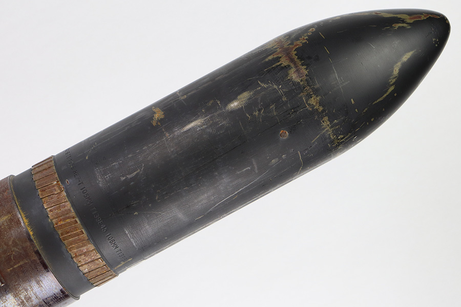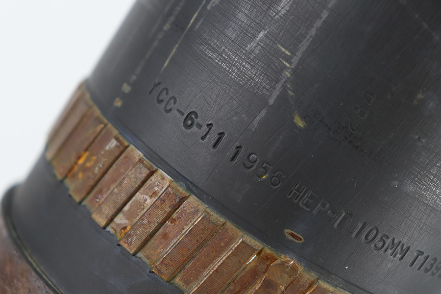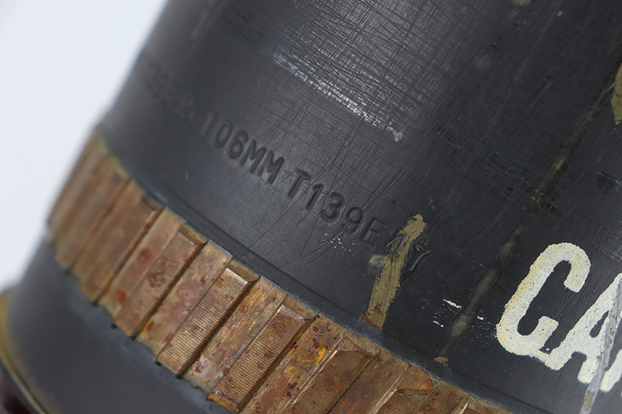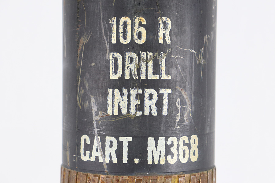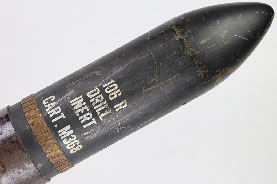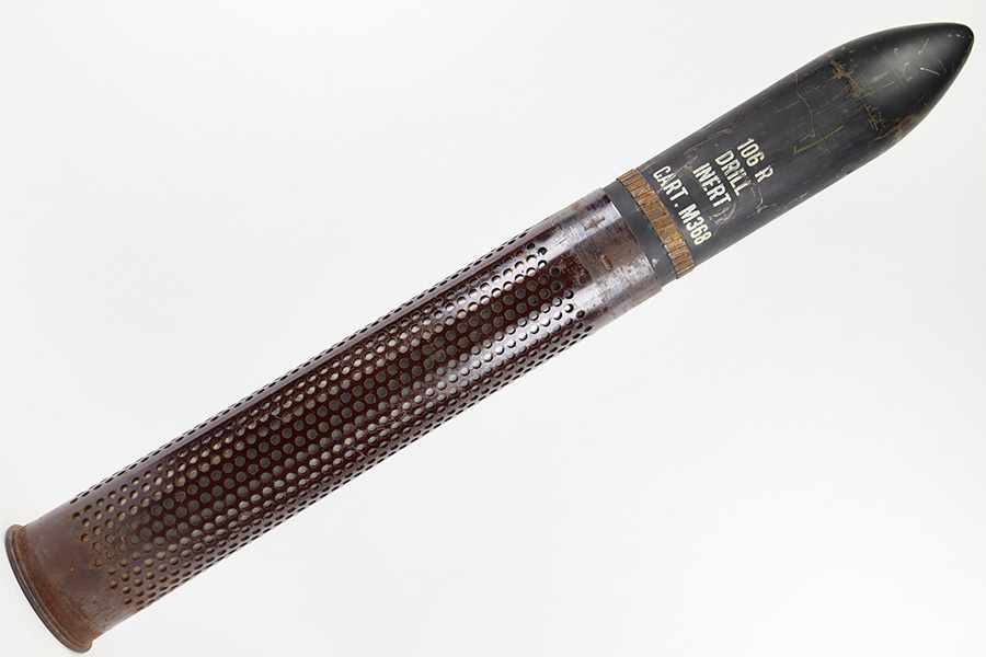 11/6/23 – This is a 106mm M40 Recoilless Round from 1956. These rounds were used in Korea and Vietnam and were considered “Recoilless” due to the vent holes throughout the cartridge, which helped with recoil and allowed gasses to escape more easily from these larger projectiles. This inert round is in great condition with some mild surface rust near the base, but visible head stamps and nicely marked drill projectile added. Measures about 38 inches long and base diameter of about 5 inches.