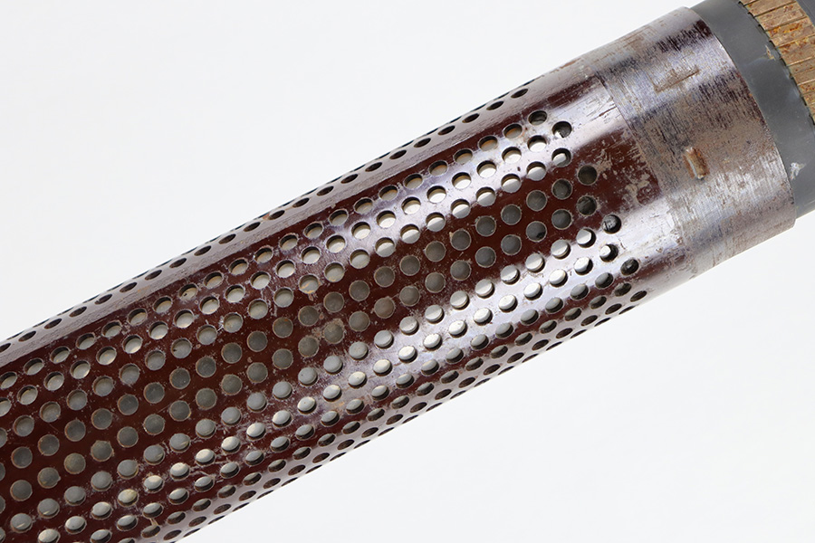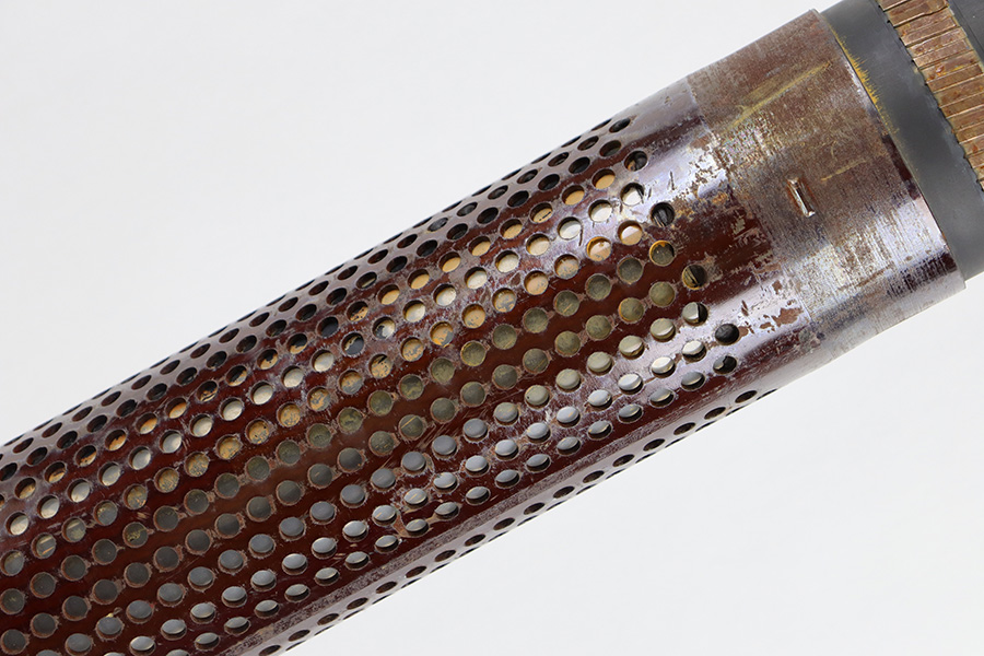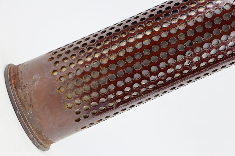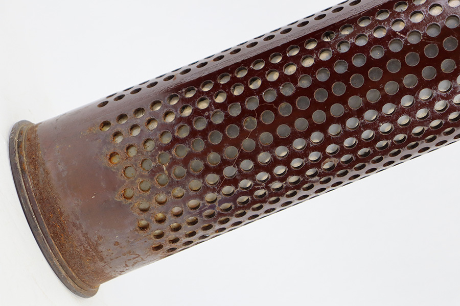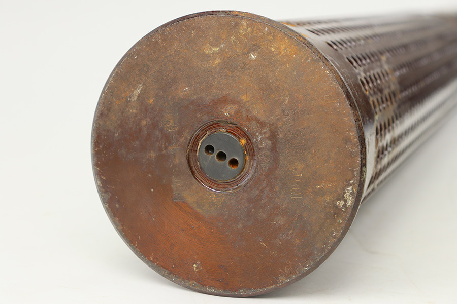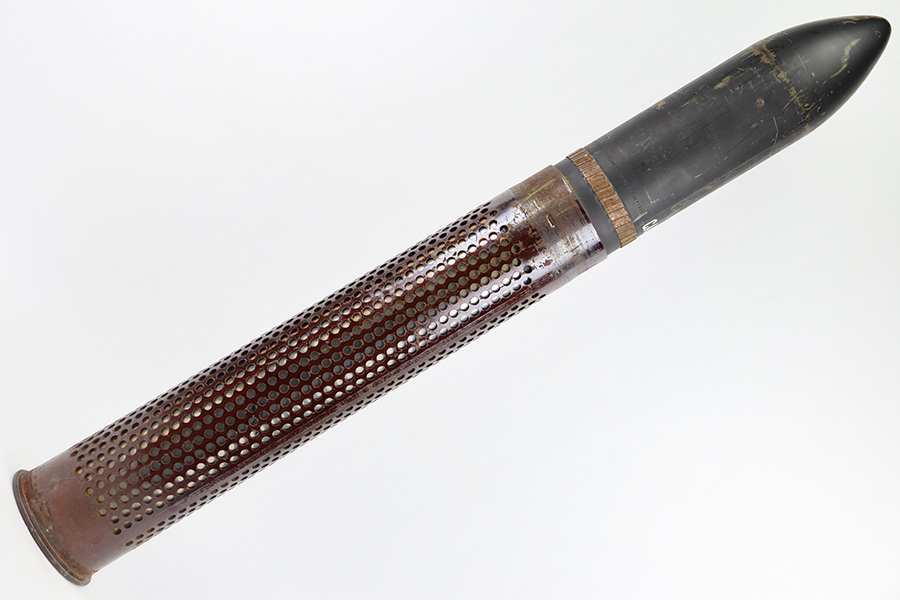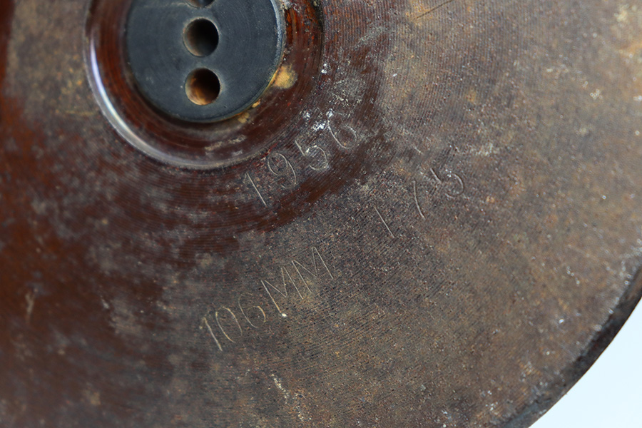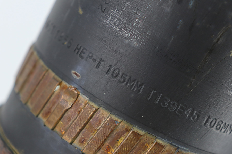 11/6/23 – This is a 106mm M40 Recoilless Round from 1956. These rounds were used in Korea and Vietnam and were considered “Recoilless” due to the vent holes throughout the cartridge, which helped with recoil and allowed gasses to escape more easily from these larger projectiles. This inert round is in great condition with some mild surface rust near the base, but visible head stamps and nicely marked drill projectile added. Measures about 38 inches long and base diameter of about 5 inches.
