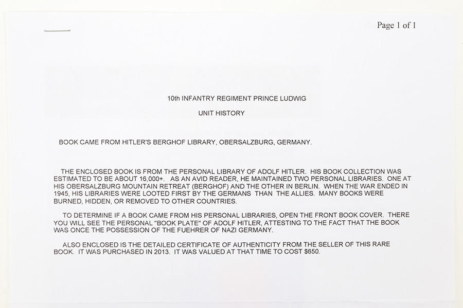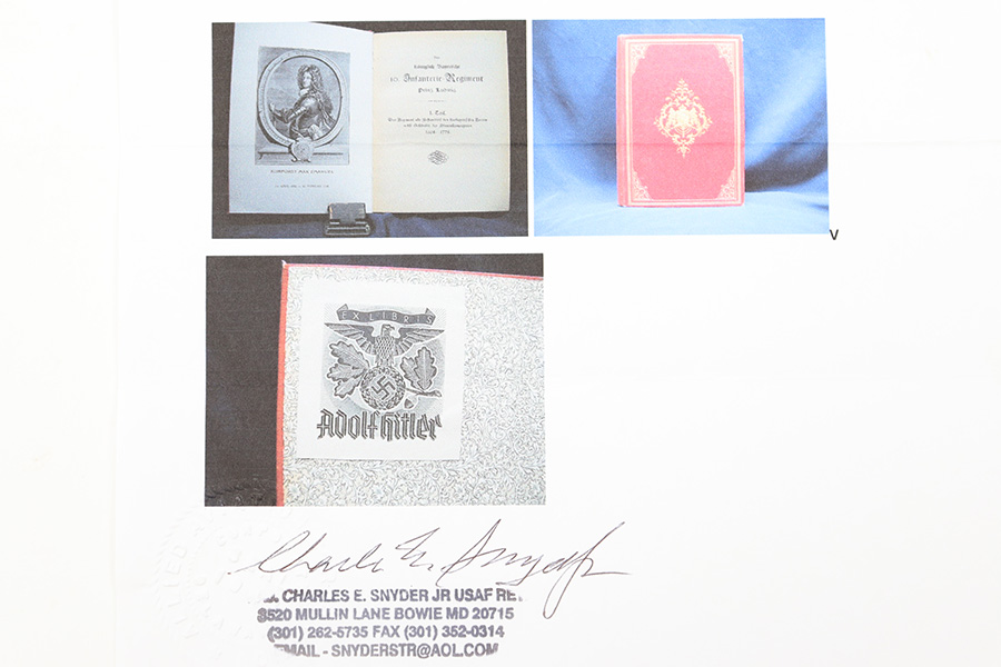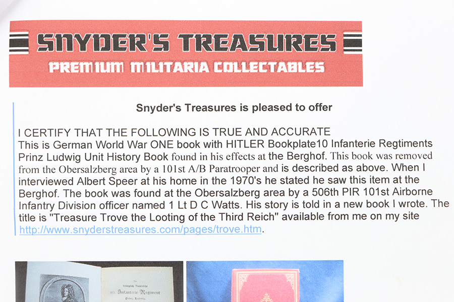 11/20/23 – This is an original WW1 era book, published in 1899, which was part of Adolf Hitler’s book collection / library. This book is cited as coming from his mountain retreat home in Berghof (Obersalzburg). The interior cover page has a peronalized “Book Plate” for Adlof Hitler. Also included with this book is a COA from Synder’s Treasures, as well as some writeup on the book’s history with a 2013 price estimate of $650. The books is in great condition with all pages intact. There’s some light wear and natural aging throughout. The binding is excellent. The exterior cover has mild scuffing and light surface wear as shown. The book is about the 10th Infantry Regiment and the Unit’s History.
