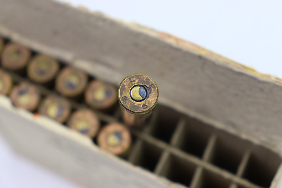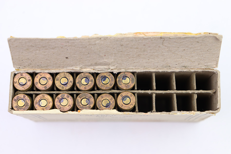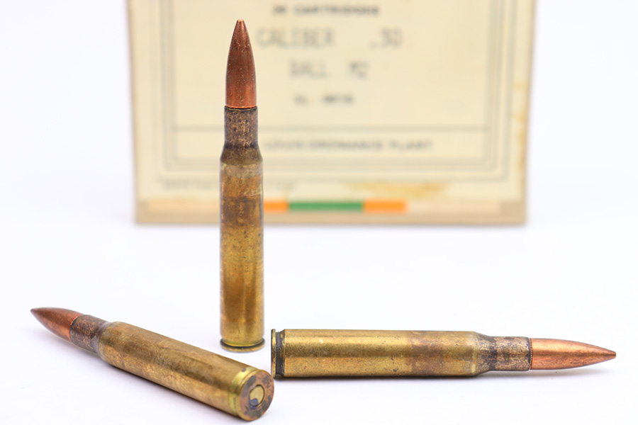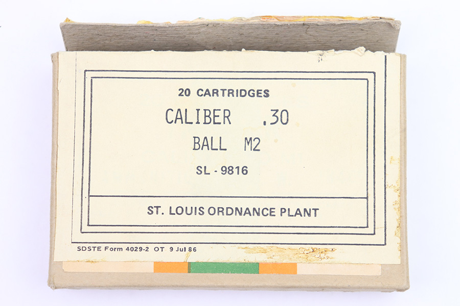 8/3/22 – This is a box of 12 rounds of .30 Ball M2 ammunition from St. Louis Ordnance Plant. The box is dated 1986. All rounds are in great condition as shown.