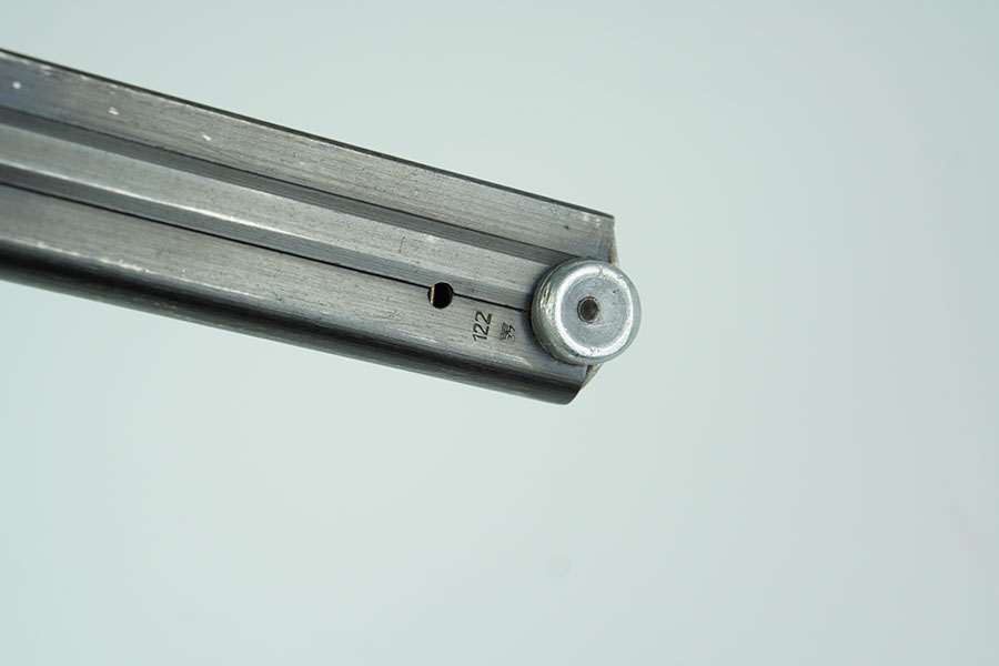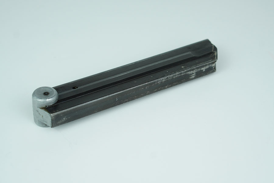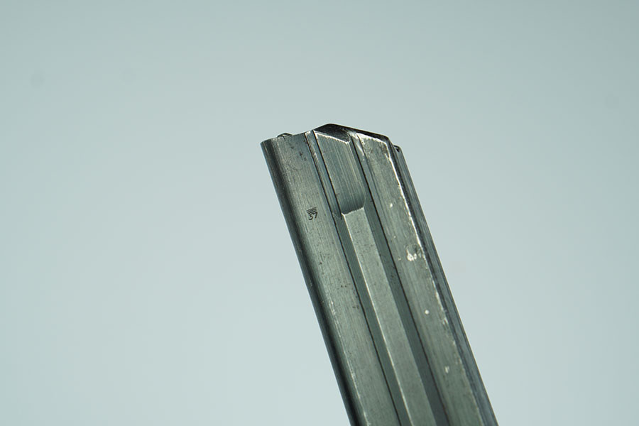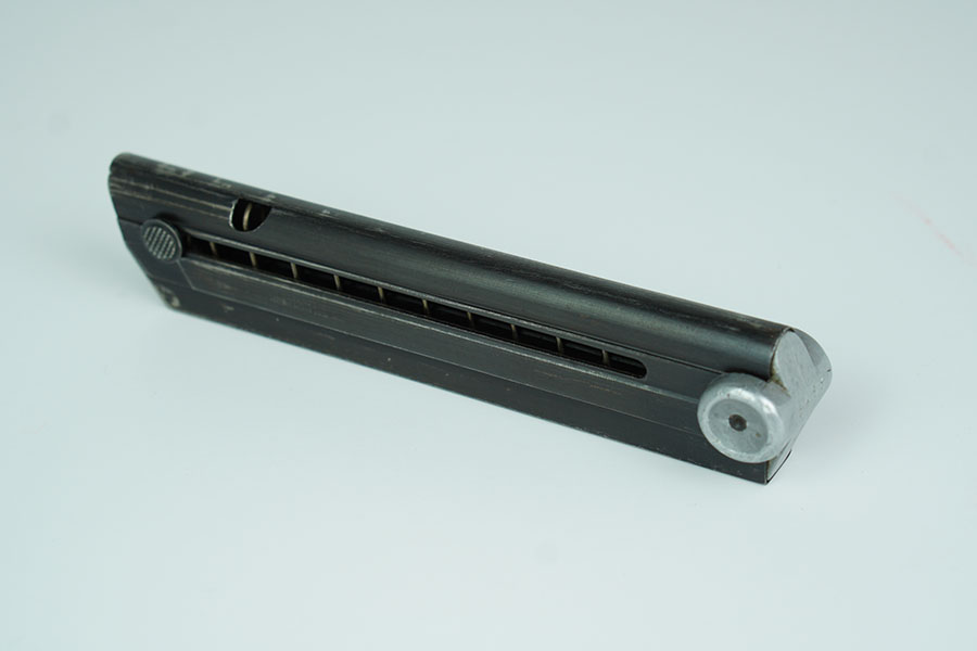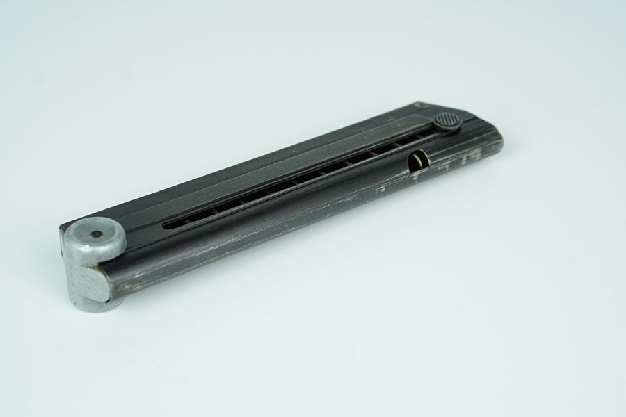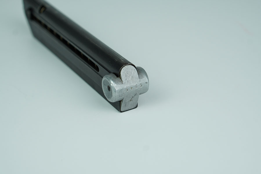 1/22/24- This is an original WW2 production luger magazine. 122 code stamped on the frame along with two eagle/37 proof stamps. The aluminum base is numbered 5463i. Some minor bluing loss on the front and the spine of the magazine. Overall in great shape with a strong fully functional spring.