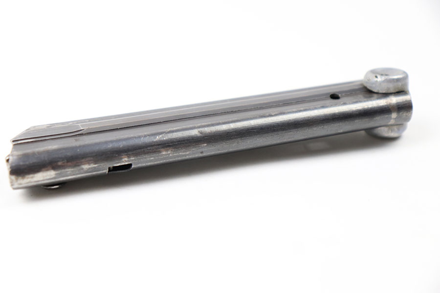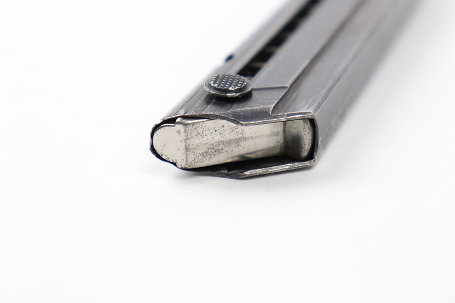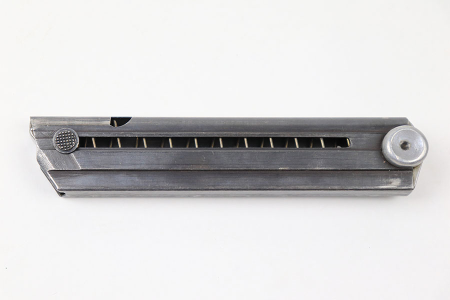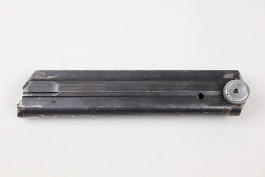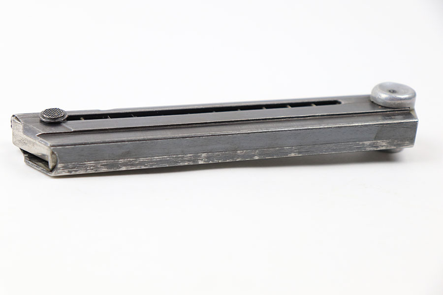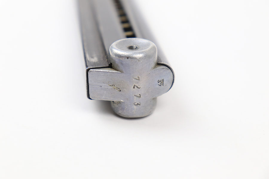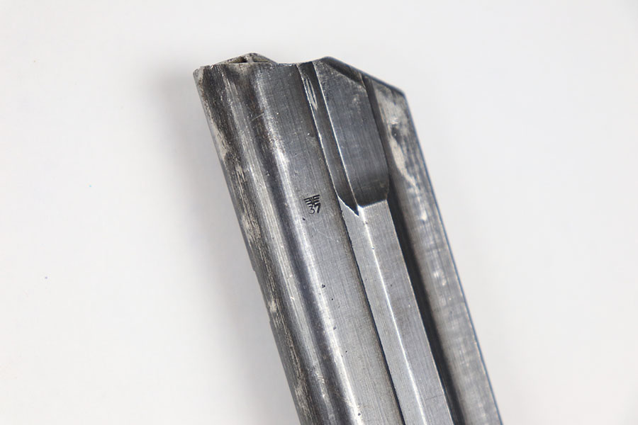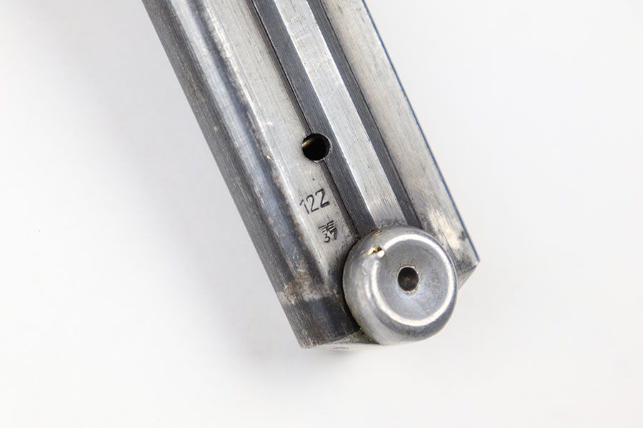 9/2/21 – This is a very nice condition 122 code Luger magazine made by Haenel during WW2. The magazine is 122 stamped on the tube along with two eagle 37 proof stamps. There’s a third eagle 37 proof on the base of the magazine, which is also serial numbered as shown. 7273f. Some mild thinning on the finish but no major wear, and a fully functional spring.