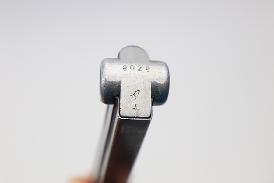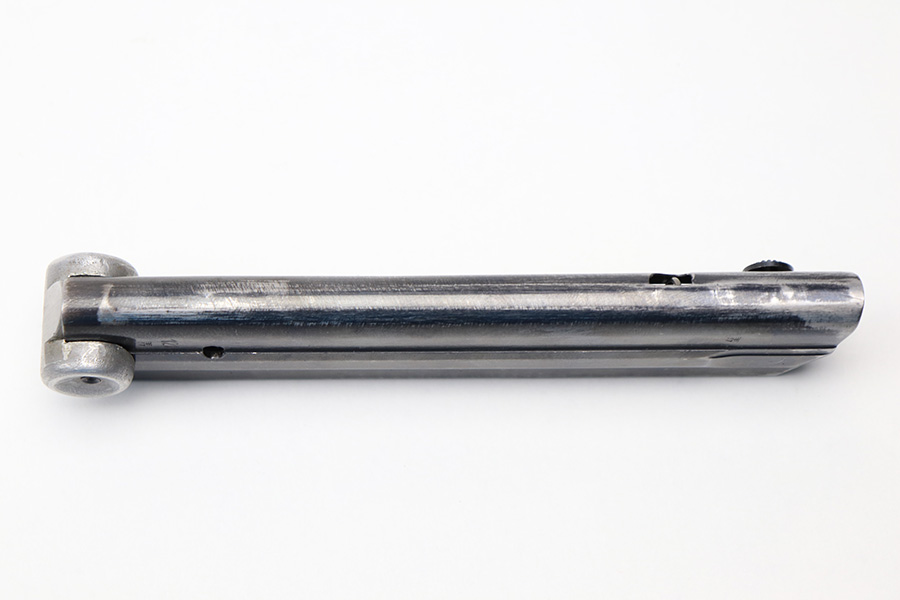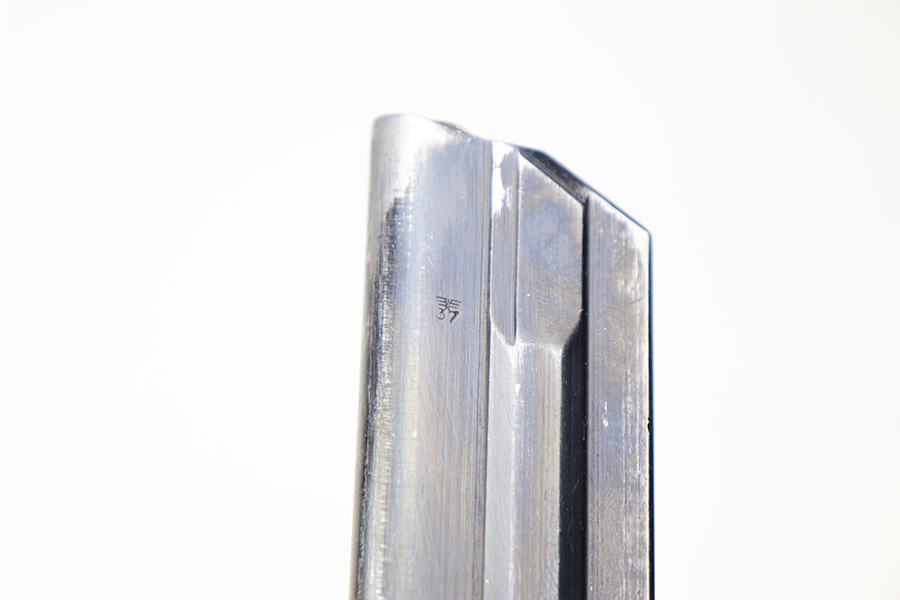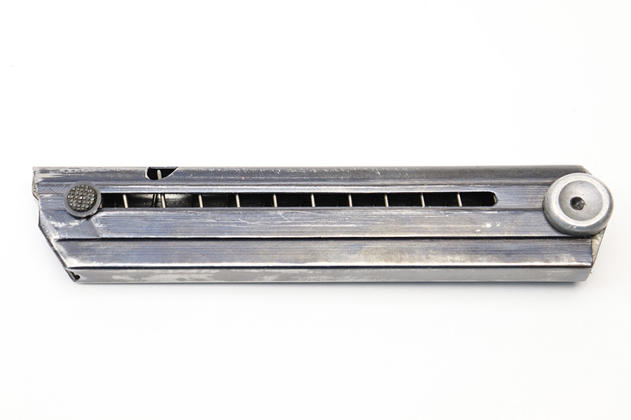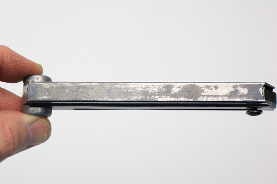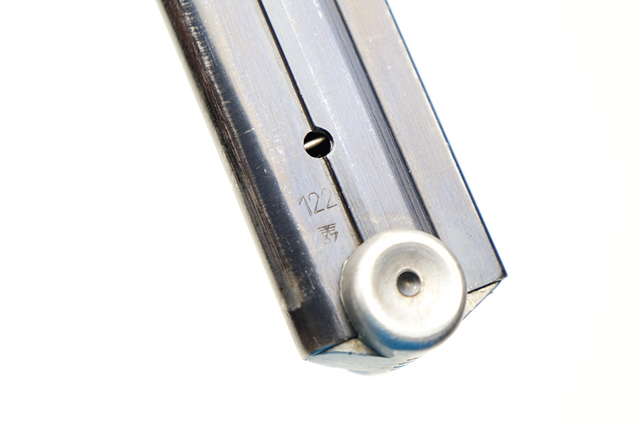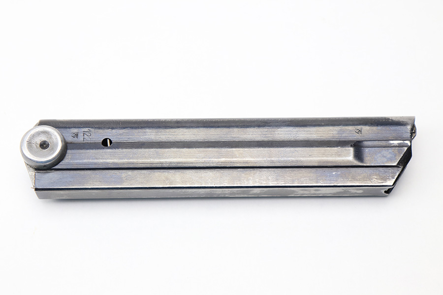 3/25/22 – This is an original WW2 Luger magazine by Haenel. The magazine has a blued tube and aluminum base. The base is serial numbered 8028g with a “+” sign. The tube has some spots of finish loss but no rust or pitting. The tube is 122 code stamped with two eagle 37 proofs. The spring is strong and functional.