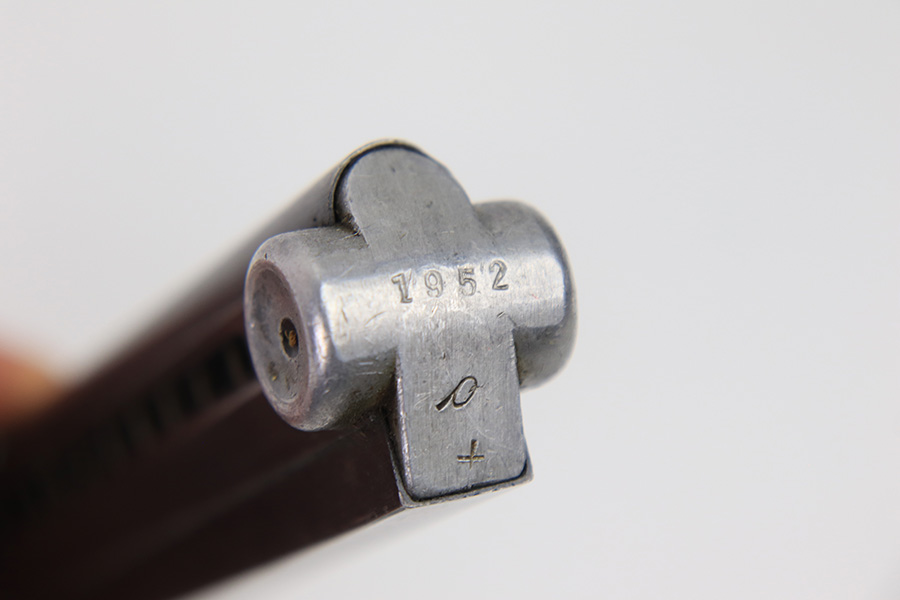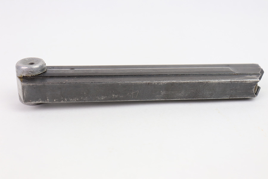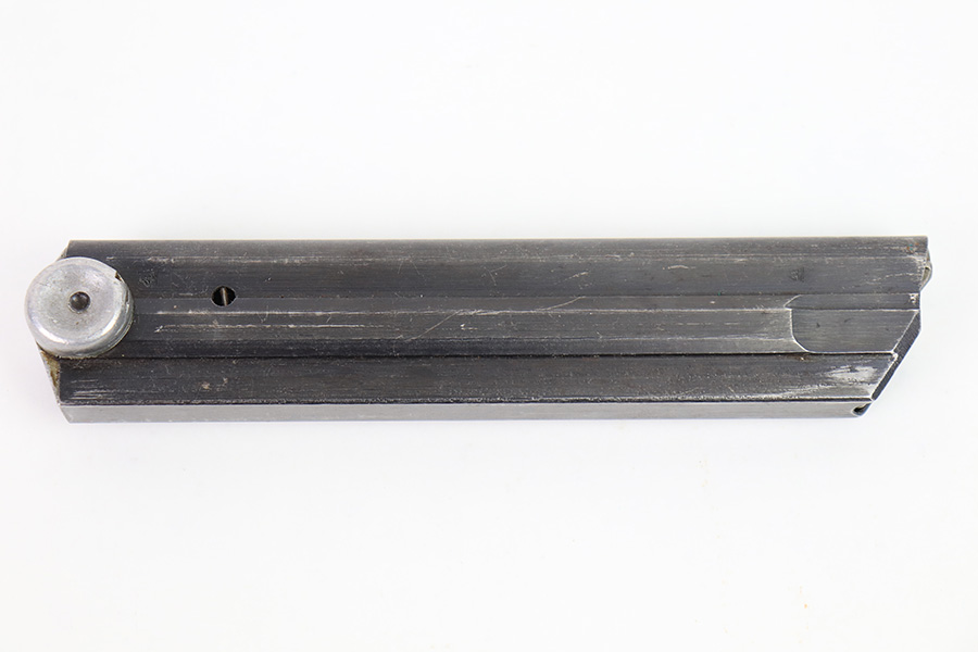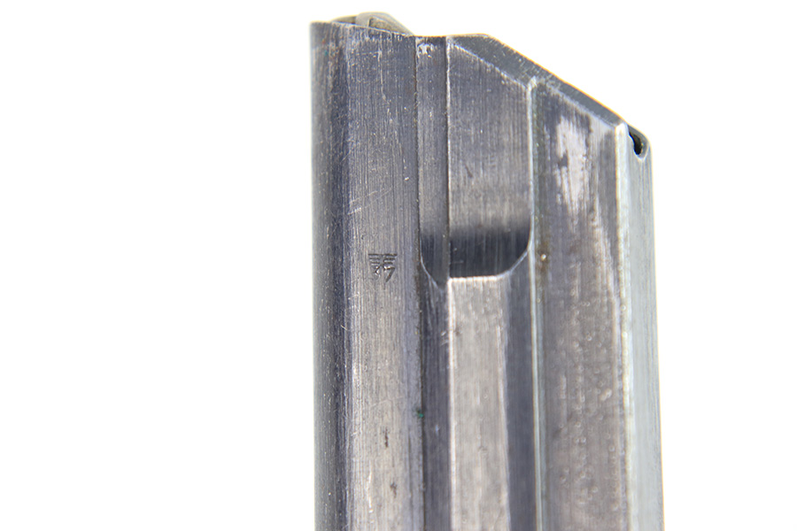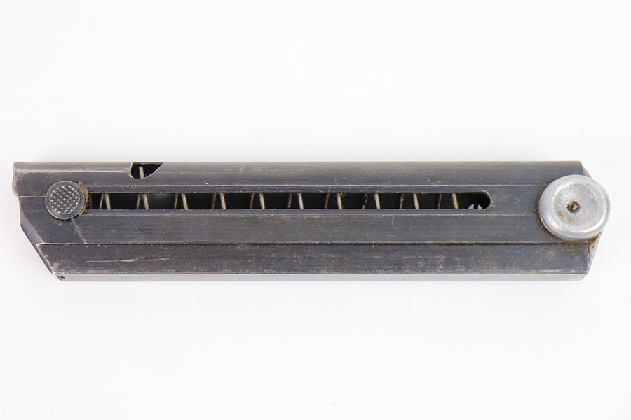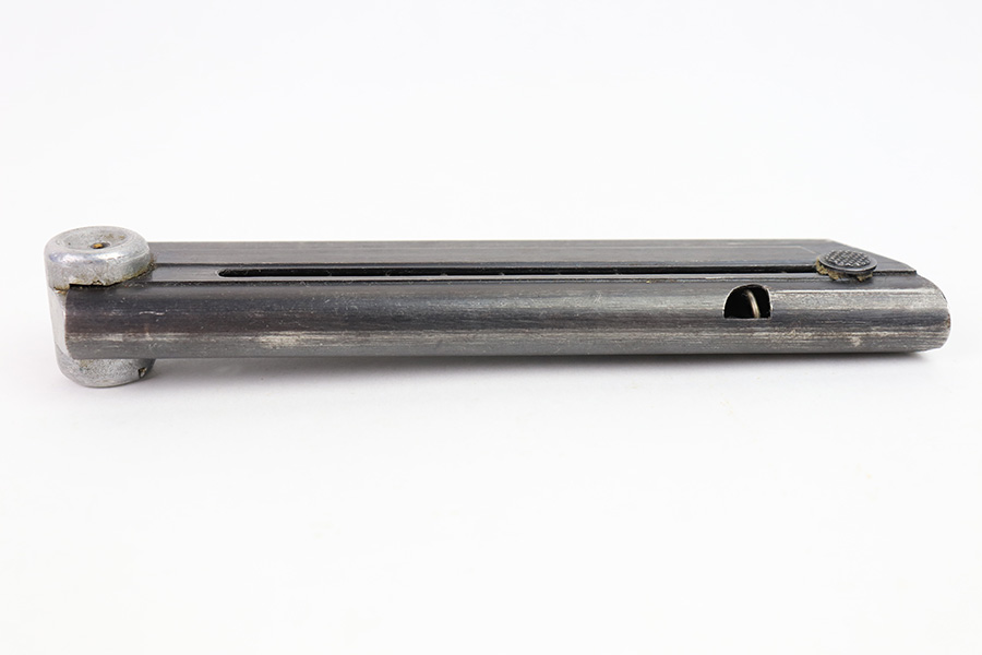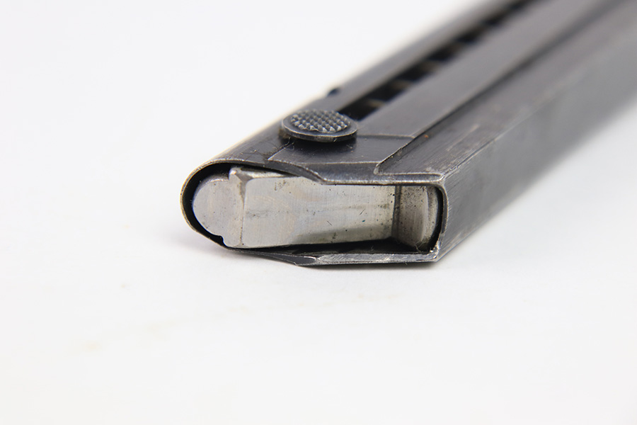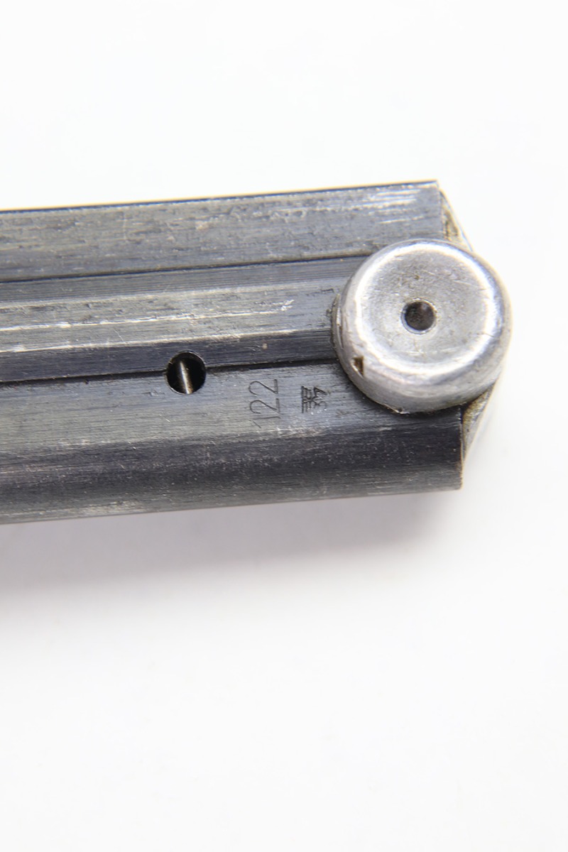 12/27/22 – This is an original WW2 production Luger magazine. The magazine is wartime production for Lugers made between 1940 and 1942. The blued tube is “122” code stamped by Haenel and has two eagle 37 proof stamps. There’s mild finish loss and no rust or pitting on the tube. The aluminum base is serial numbered. Fully functional spring.