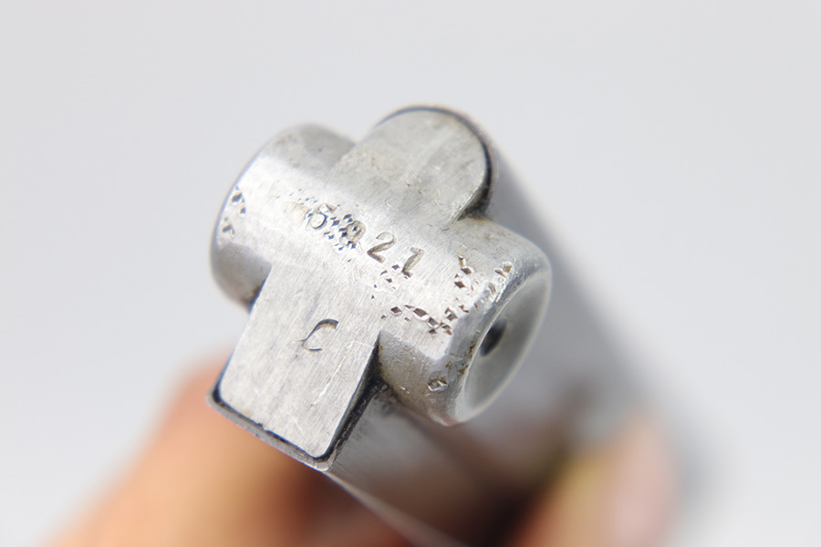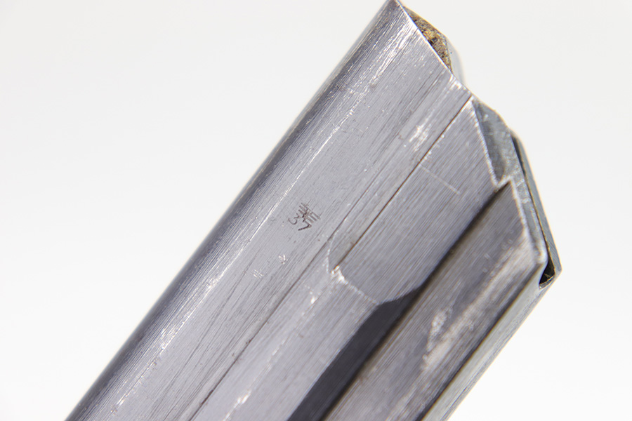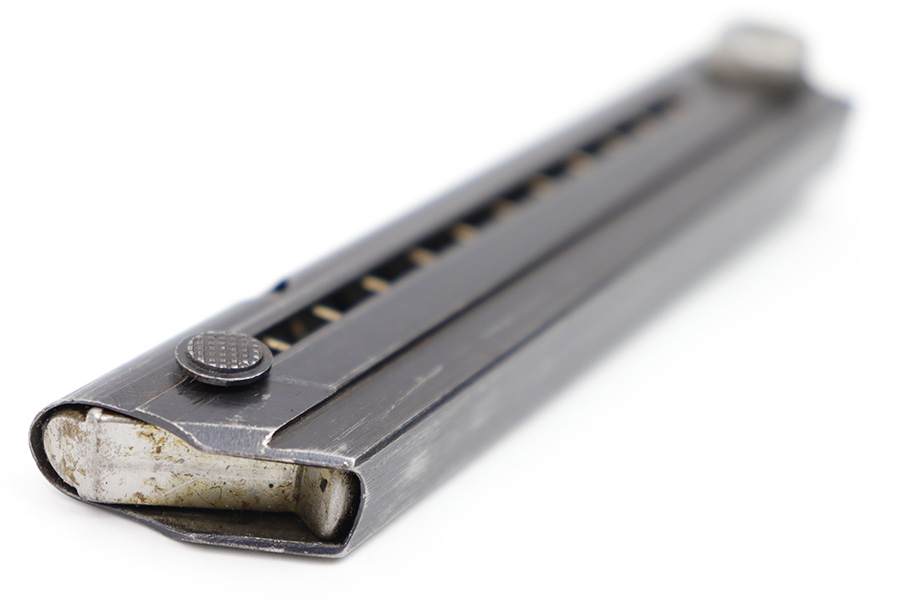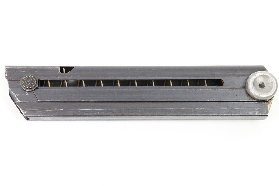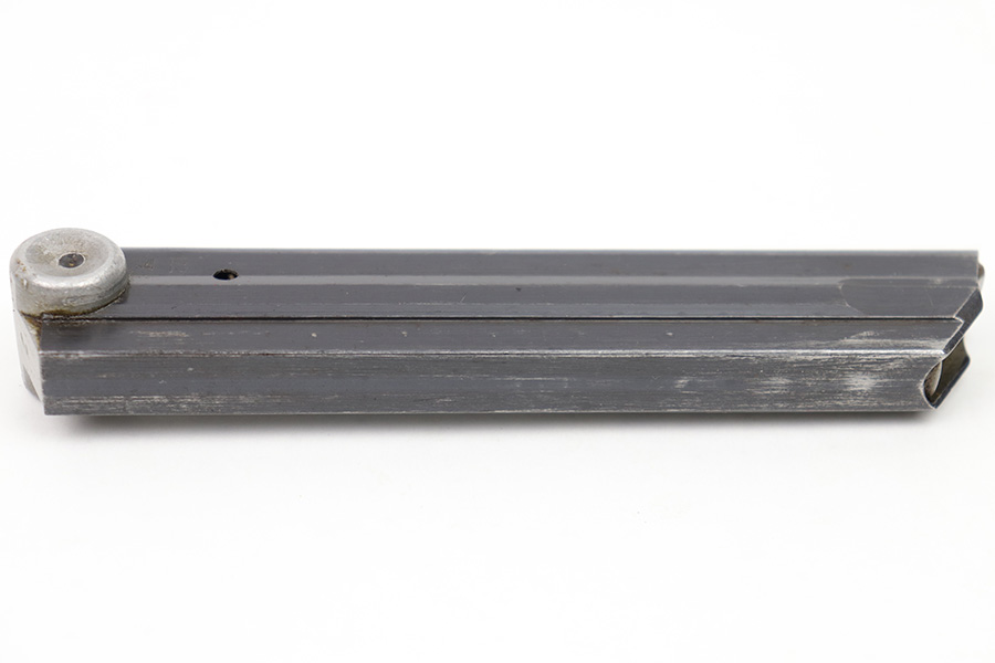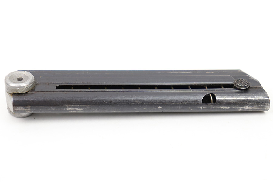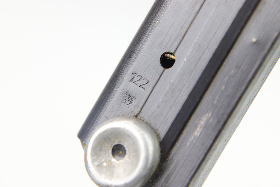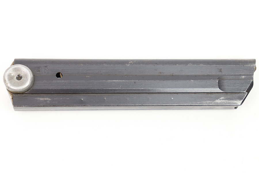 2/7/23 – This is an original WW2 production Luger magazine by Haenel. The magazine tube is blued and stamped with a “122” maker code, and two eagle 37 proof stamps. The bluing is excellent throughout the magazine tube with some mild surface patina. The base of the magazine is serial numbered, but there’s some mild rub wear and a few small dents / imperfections that make the number hard to read. The spring is strong and fully functional.