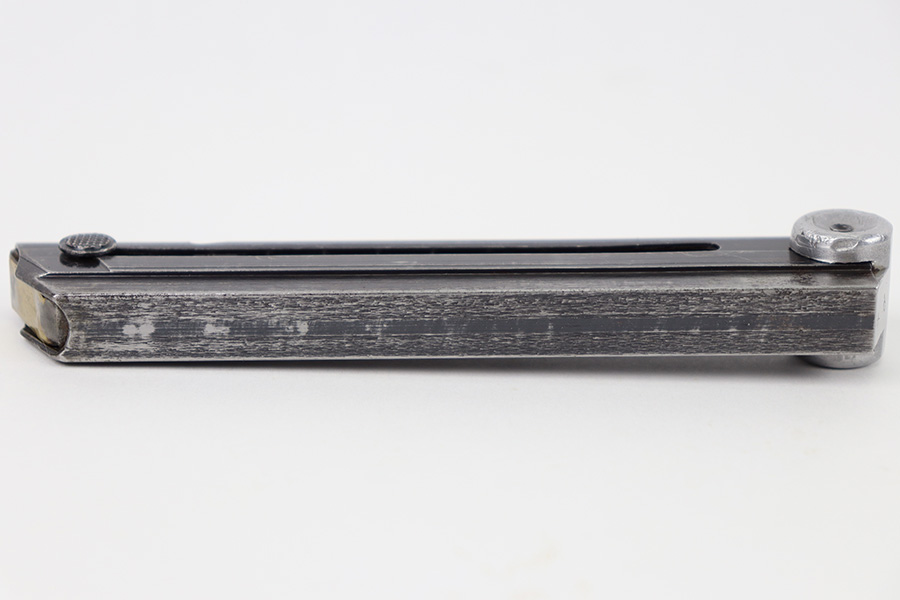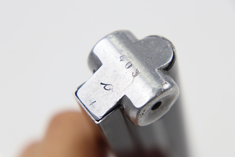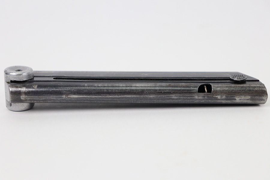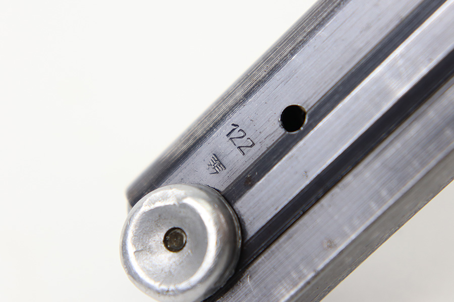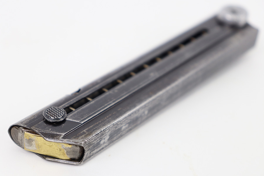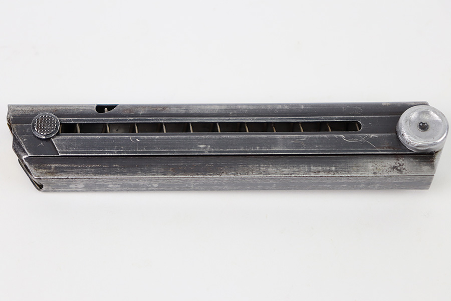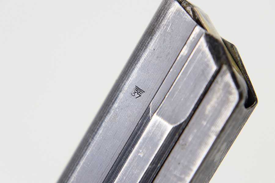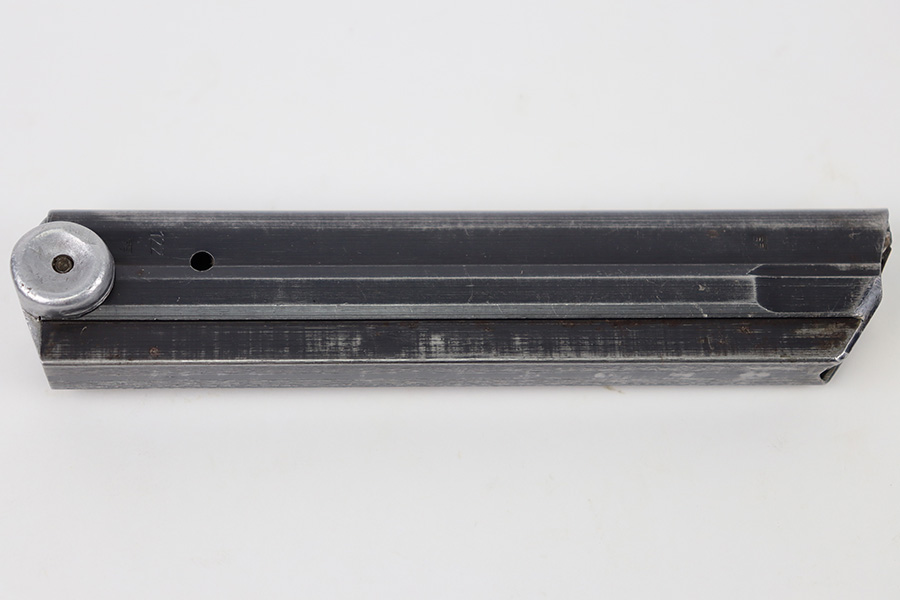 10/24/23 – This is an original WW2 production Luger magazine. The magazine has a blued tube and aluminum base. The tube is “122” code maker stamped by Haenel, along with two eagle 37 proof stamps. The base is serial numbered 403 o. Strong, functional spring. Great overall condition.