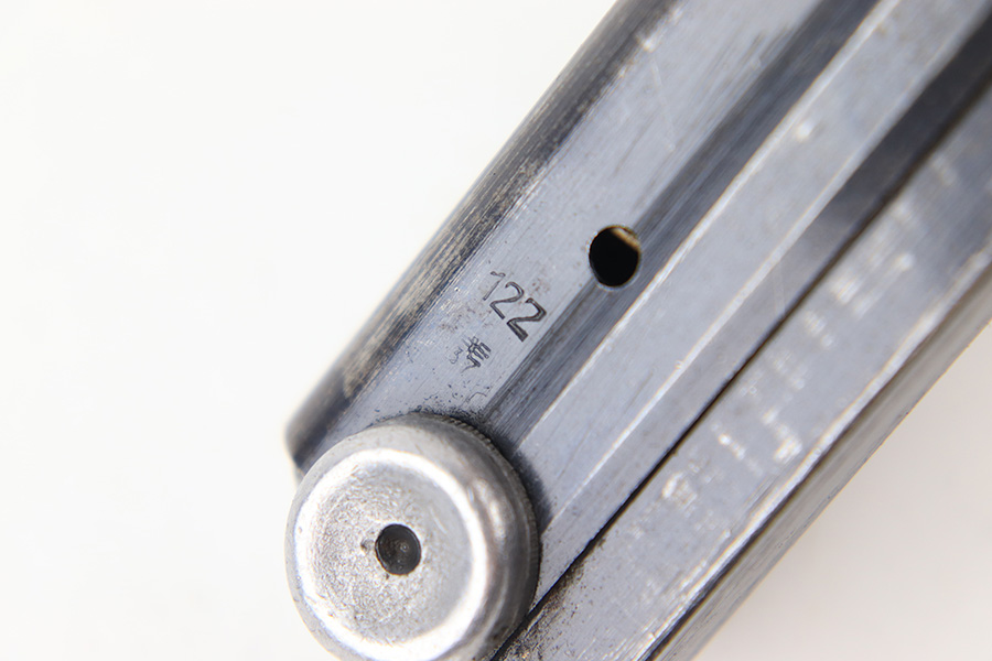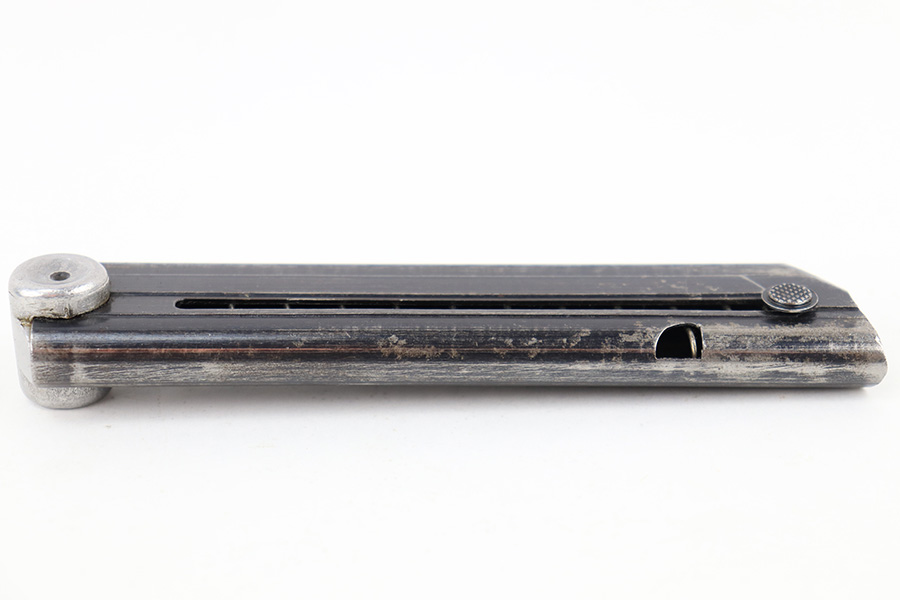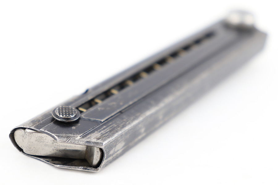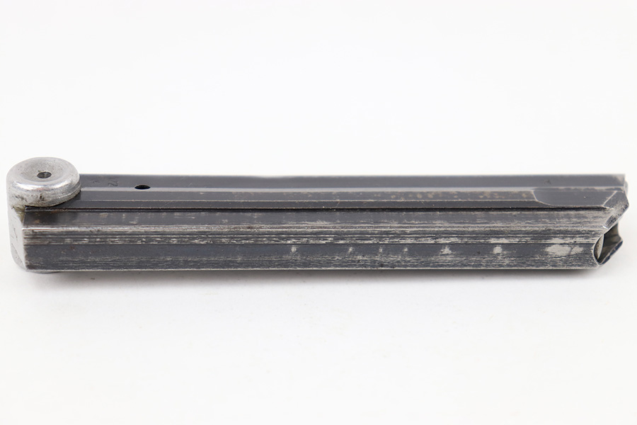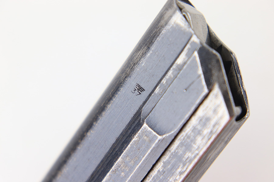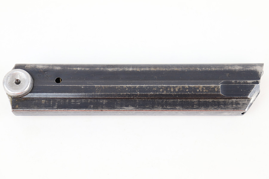 7/26/23 – This is an original “122” code stamped Luger magazine from WW2. The tube is eagle 37 proof stamped twice, on the left side of the tube. There’s finish loss throughout but no rust or pitting and most of the original bluing is intact. The base is serial numbered 7999b. The spring is strong and functional.