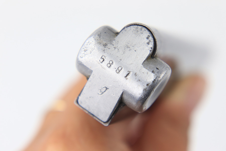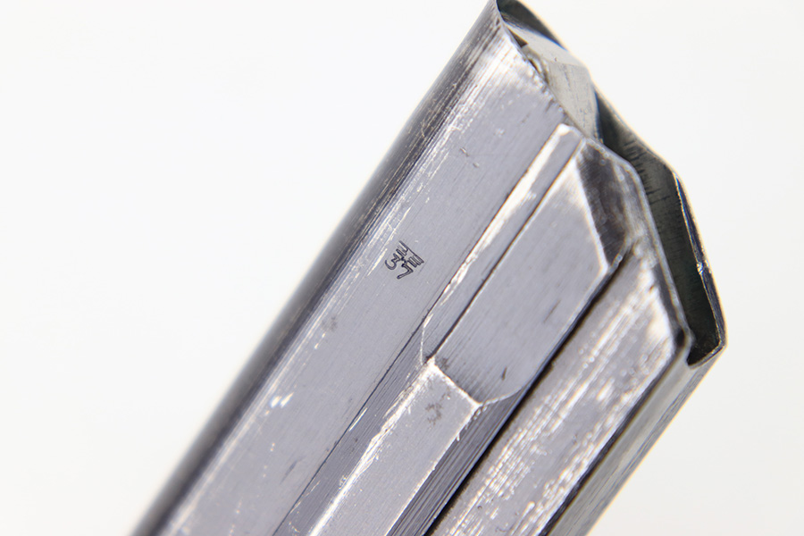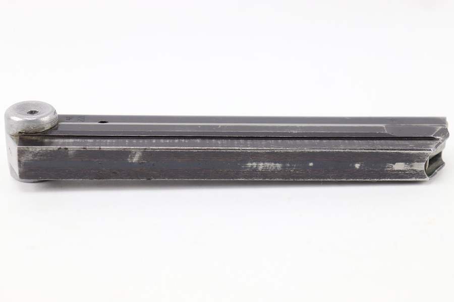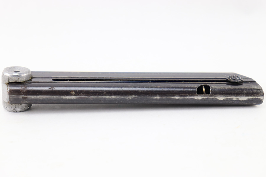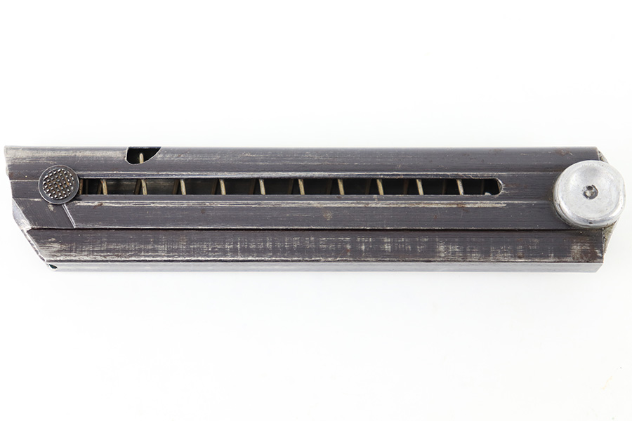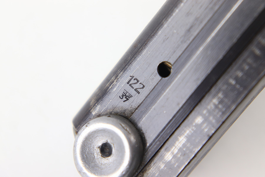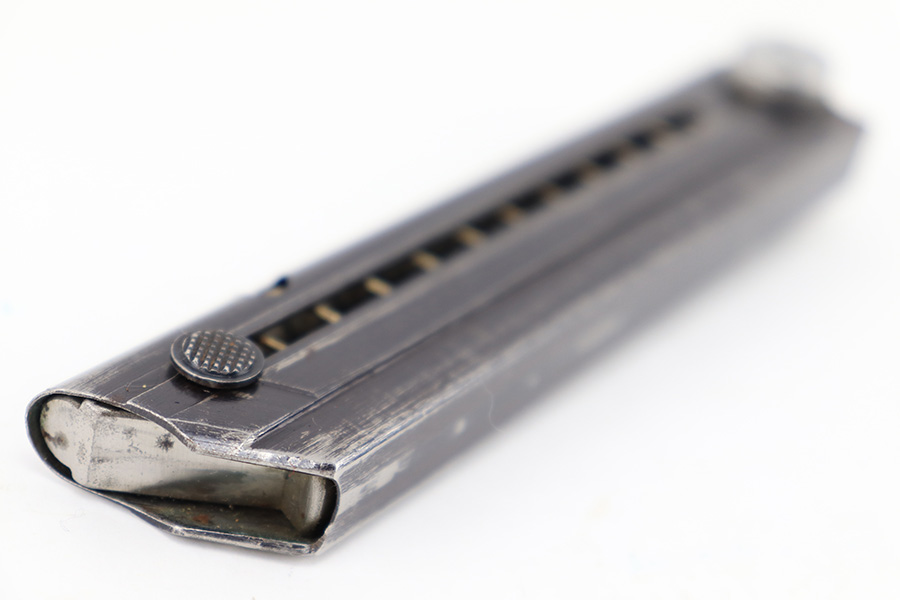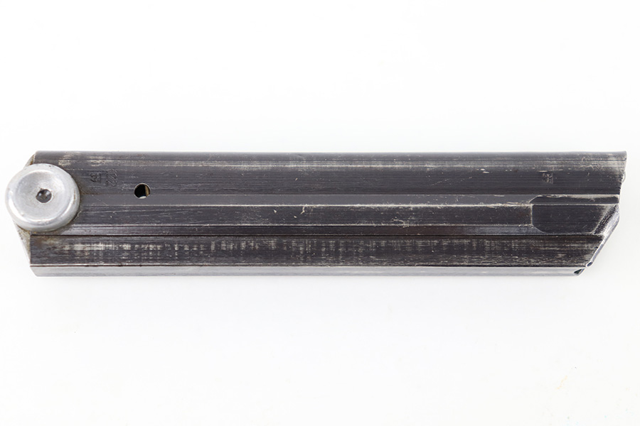 8/11/23 – This is an original WW2 production Luger magazine. The magazine has a blued tube and aluminum base that’s serial numbered 5891g. The tube has some mild finish loss and surface patina but no rust or pitting. Stamped with a “122” code with two eagle/37 military proof stamps. The spring is strong and fully functional.