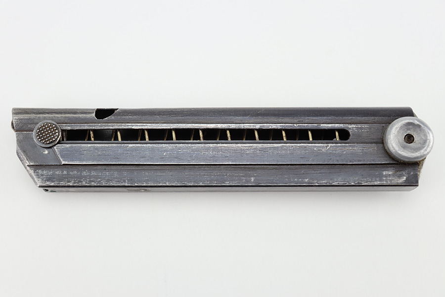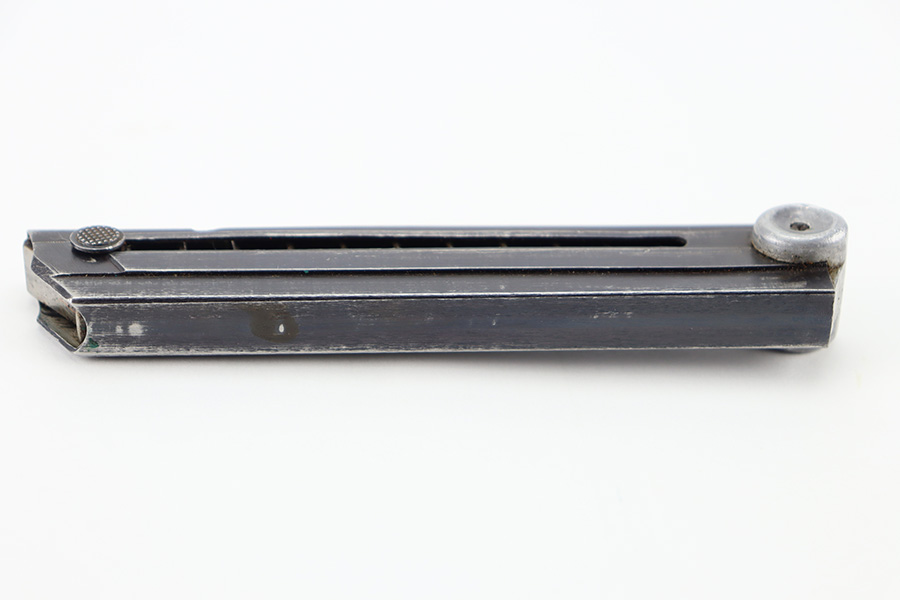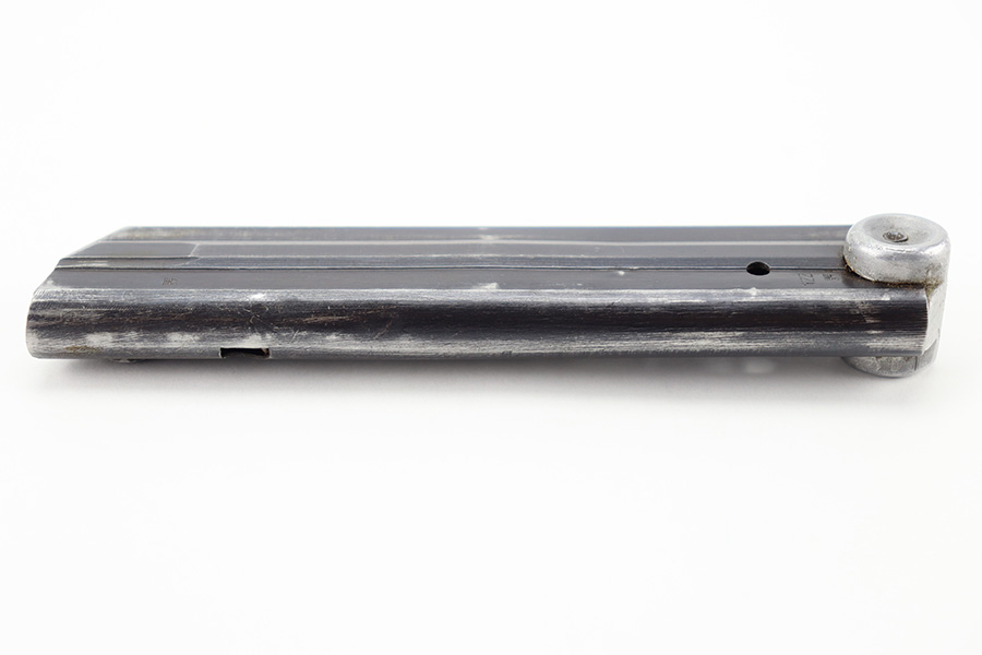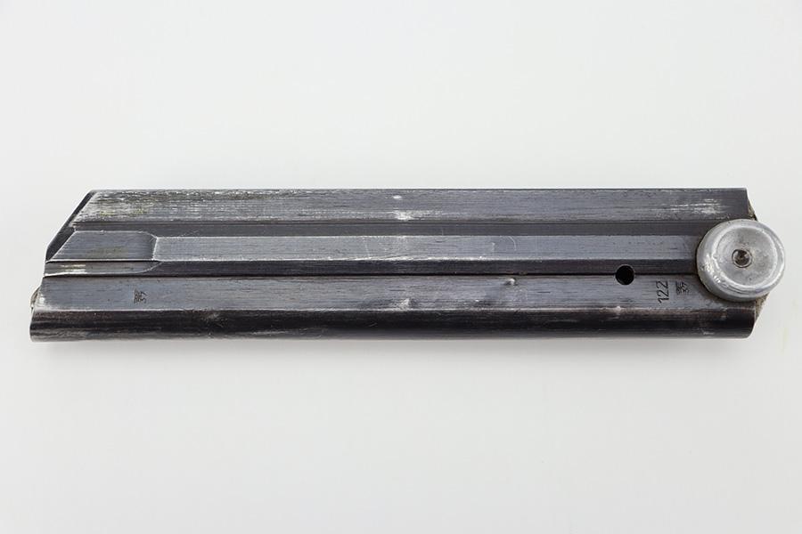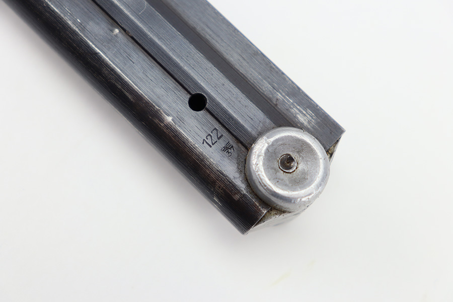 11/16/23 – This is an original “122” code Luger magazine made by Haenel towards the end of Luger production during WW2. The magazine has a blued tube and aluminum base. The tube is in great shape with light thinning and mild finish loss. There are two eagle/37 military proof stamps on the tube, along with a 122 code stamp. The base has been serial numbered, but the serial number is hard to read (5521 i). There’s small dents in the base, but this doesn’t affect functionality. Strong, smooth spring.