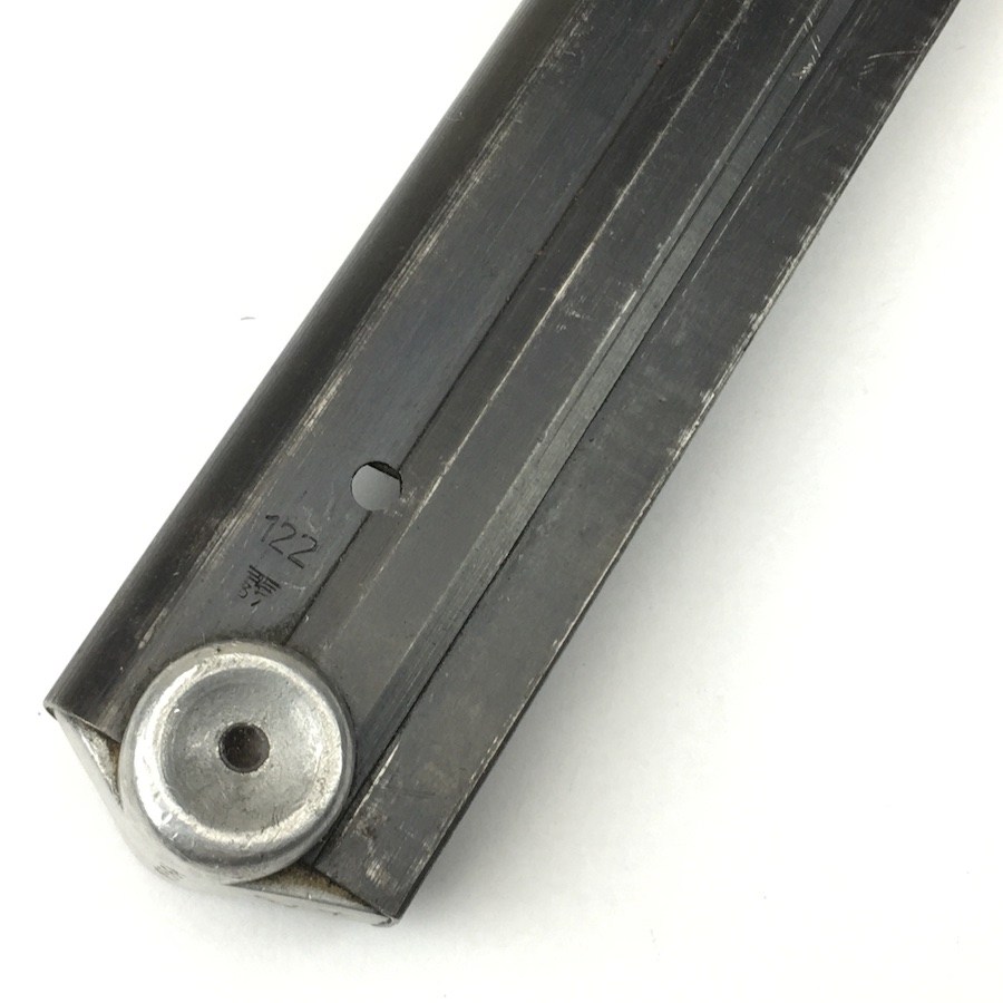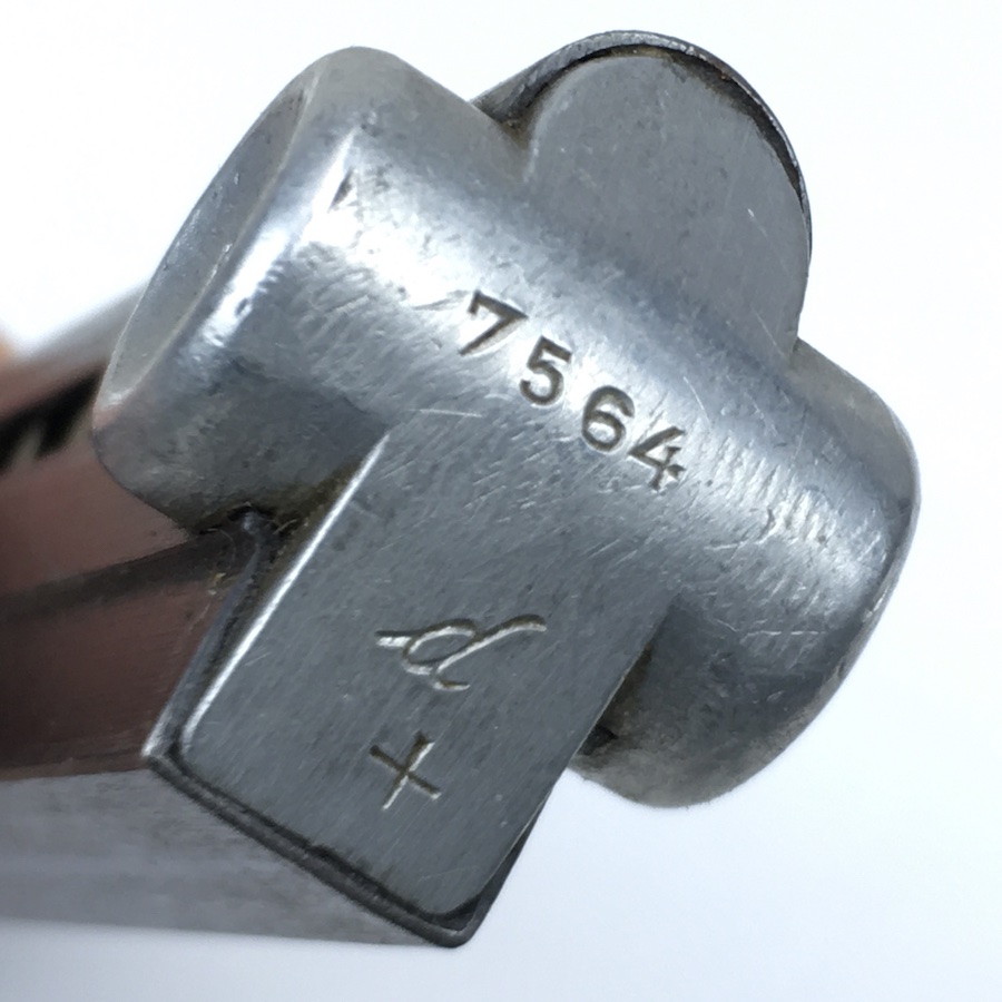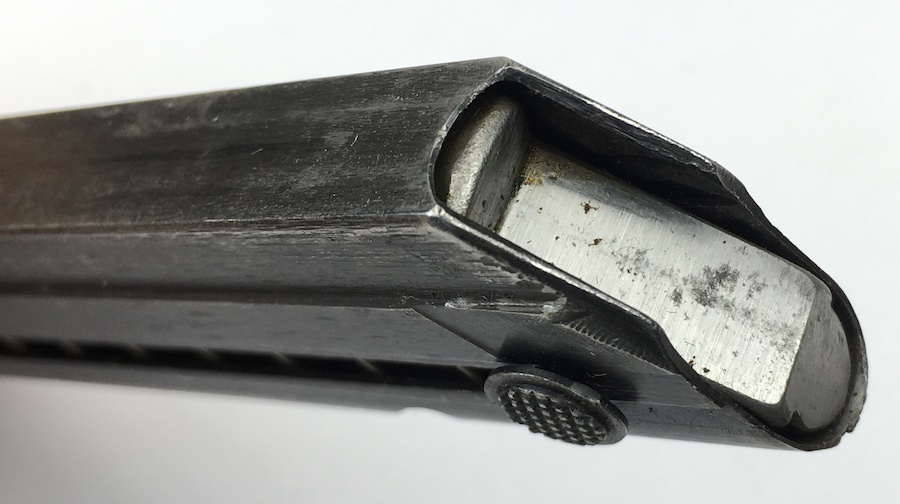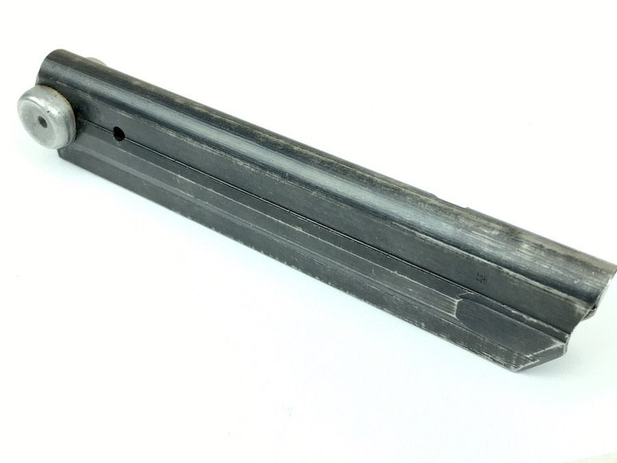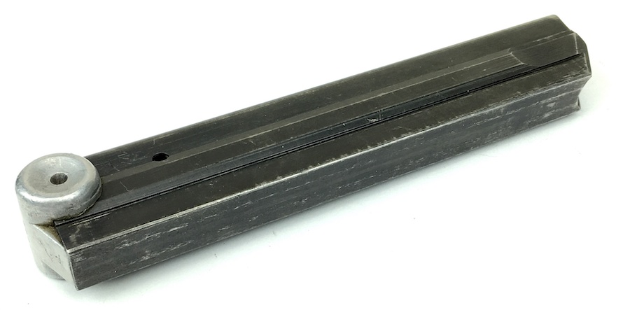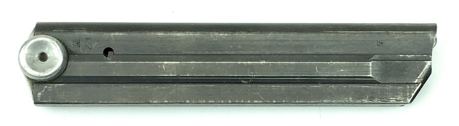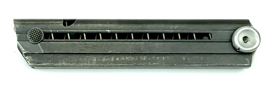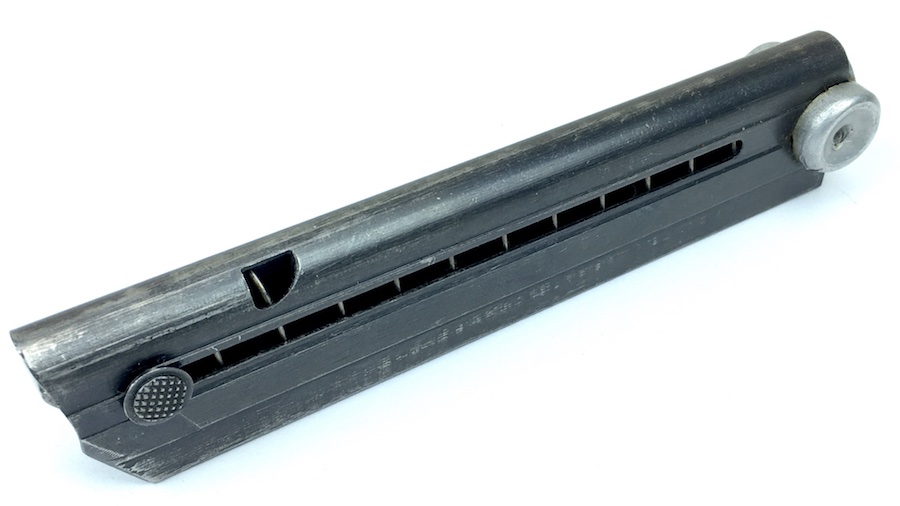 12/27/19 – This is an original Mauser Luger magazine from WW2. The magazine frame has a “122” code stamp on the left side with two eagle/37 proof stamps as well. The base of the magazine is aluminum and stamped “7564 d”. This is a completely original and fully functional WW2 military magazine. No rust or pitting, and a strong spring.