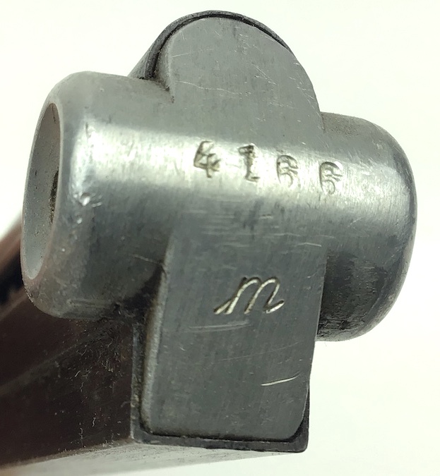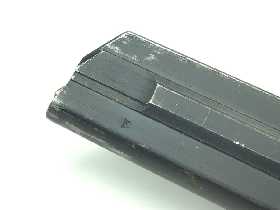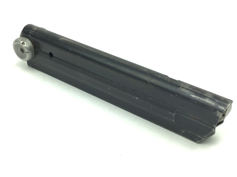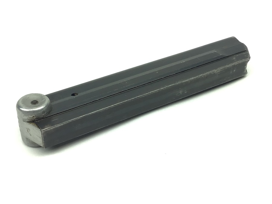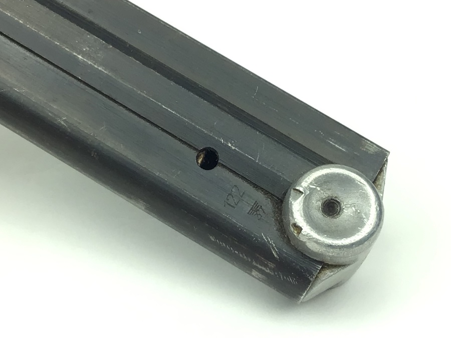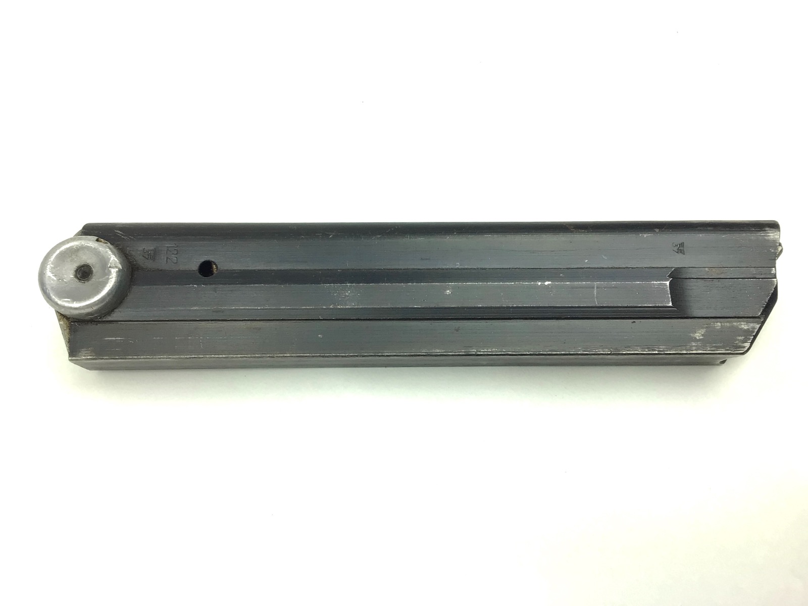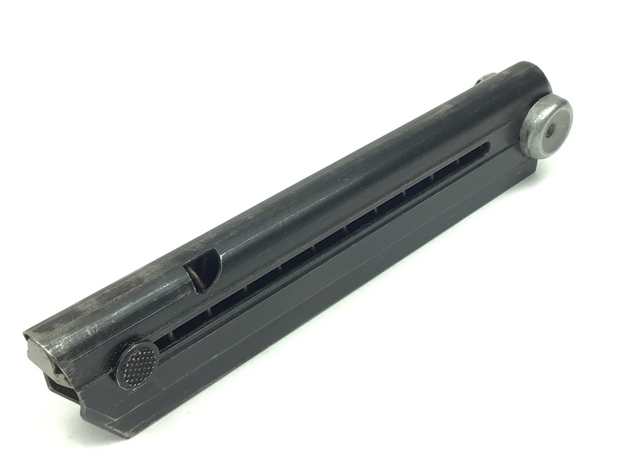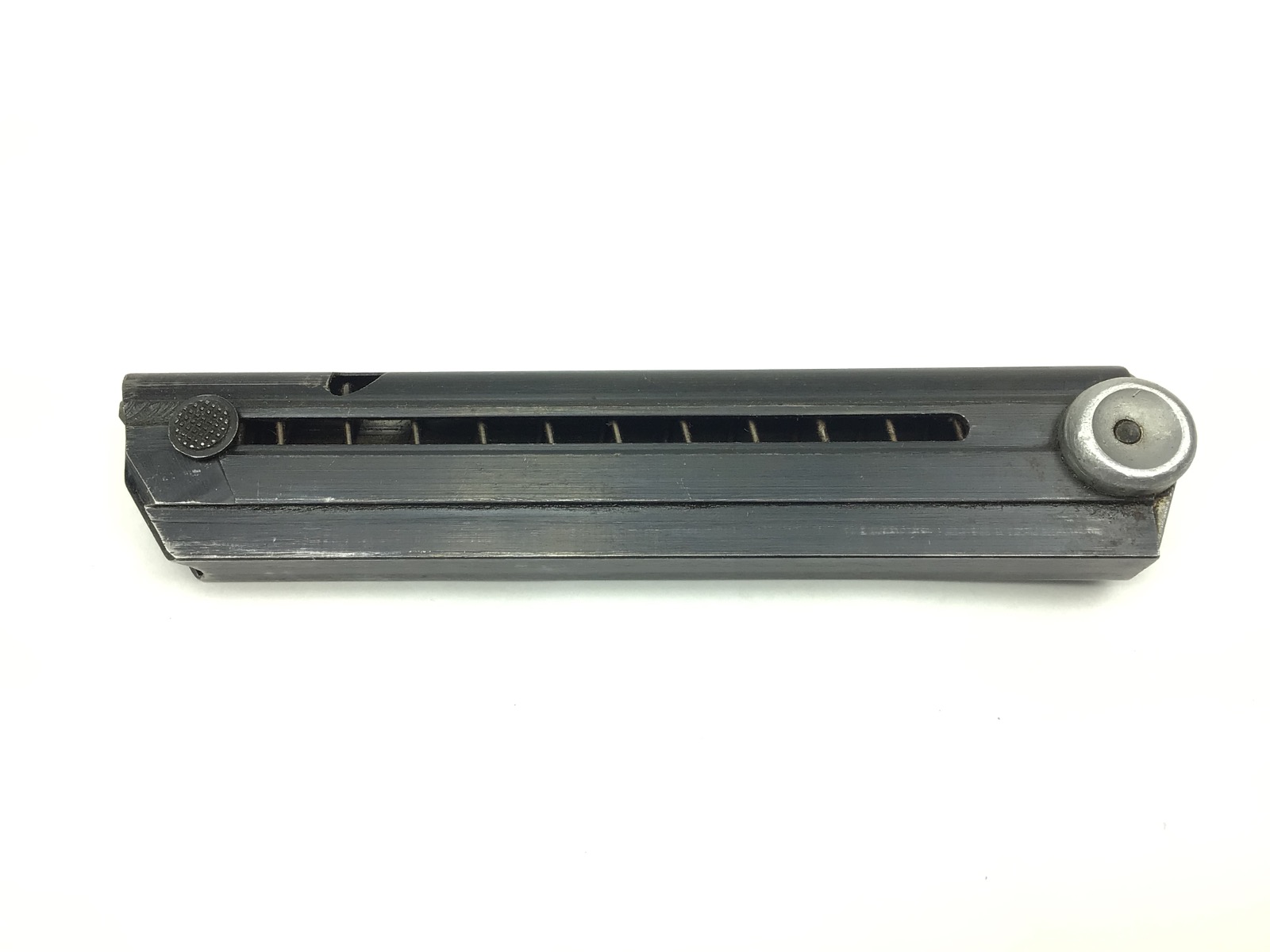 11/3/20 – This is an original Mauser Luger magazine from WW2. The magazine frame has a “122” code stamp on the left side with two eagle/37 proof stamps as well. The base of the magazine is aluminum and stamped “4166 m”. This is a completely original and fully functional WW2 military magazine. No rust or pitting, and a strong spring.