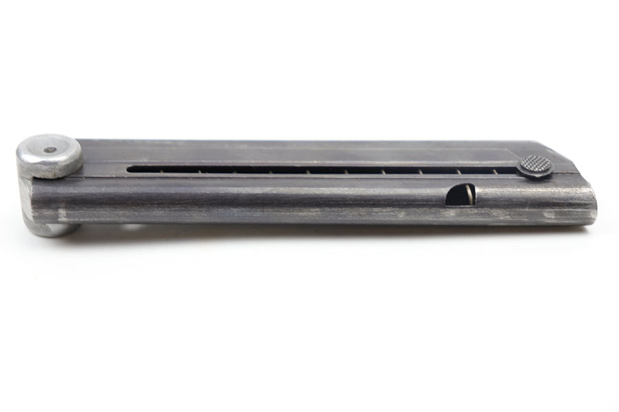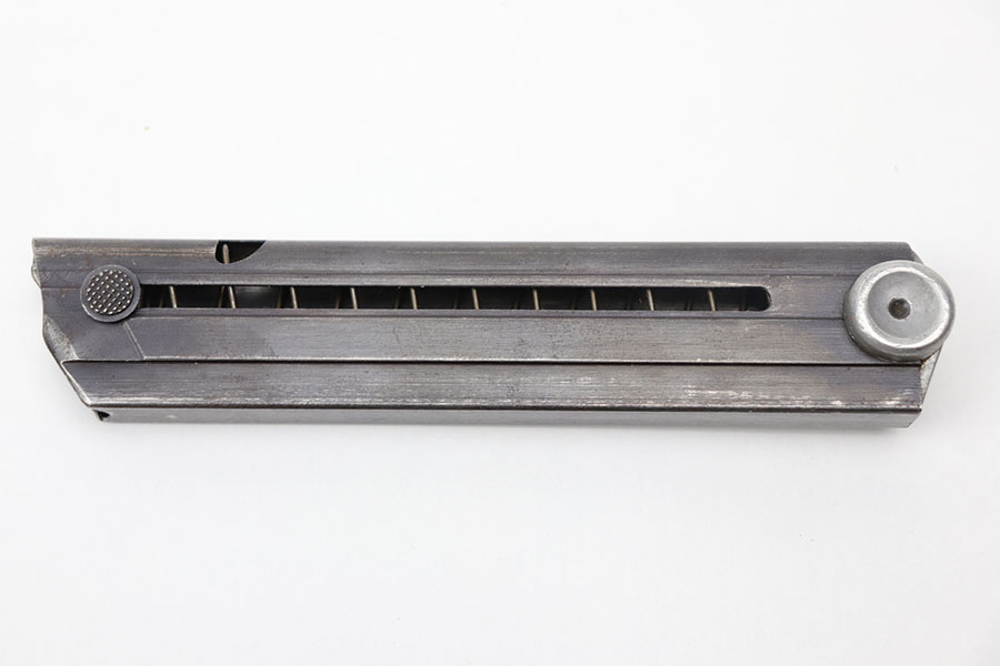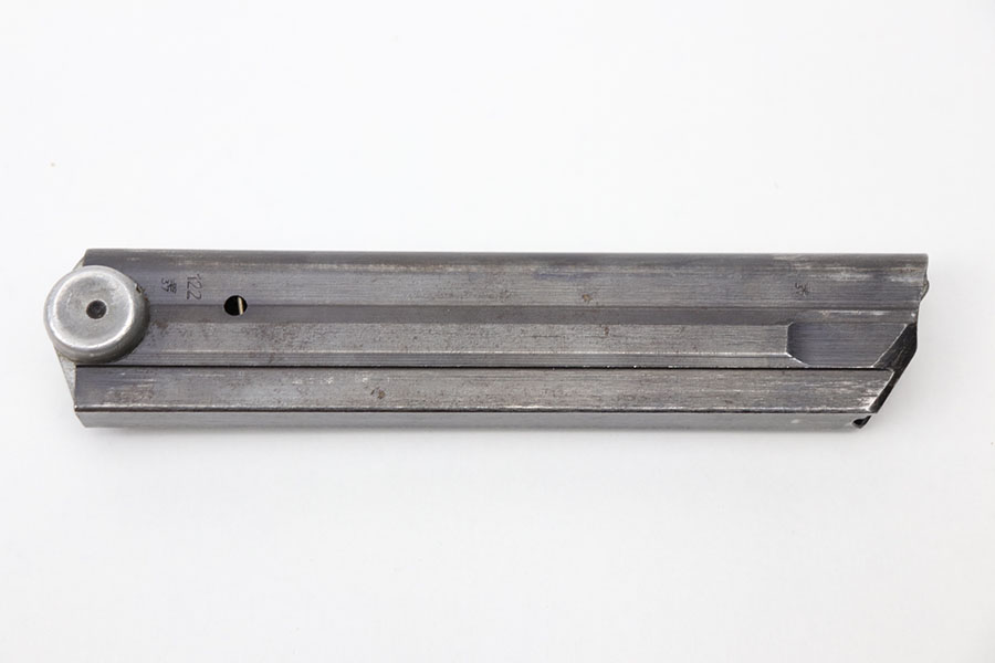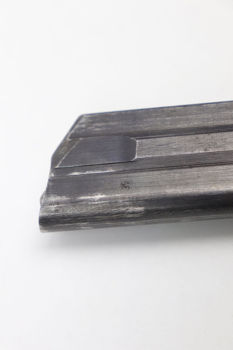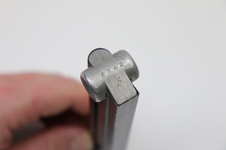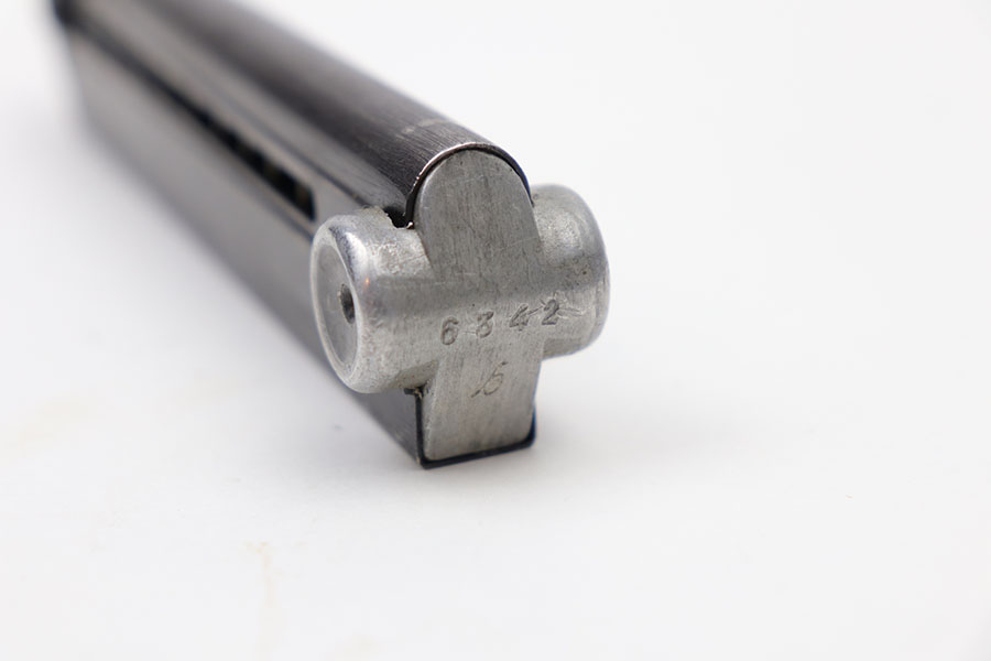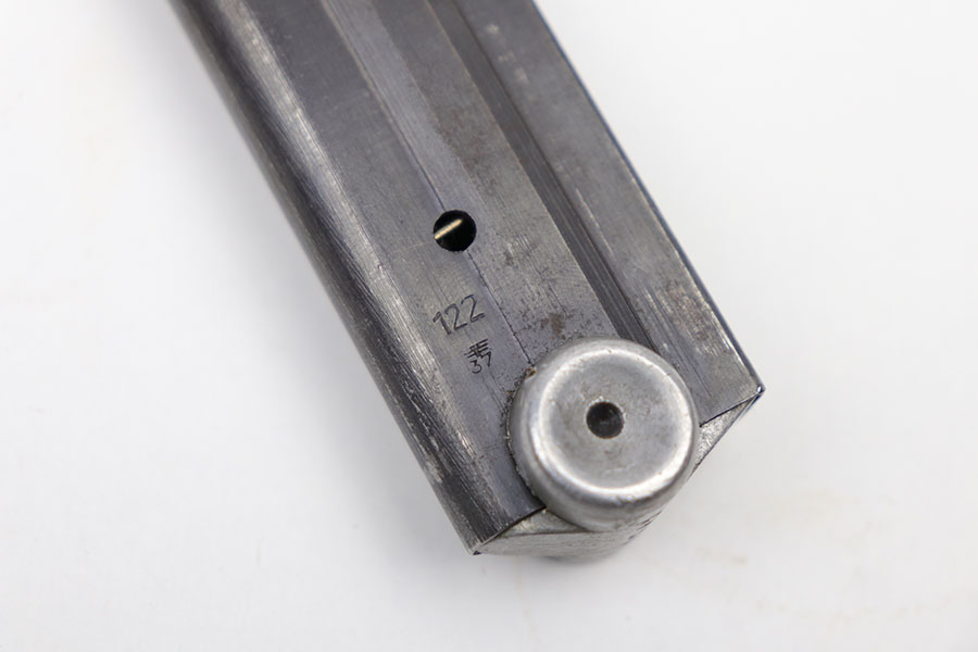 11/30/20 – This is an original 122 code Luger magazine from WW2. The blued body has some light finish loss but no rust or pitting. Strong fully functional spring. Aluminum base is serial numbered 6342b. Frame is 122 code stamped with two eagle/37 proofs.