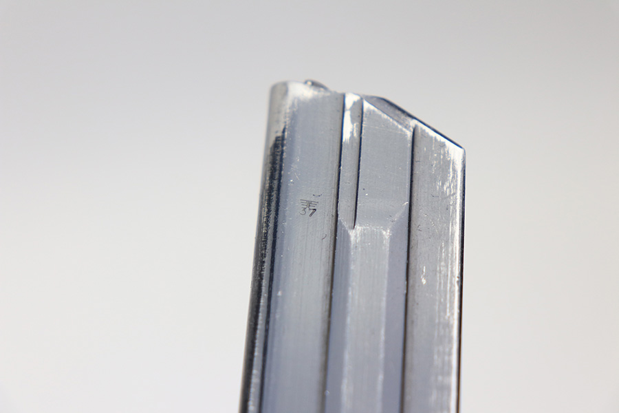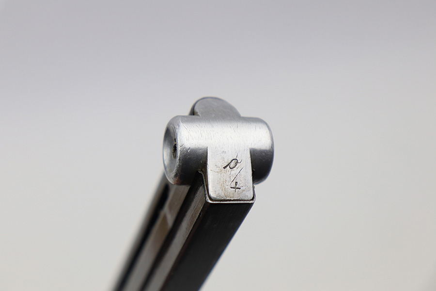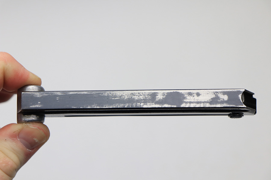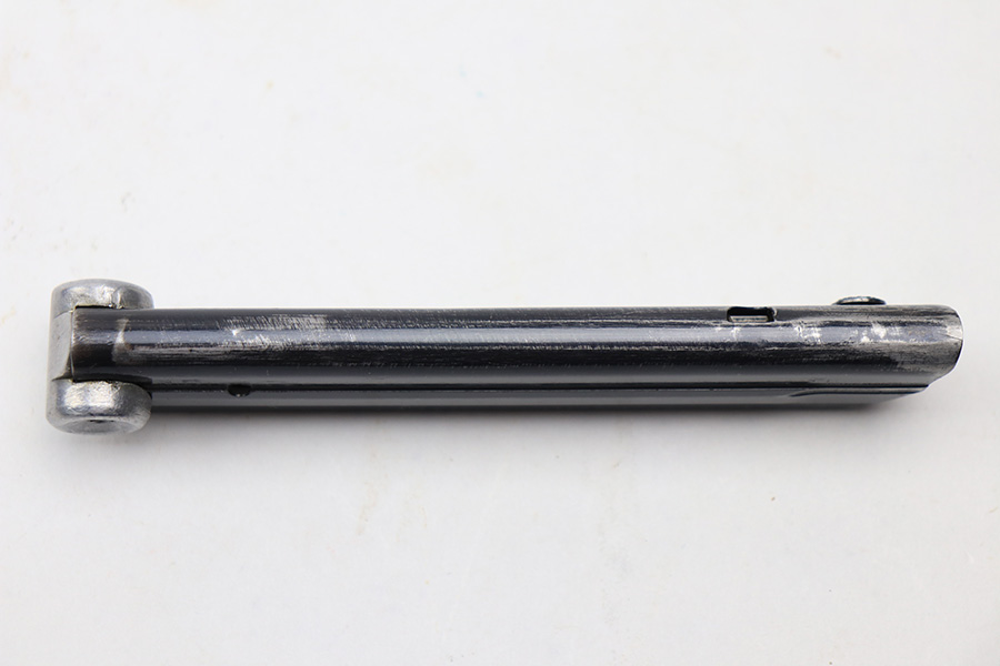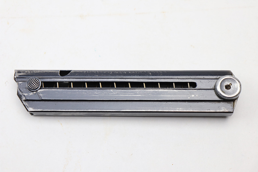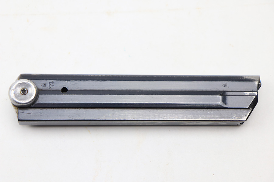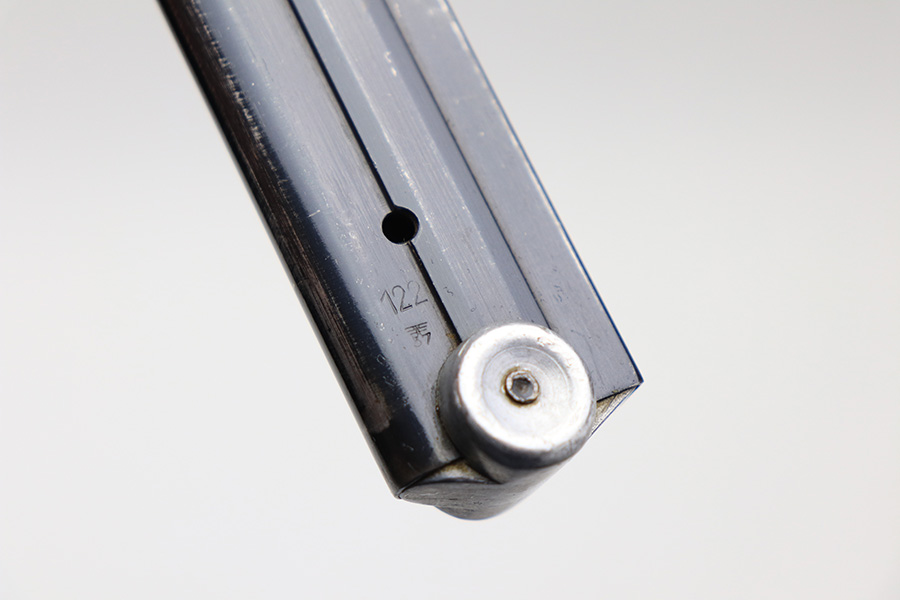 3/3/22 – This is an original 122 code Luger magazine made by Haenel during WW2. The magazine has great bluing throughout the tube, which has a “122” code stamp and two eagle 37 proof stamps. The aluminum base has no serial number, but unfortunately this is due to someone polishing or sanding off the original serial number. The “o” suffix remains, along with a “+” sign. The spring is strong and fully functional.