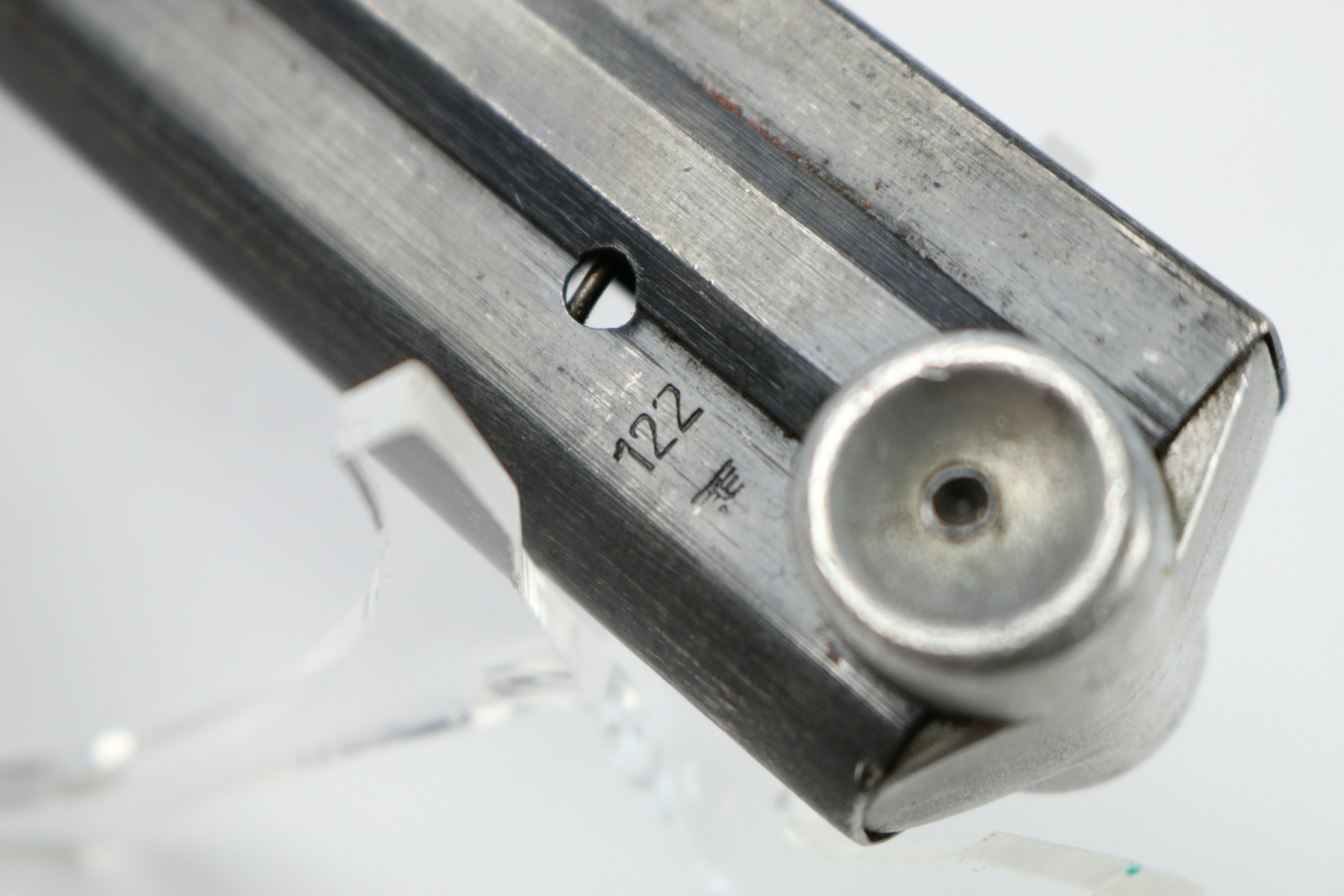 10/3/18 – This is an original “122” code Luger magazine with an aluminum base. The magazine is rare and desirable because the base has never been numbered. No signs of grinding / flattening on the base either. The frame has a “122” code and two eagle/37 proof stamps. I believe these were used for Lugers made between 1940 and 1942. Minimal wear on the tube, no rust or pitting. Guaranteed original and authentic.