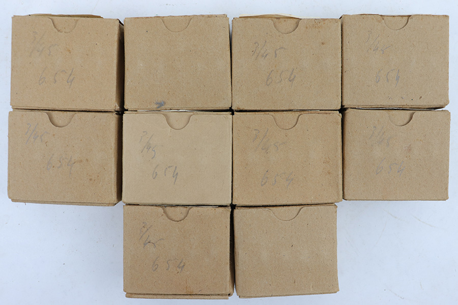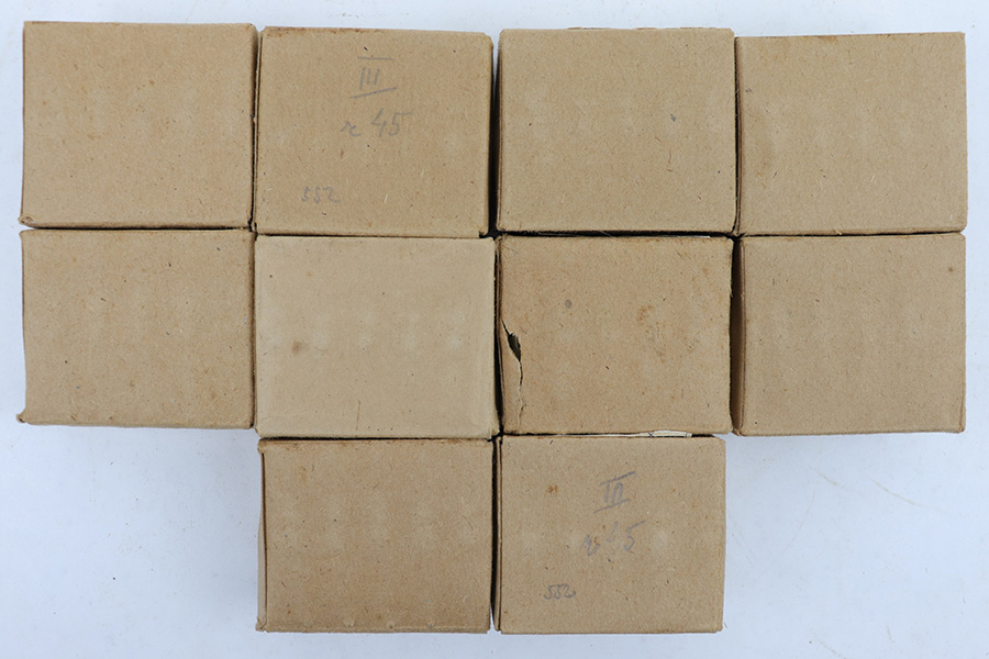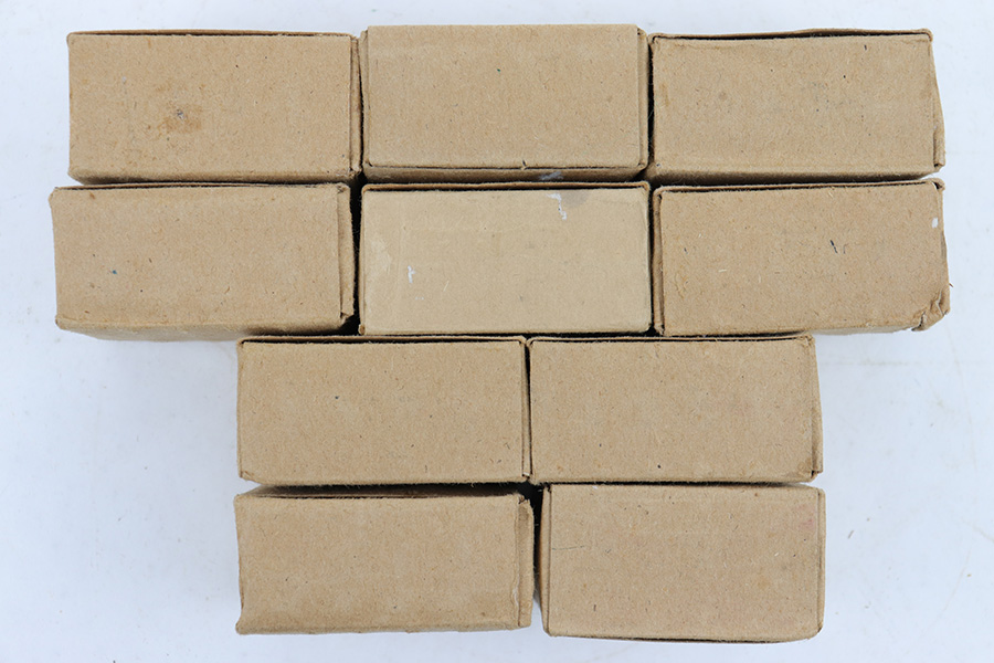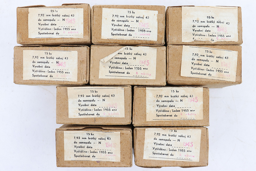 4/17/23 – This is 1945 vintage 8mm Kurz (7.92x33mm) ammunition. There are 10 boxes of 15 rounds each, total of 150 rounds. All rounds are in excellent condition in the original box as shown. A few boxes have some surface wear and rips / damage but most are in great shape. This is rare ammunition and functions great with STG44 / MP44 assault rifles.