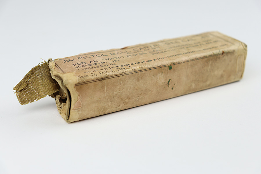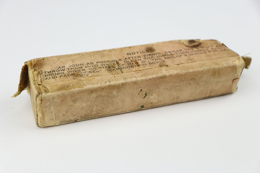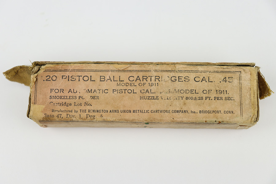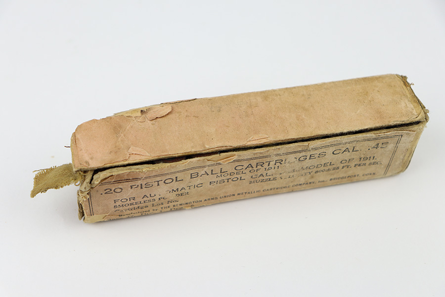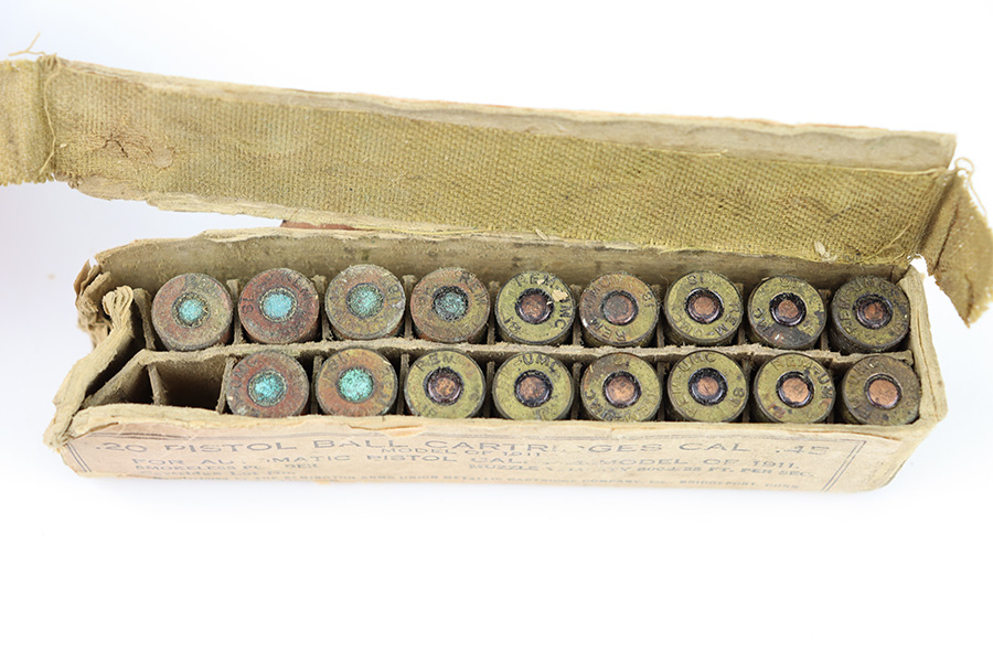 9/28/23 – This is an original box of .45 caliber pistol ammunition. The ammo comes in the original box, with 17 rounds total. The ammo shows aging and surface corrosion throughout. Head stamped REM-UMC 18.