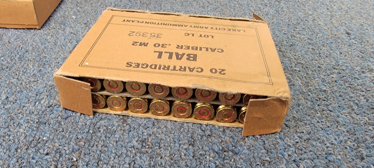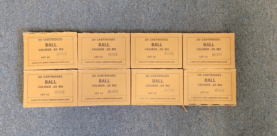 8/23/23 – This is 180 rounds of vintage .30-06 military surplus ammunition by Lake City Army Ammunition. The ammo is in the original boxes, all labeled with the same lot number. The rounds are in excellent condition, but some of the boxes are tattered and missing portions, but mostly intact. Note that 1 box of 20 rounds isn’t shown in photos, but included.